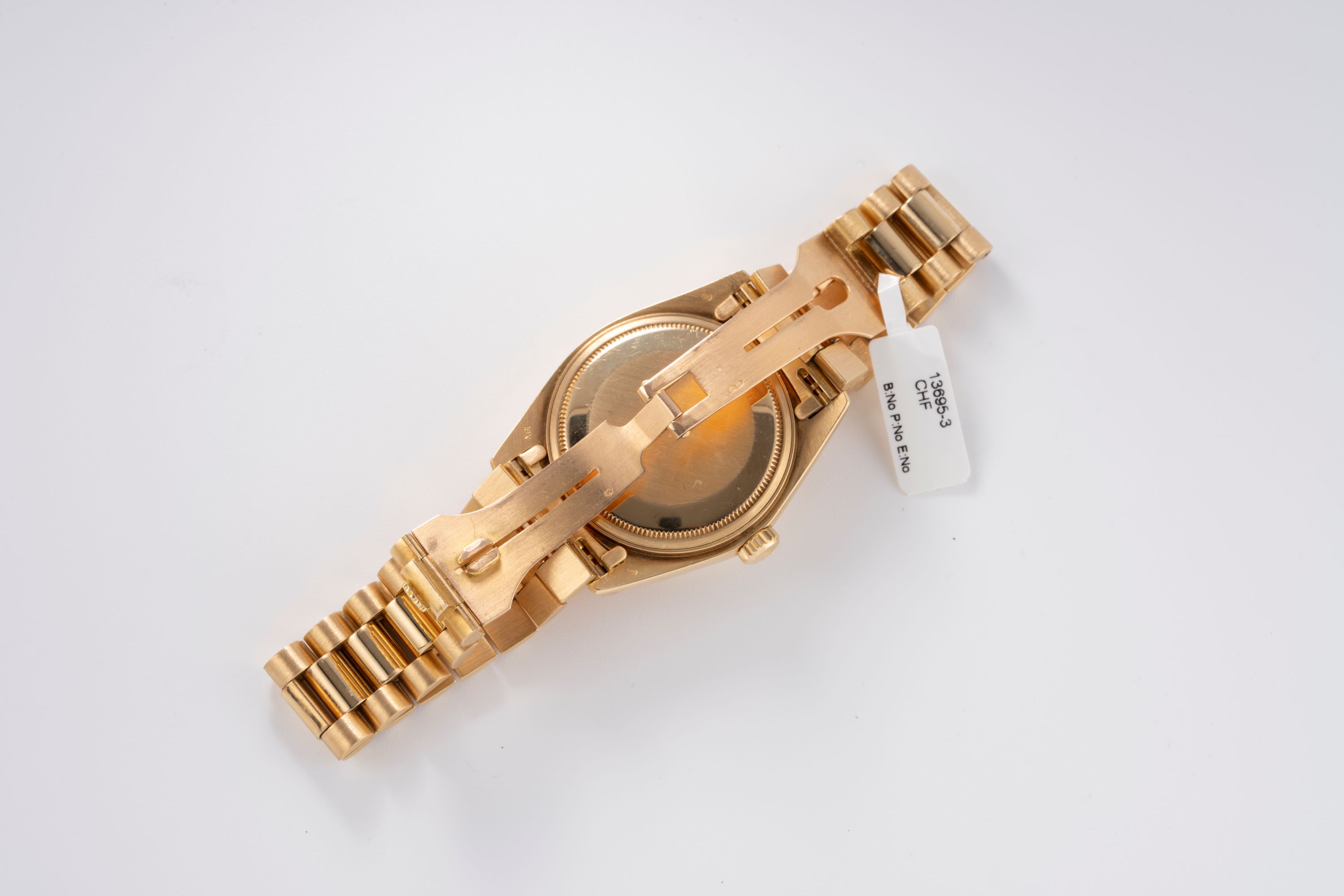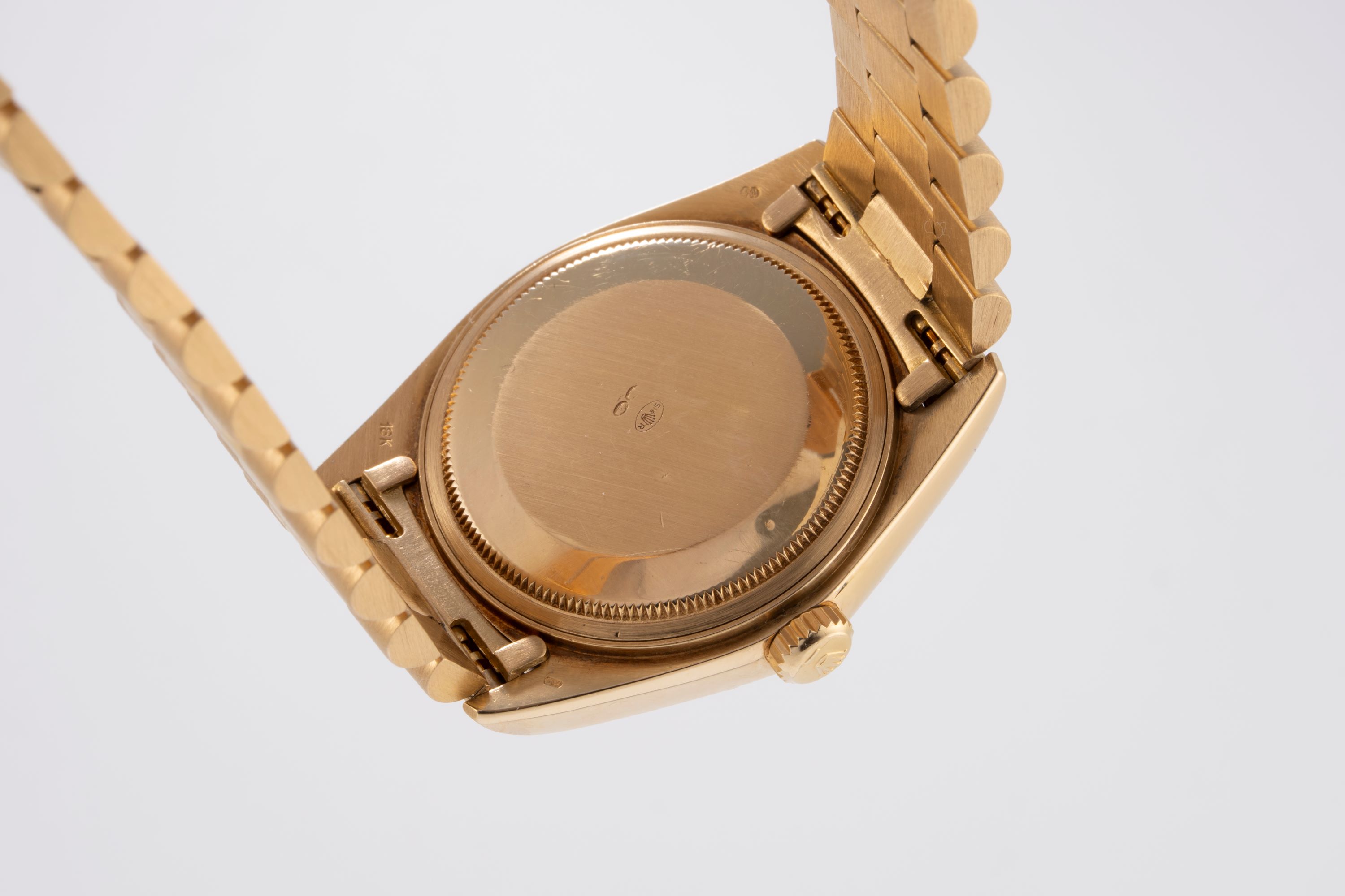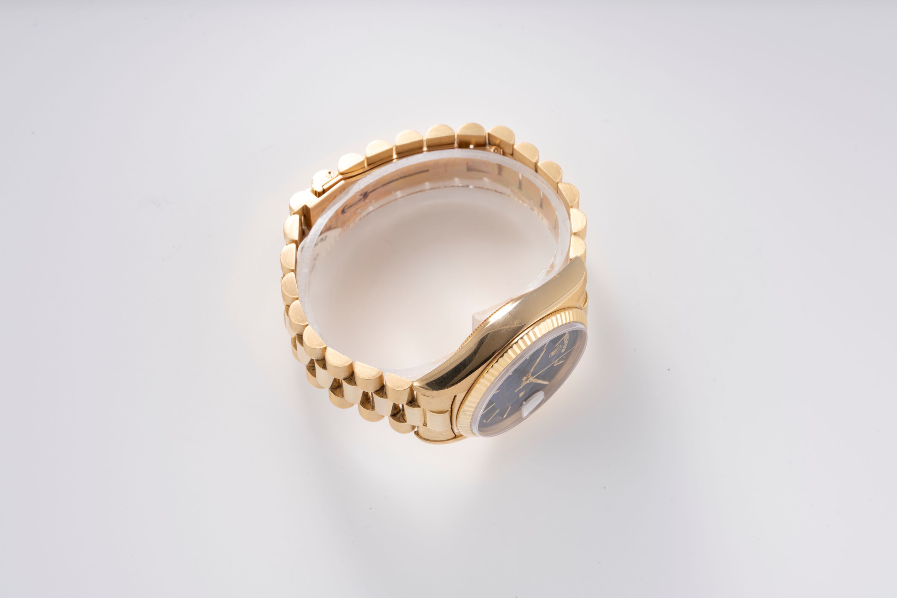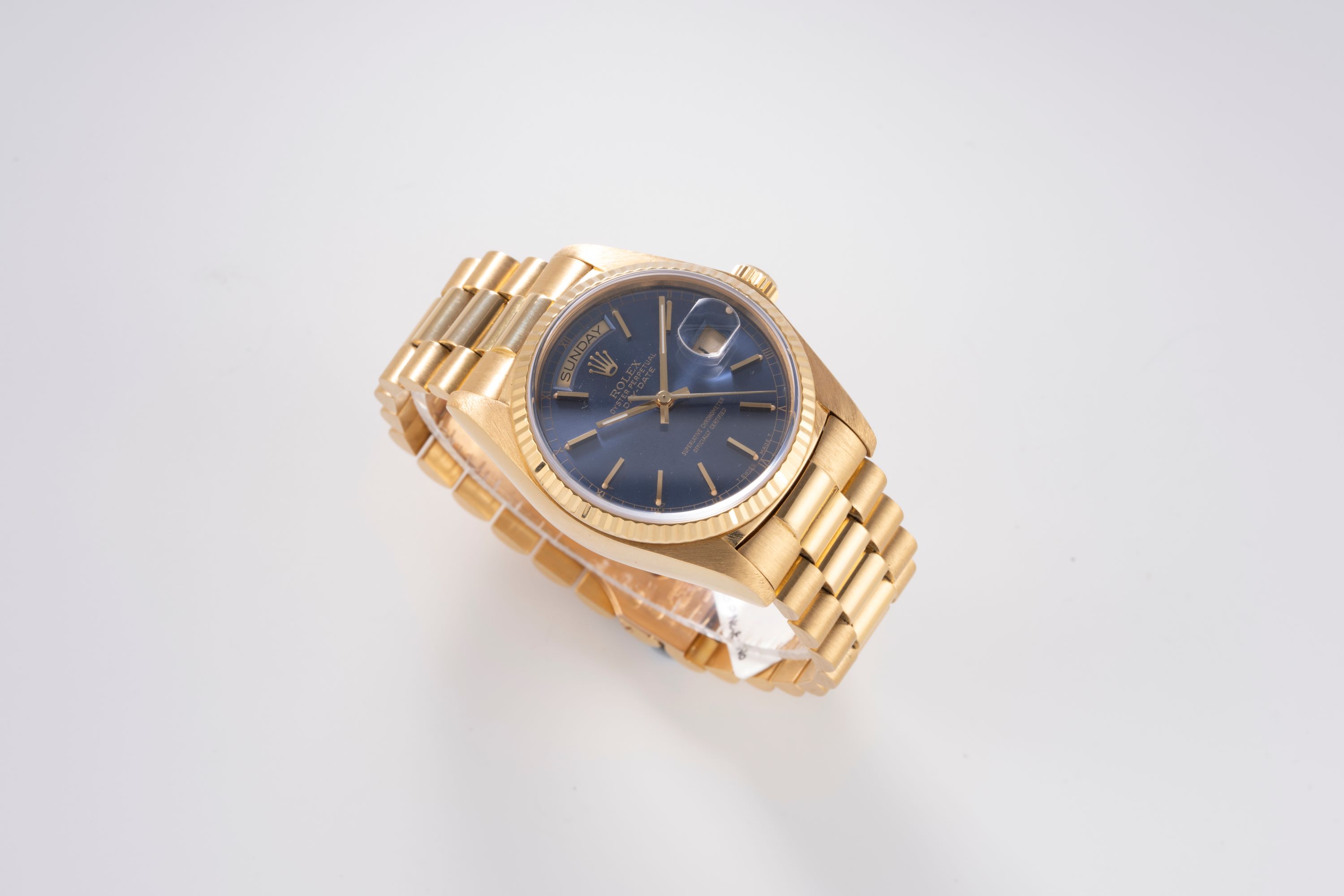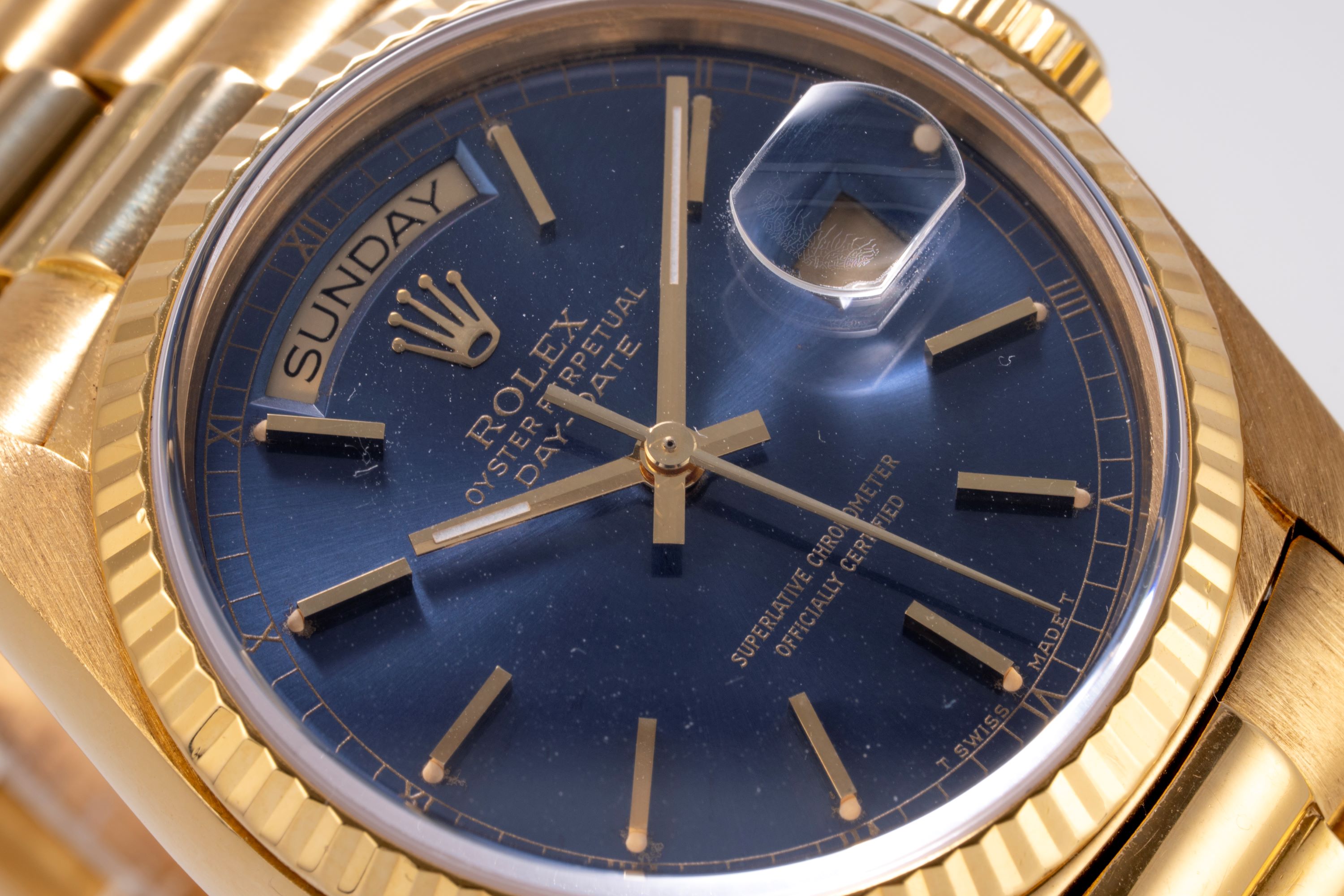DialBlue sunburst dial with applied gold indices, gold hands, day window at 12 o'clock, date window at 3 o'clock, signed 'Rolex' 12 o'clock