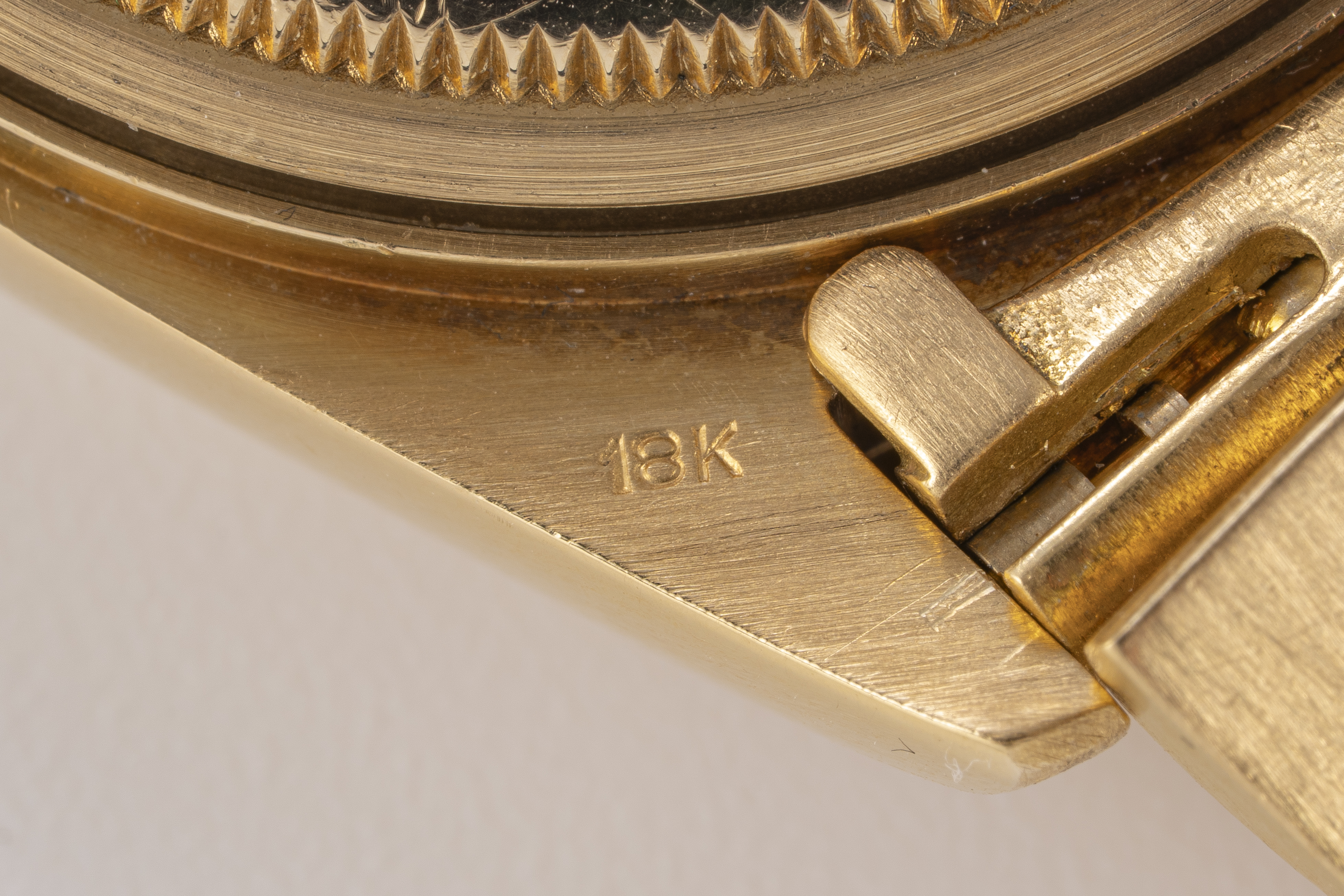 CaseRound case in 18k yellow gold with fluted bezel, crown at 3 o'clock, solid caseback