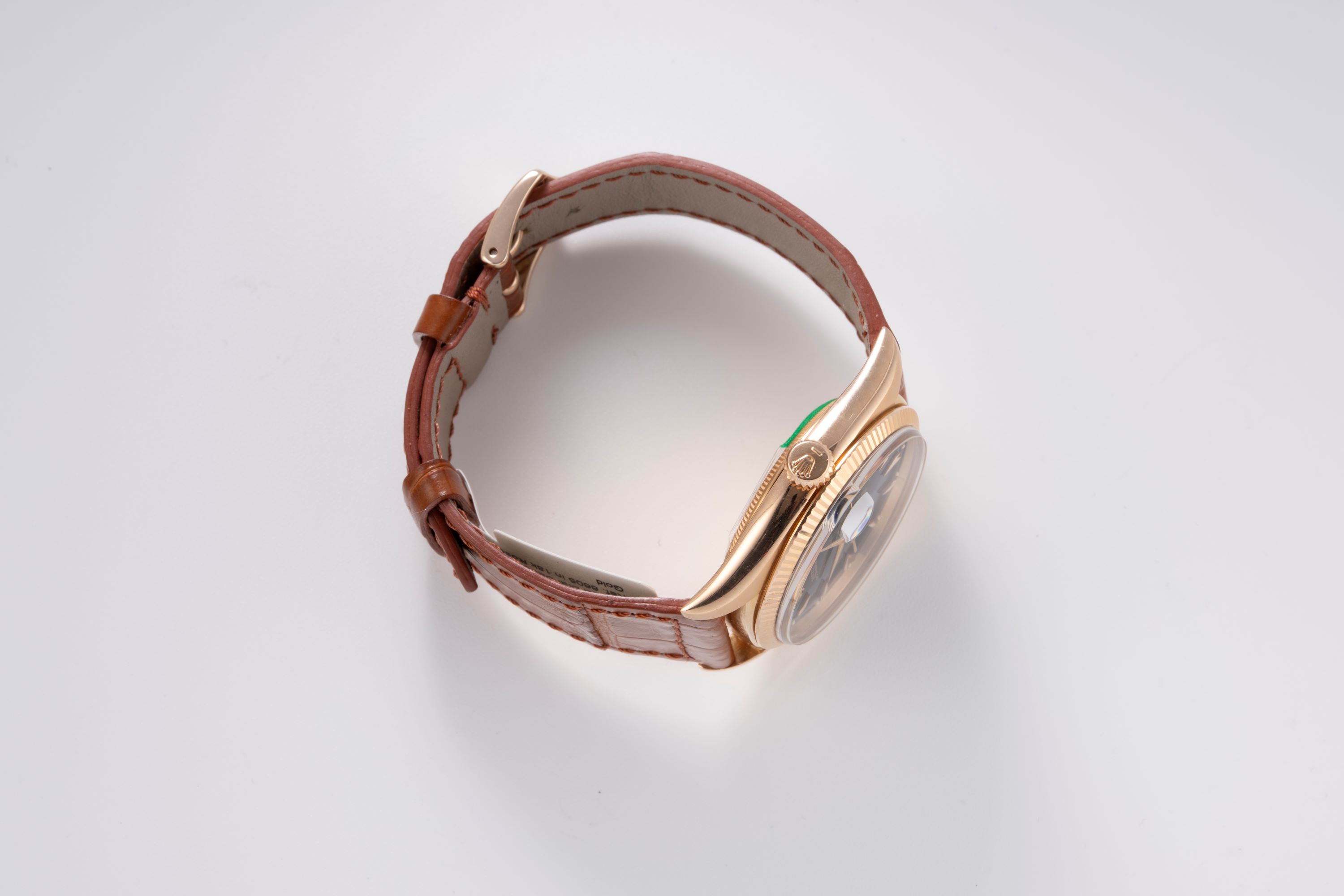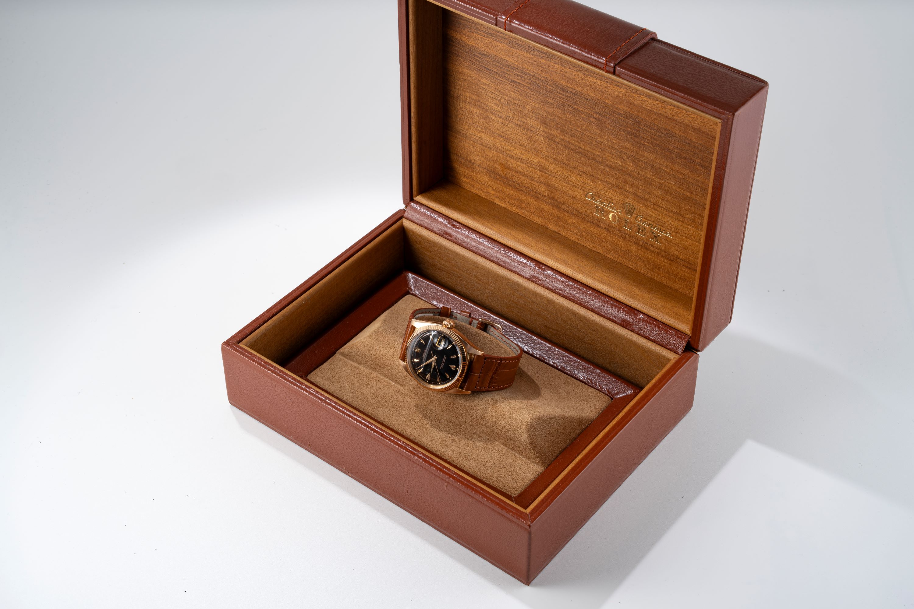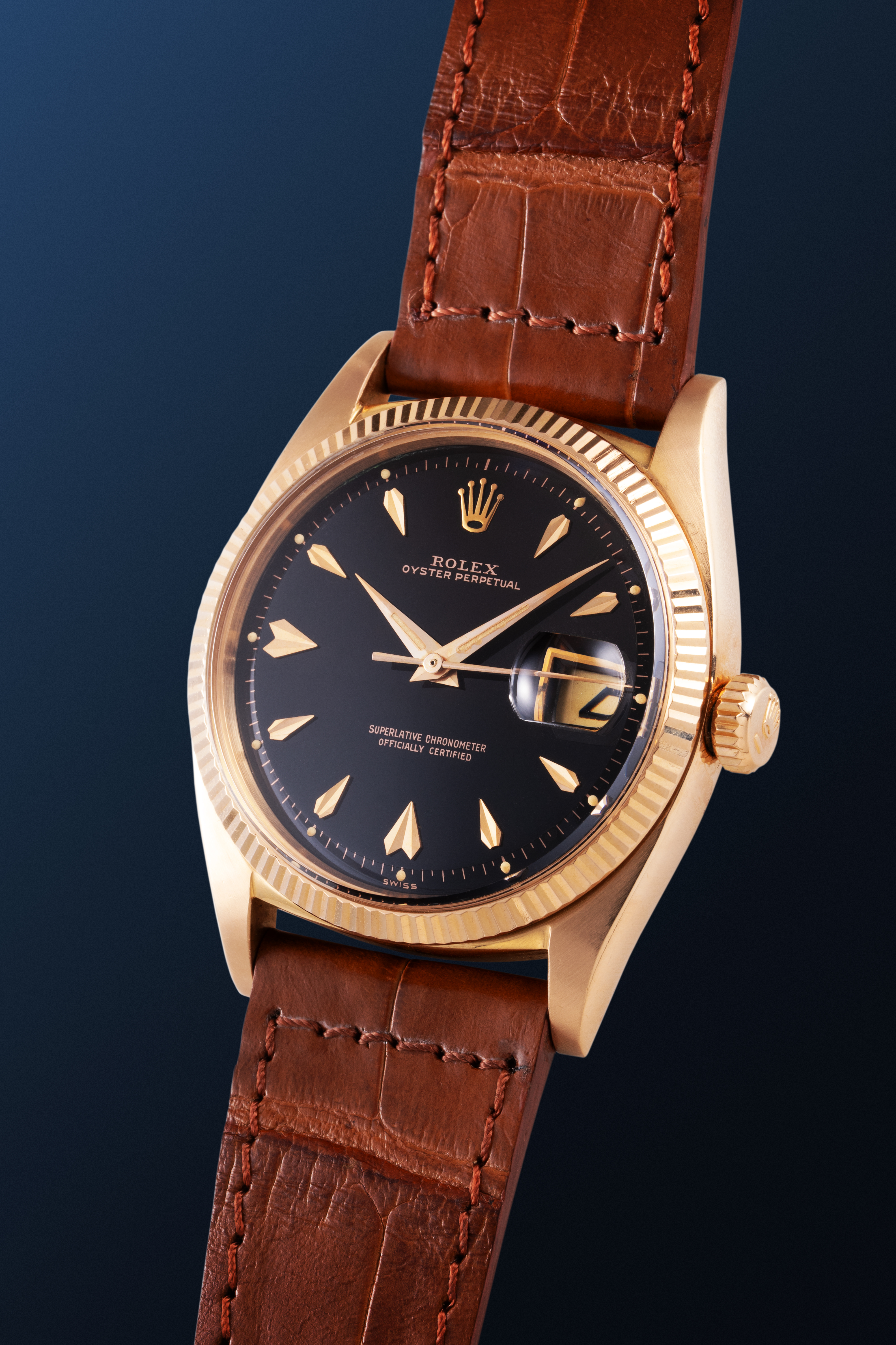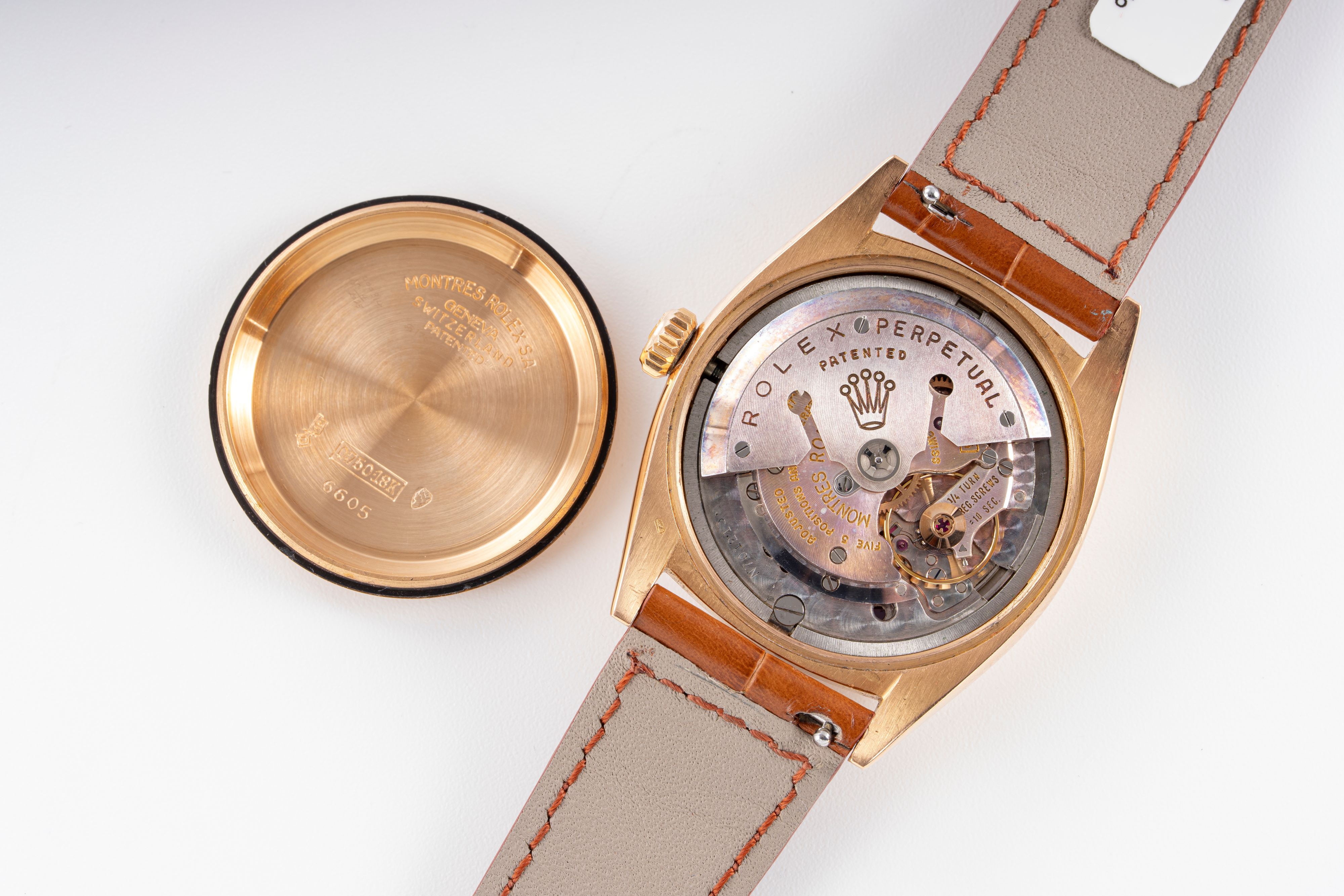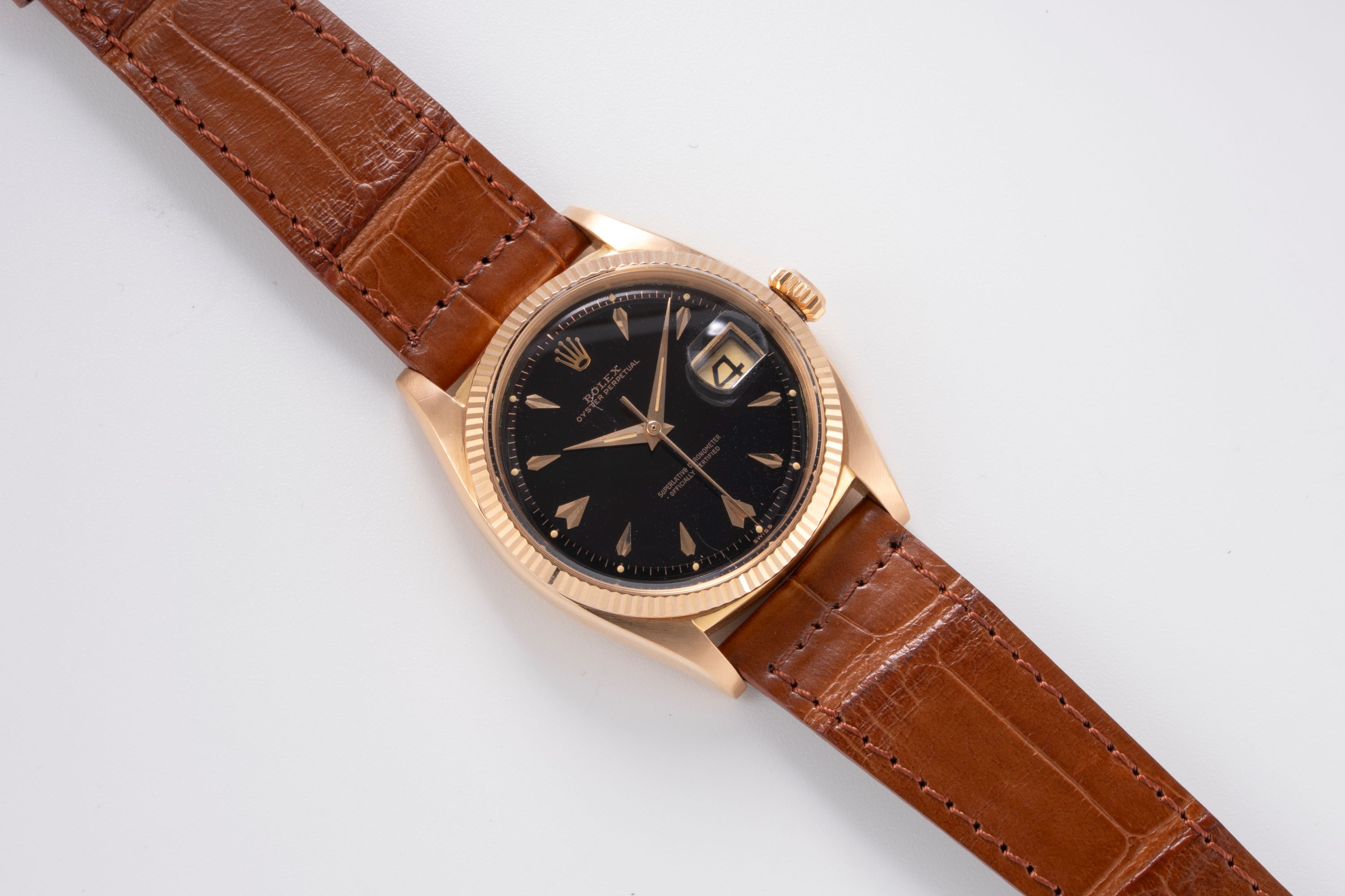 DialBlack lacquer dial with rose gold indices, rose gold hands, date window at 3 o'clock, signed 'Rolex' at 12 o'clock