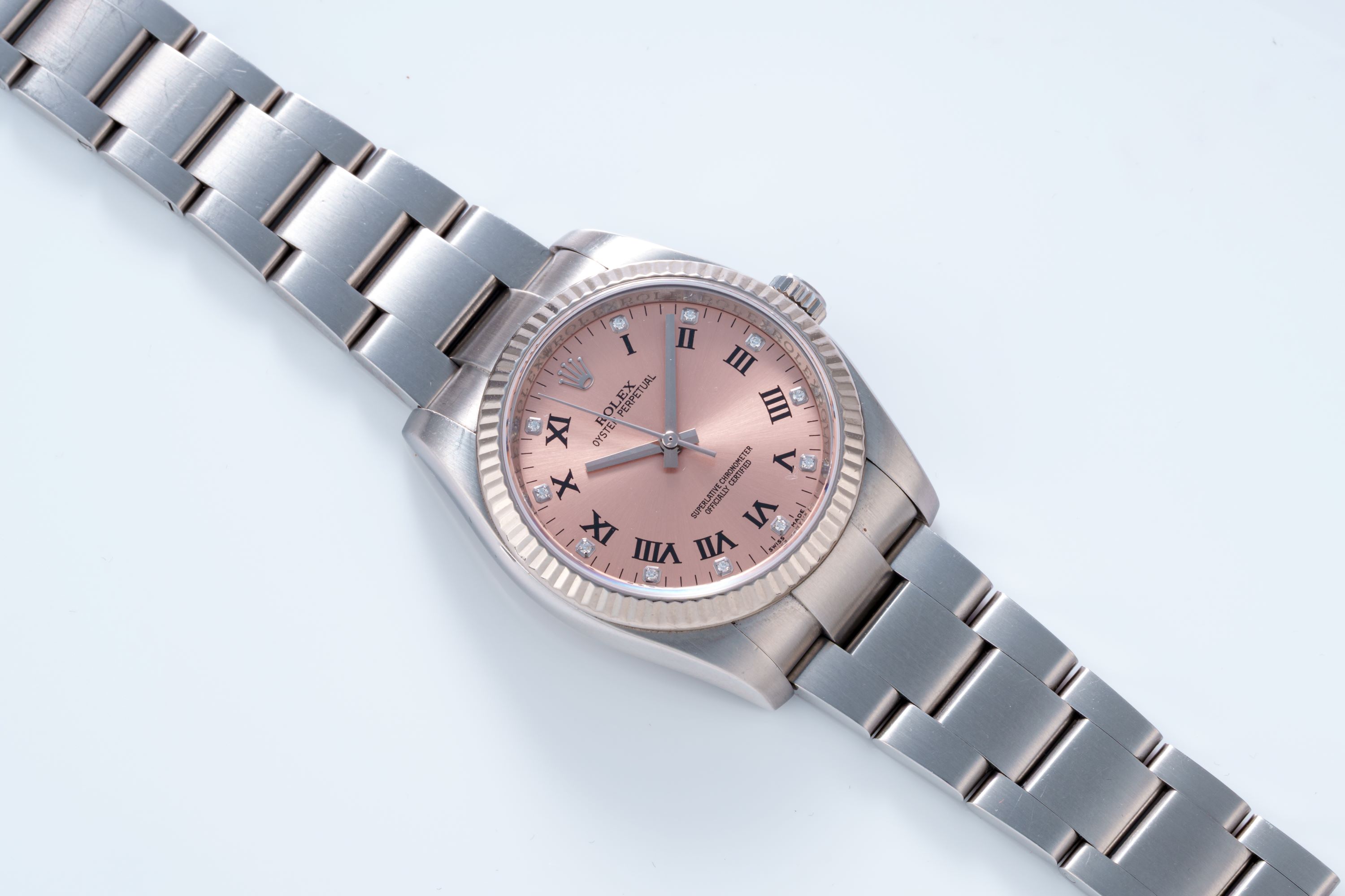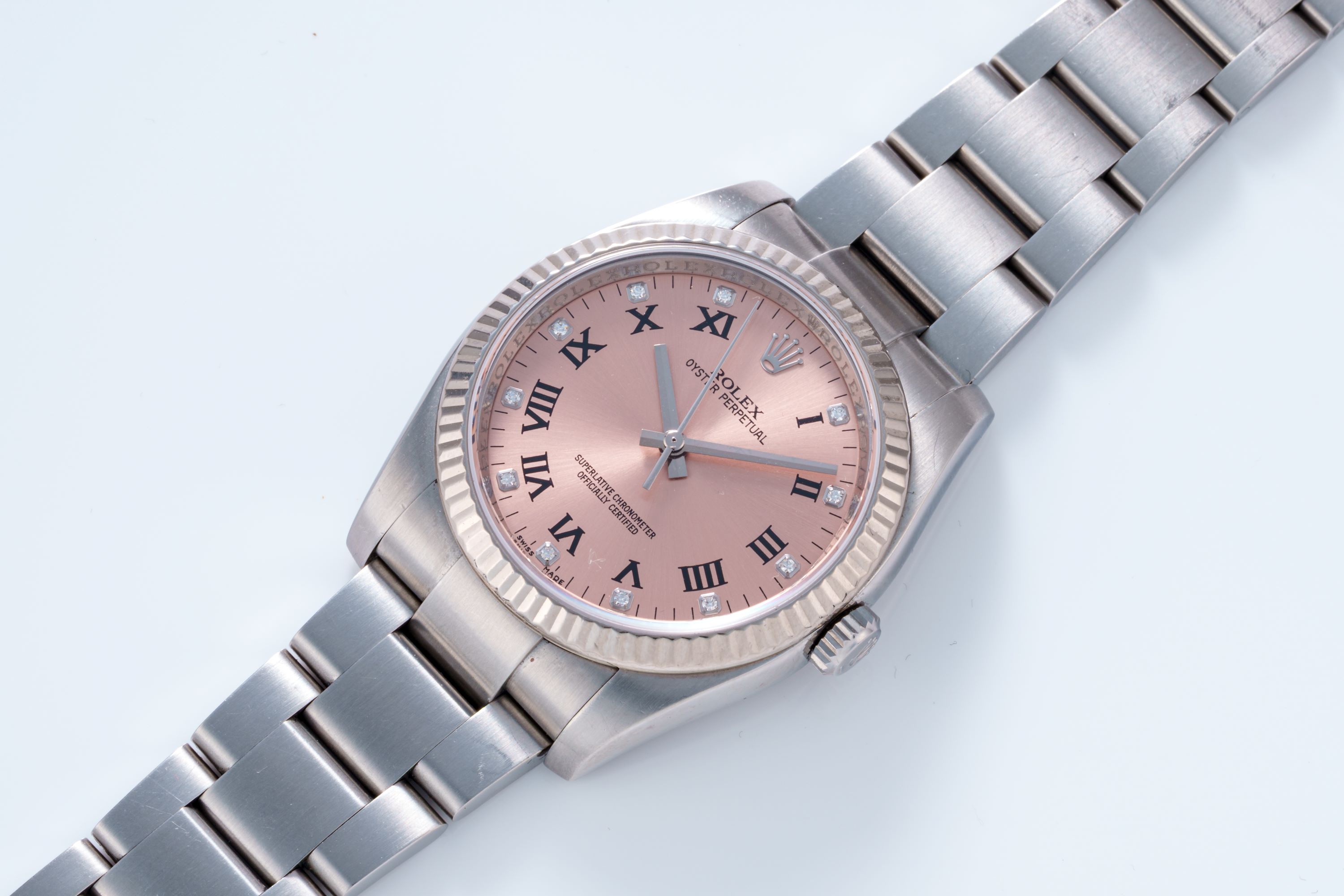 DialSalmon dial with Roman numerals, diamond indices, white gold hands, signed 'Rolex' at 12 o'clock
