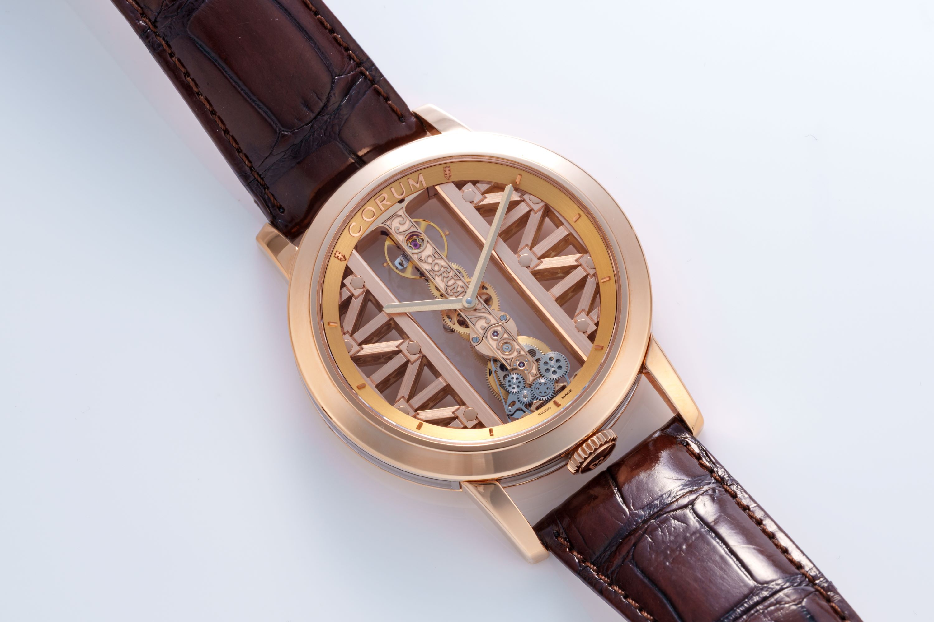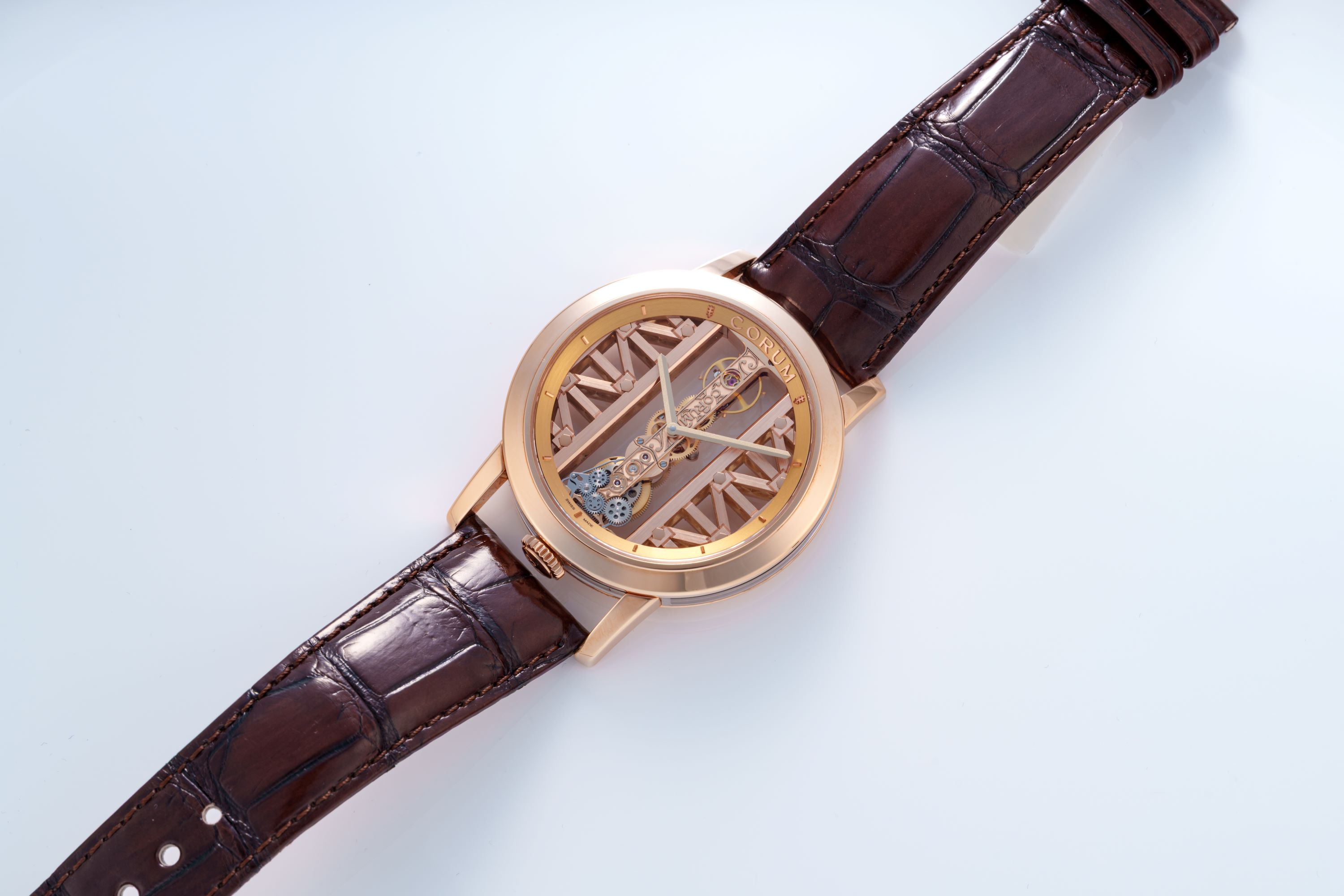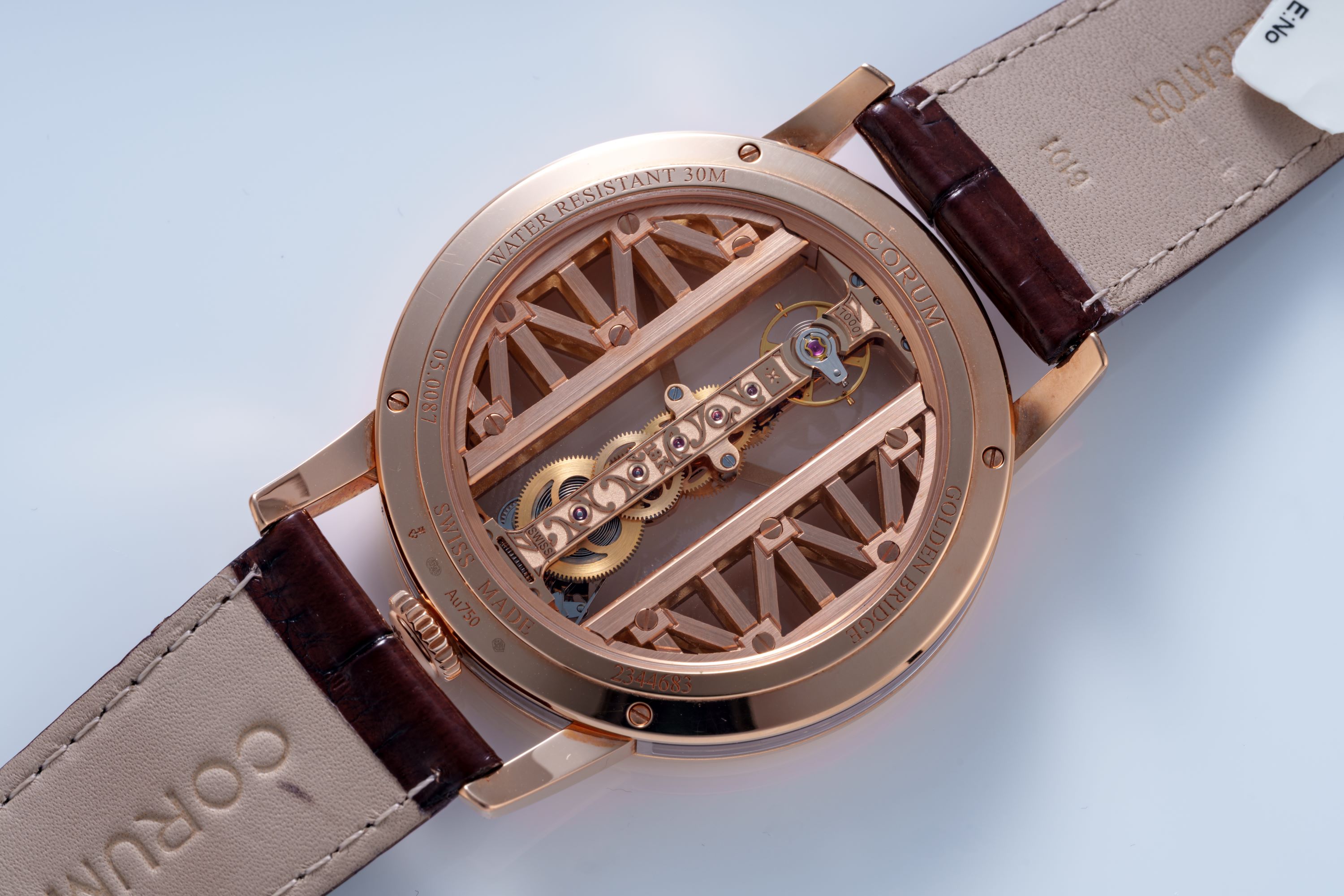 DialOpenworked dial with vertical movement architecture, gold hands, signed 'Corum' at 12 o'clock