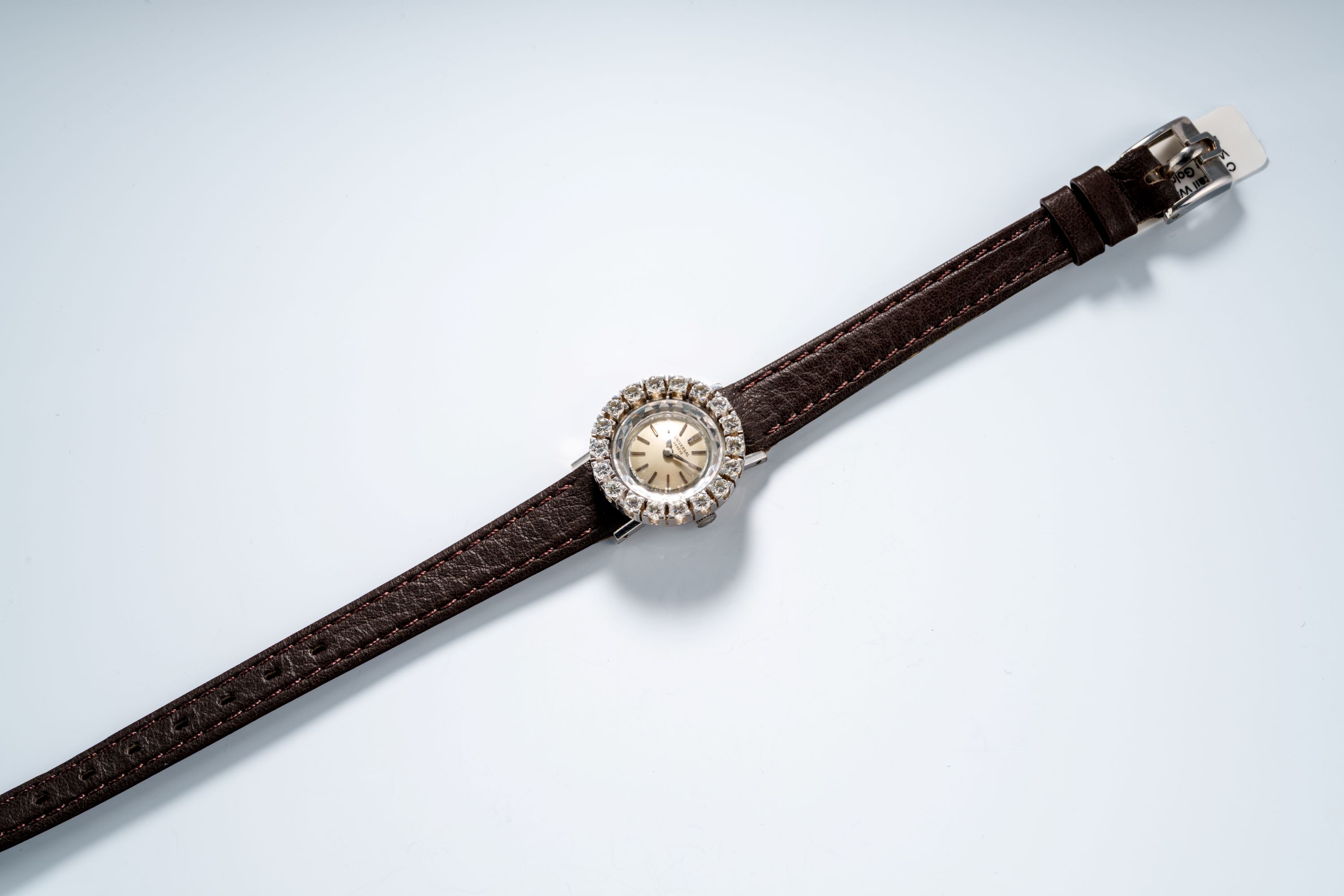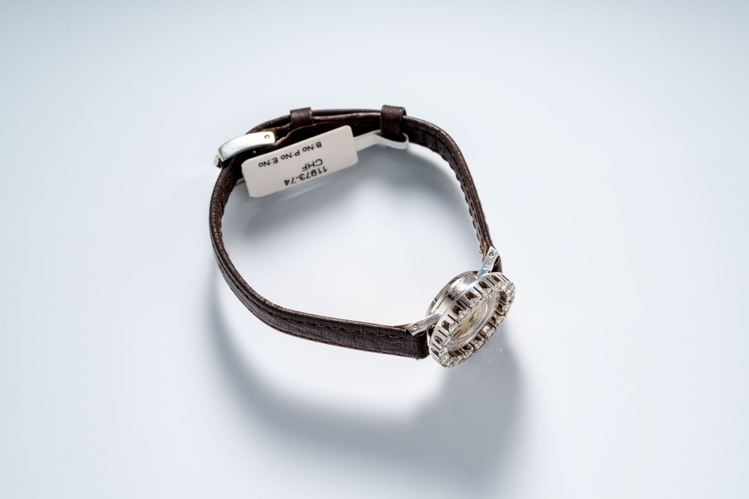 CaseRound case in 18k white gold with diamond bezel, winding crown at 3 o'clock, solid caseback