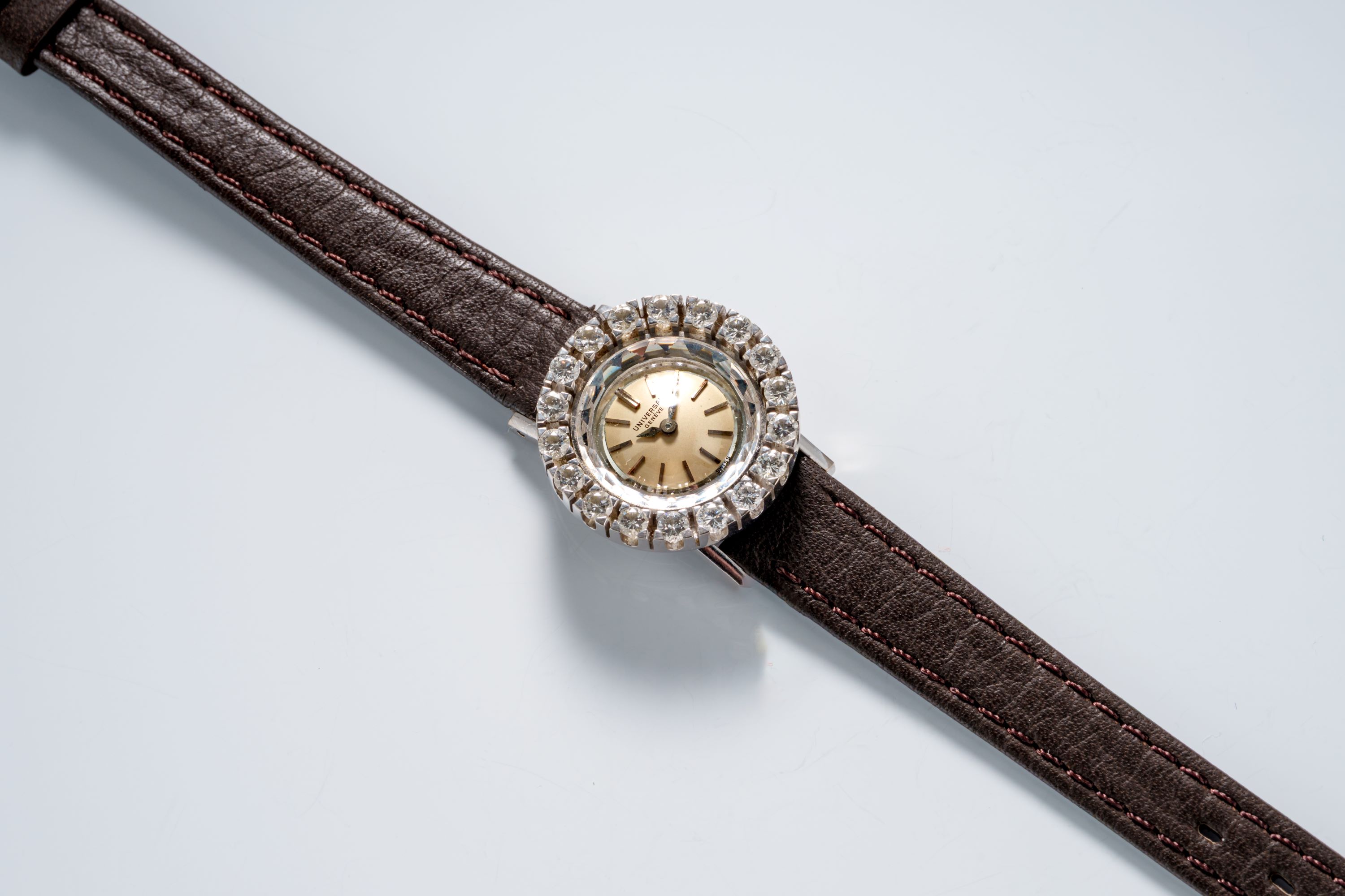 DialSilver dial with applied indices, white gold hands, signed 'Universal Genève' at 12 o'clock, facetted crystal