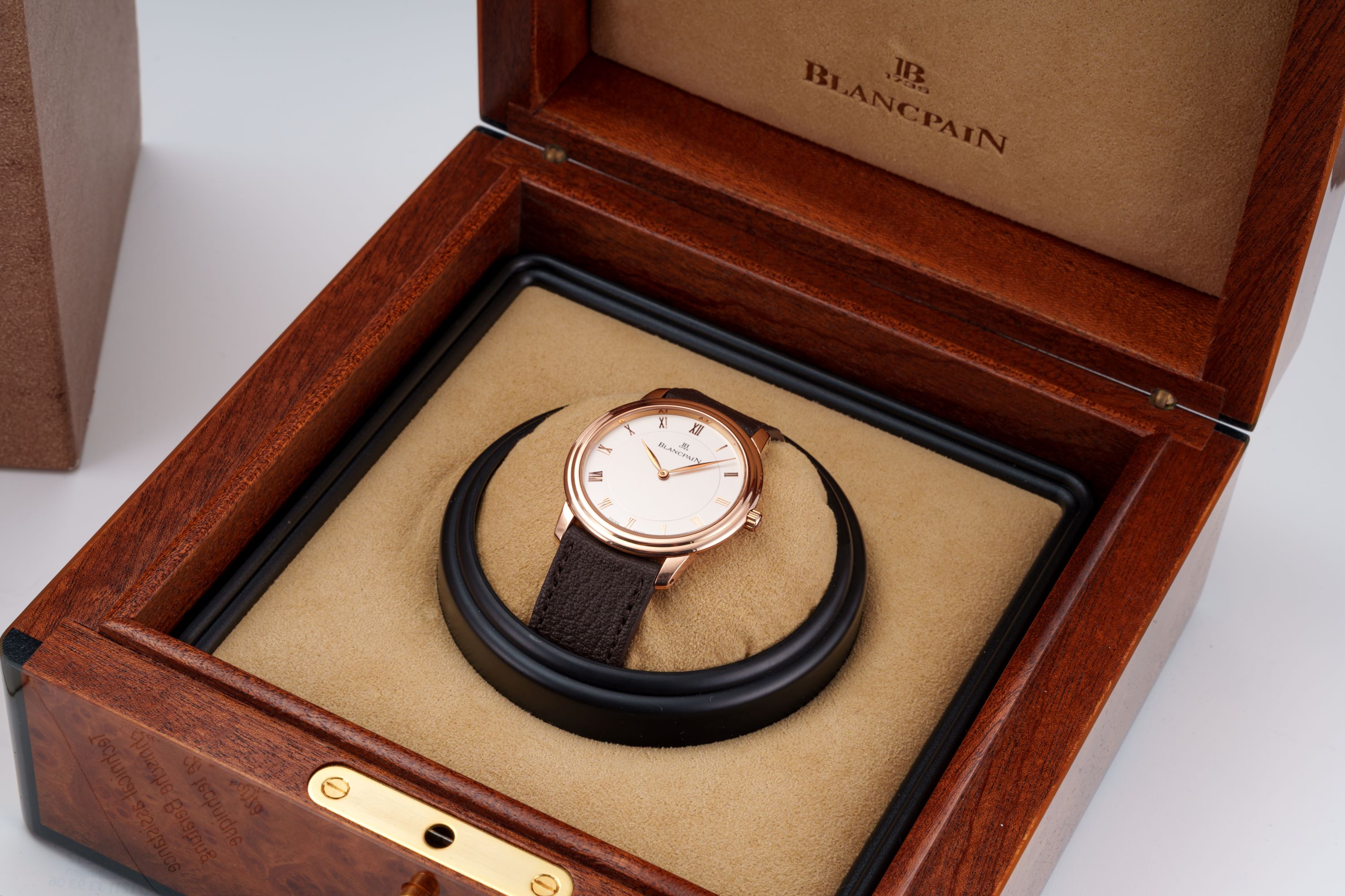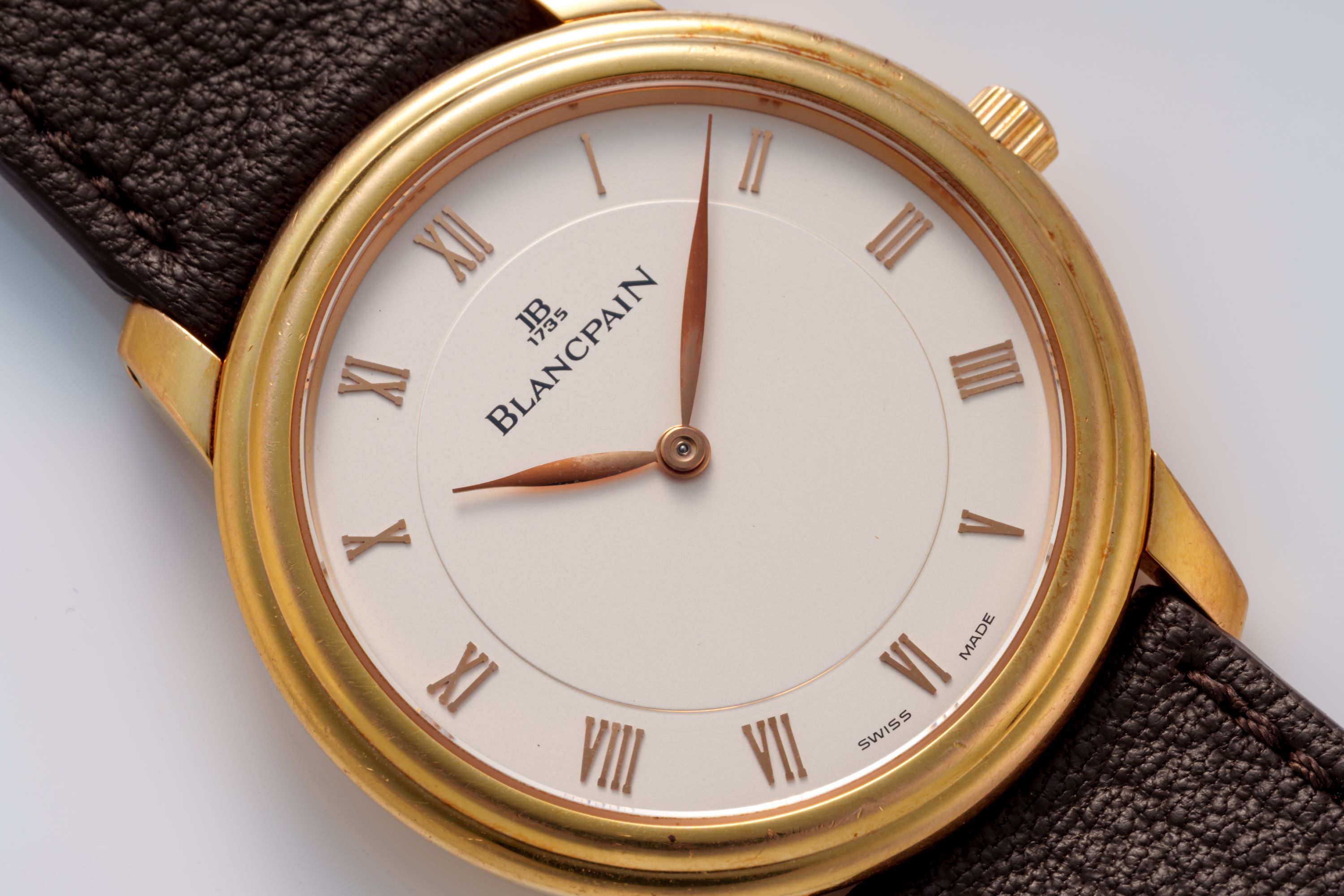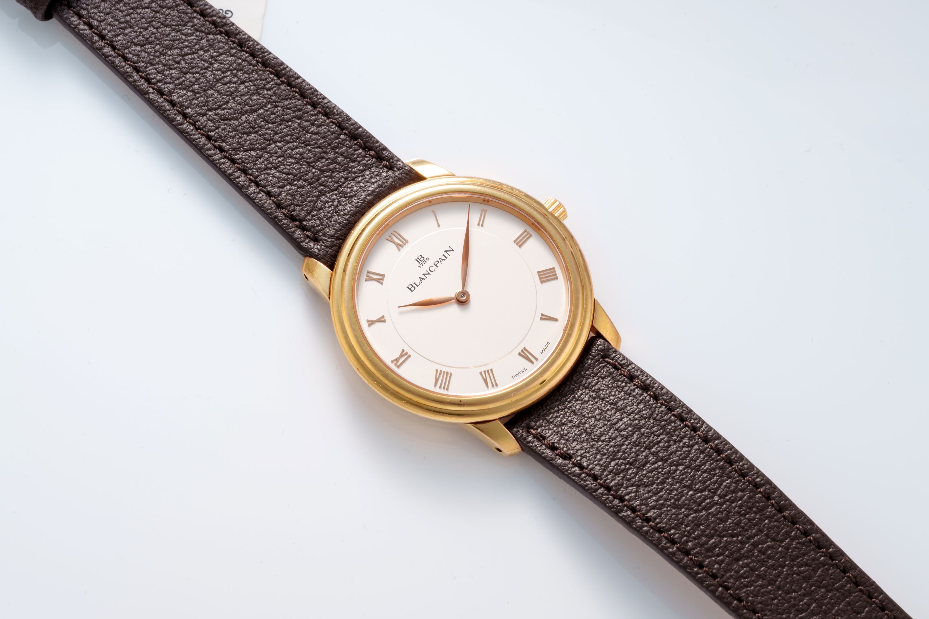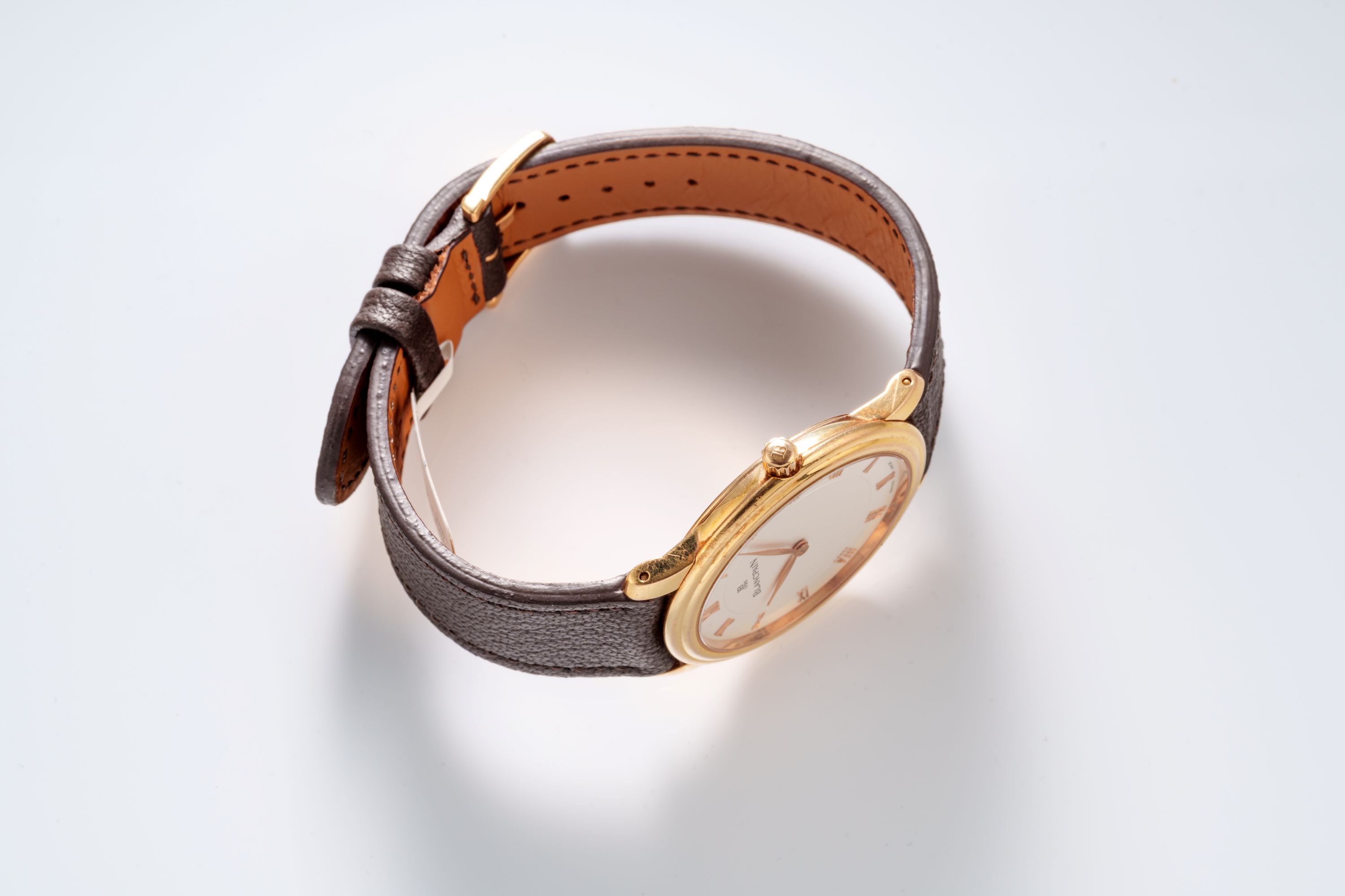 DialSilver-white dial with applied Roman numerals, gold leaf hands, signed 'Blancpain' at 12 o'clock