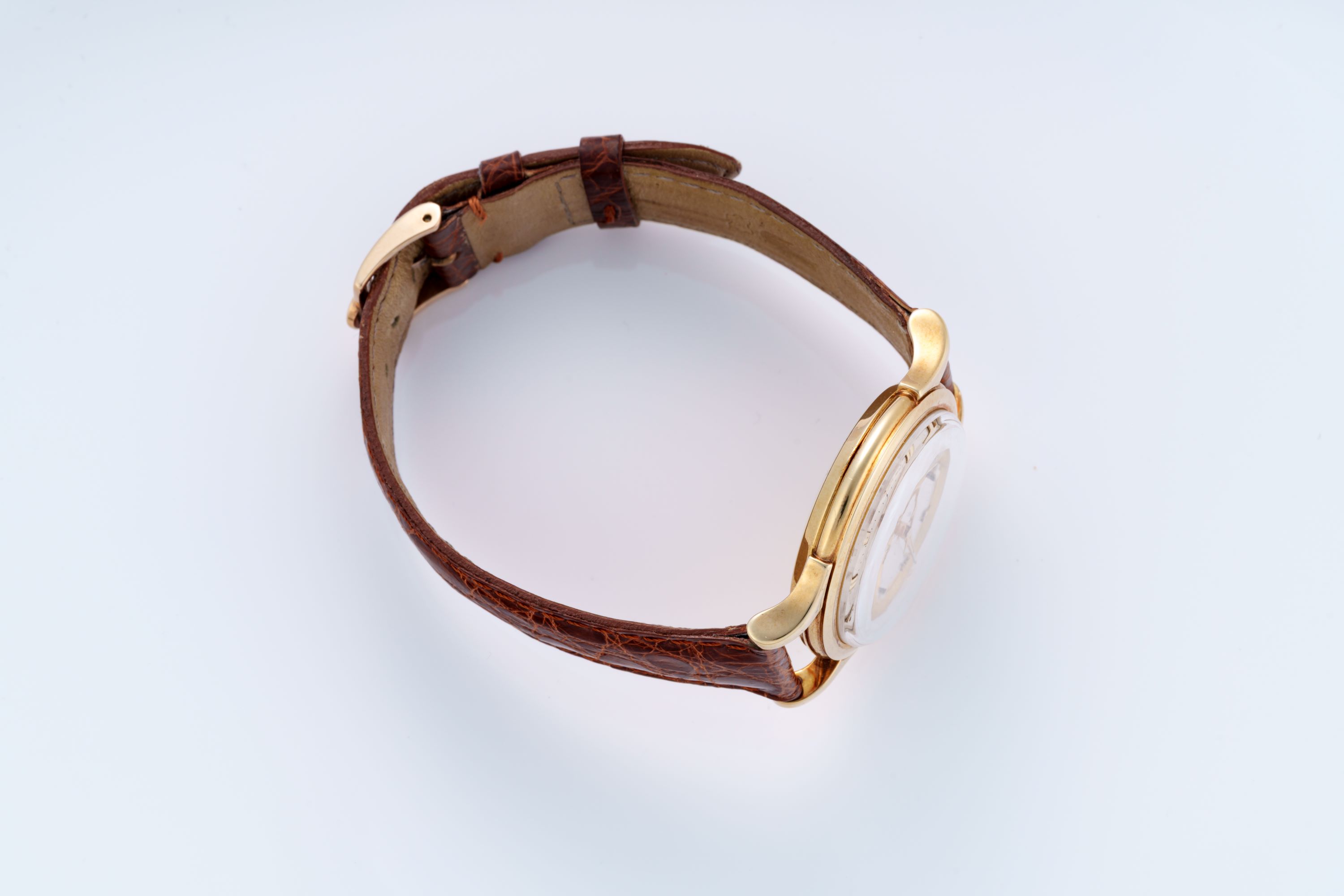 CaseRound case in 14k yellow gold with crown at 3 o'clock, fancy lugs, solid caseback