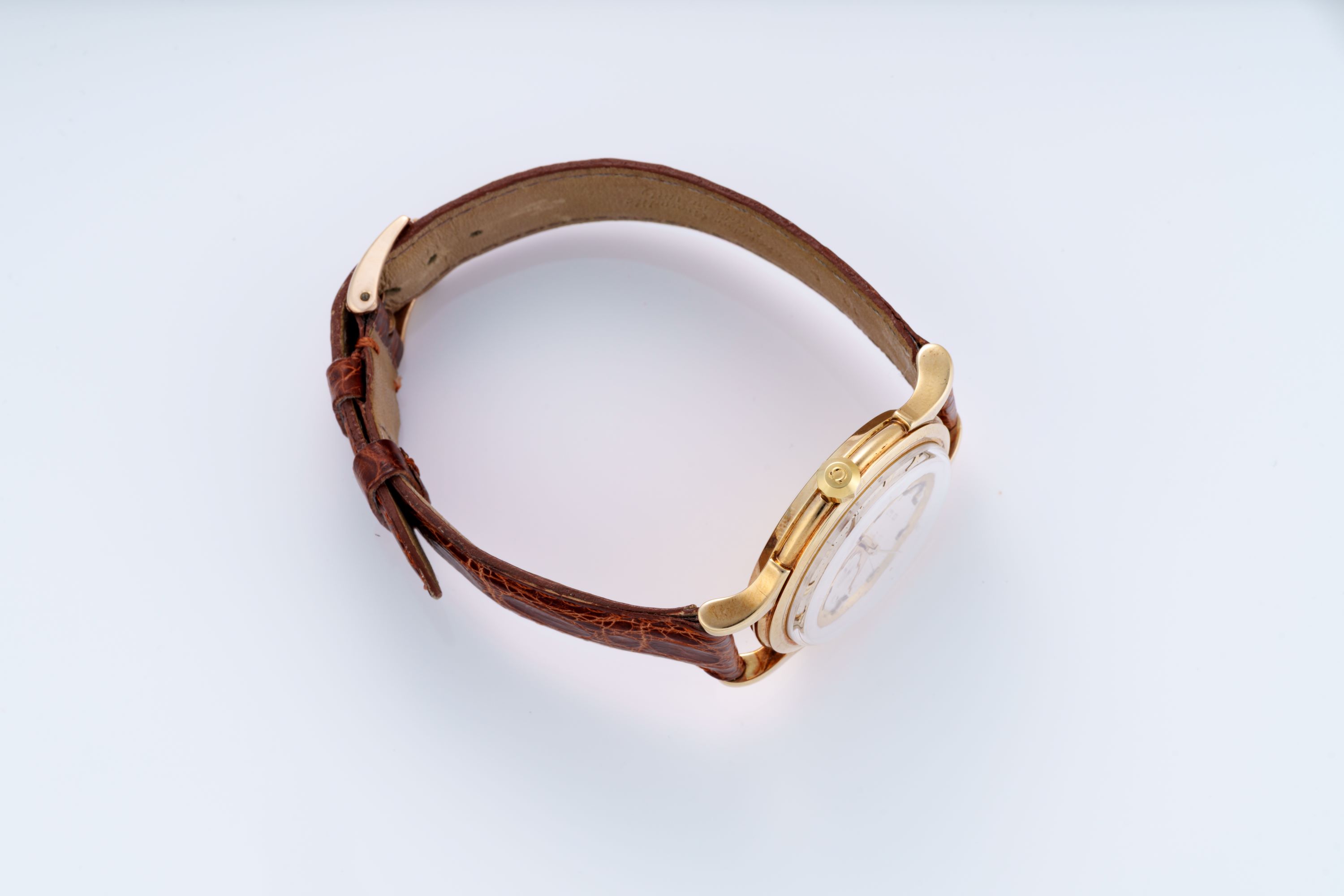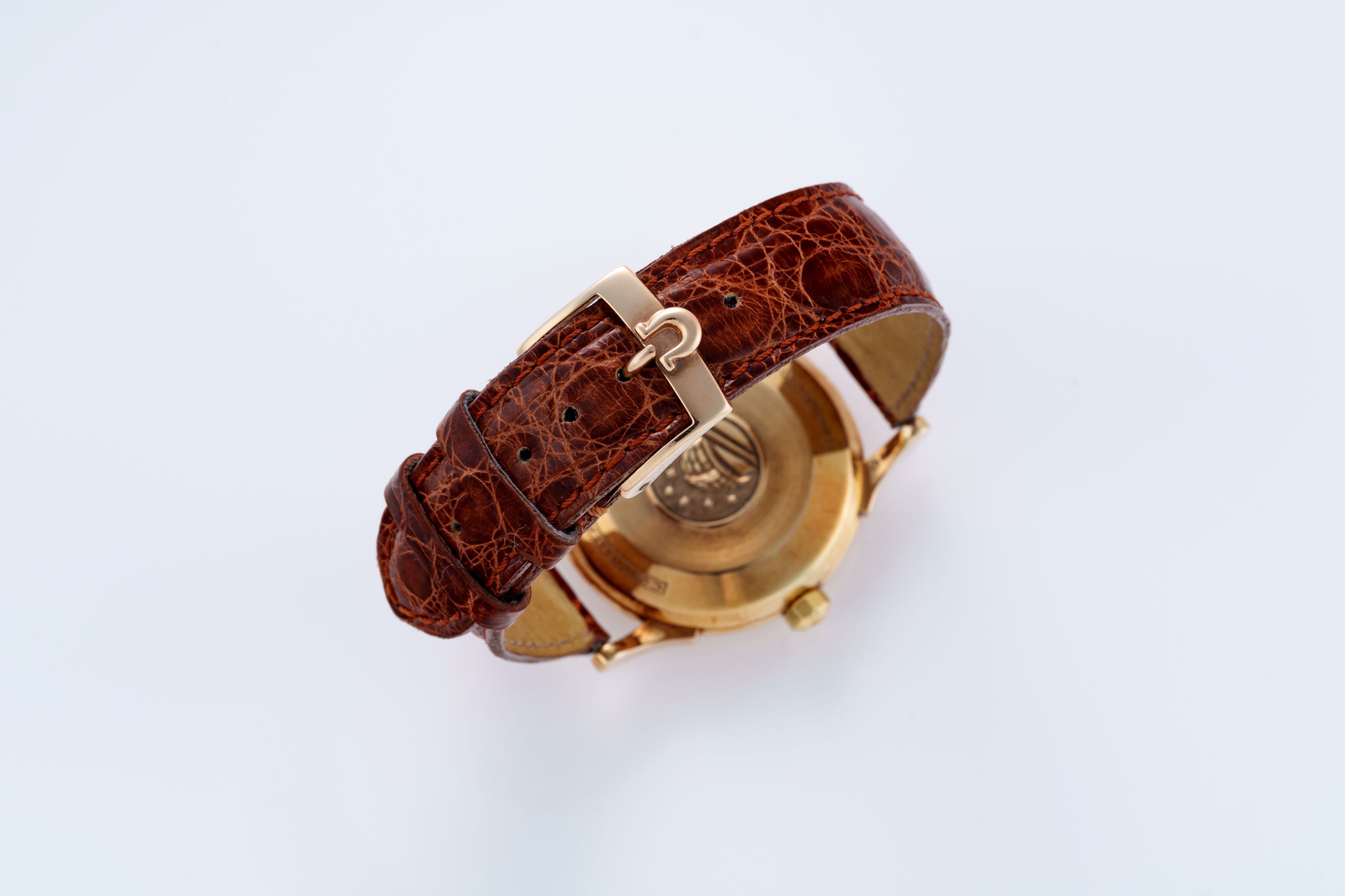 StrapBrown alligator leather strap with Omega pin buckle in 18k yellow gold