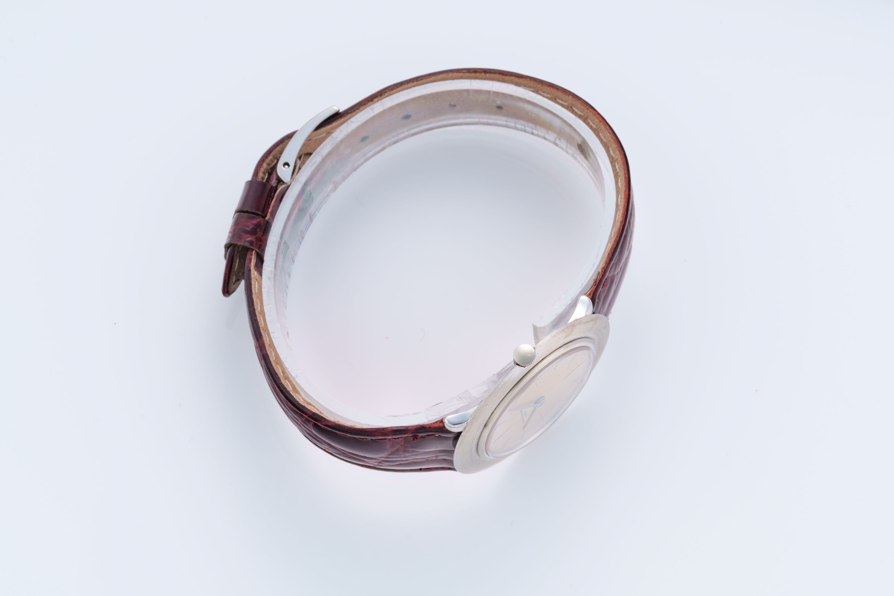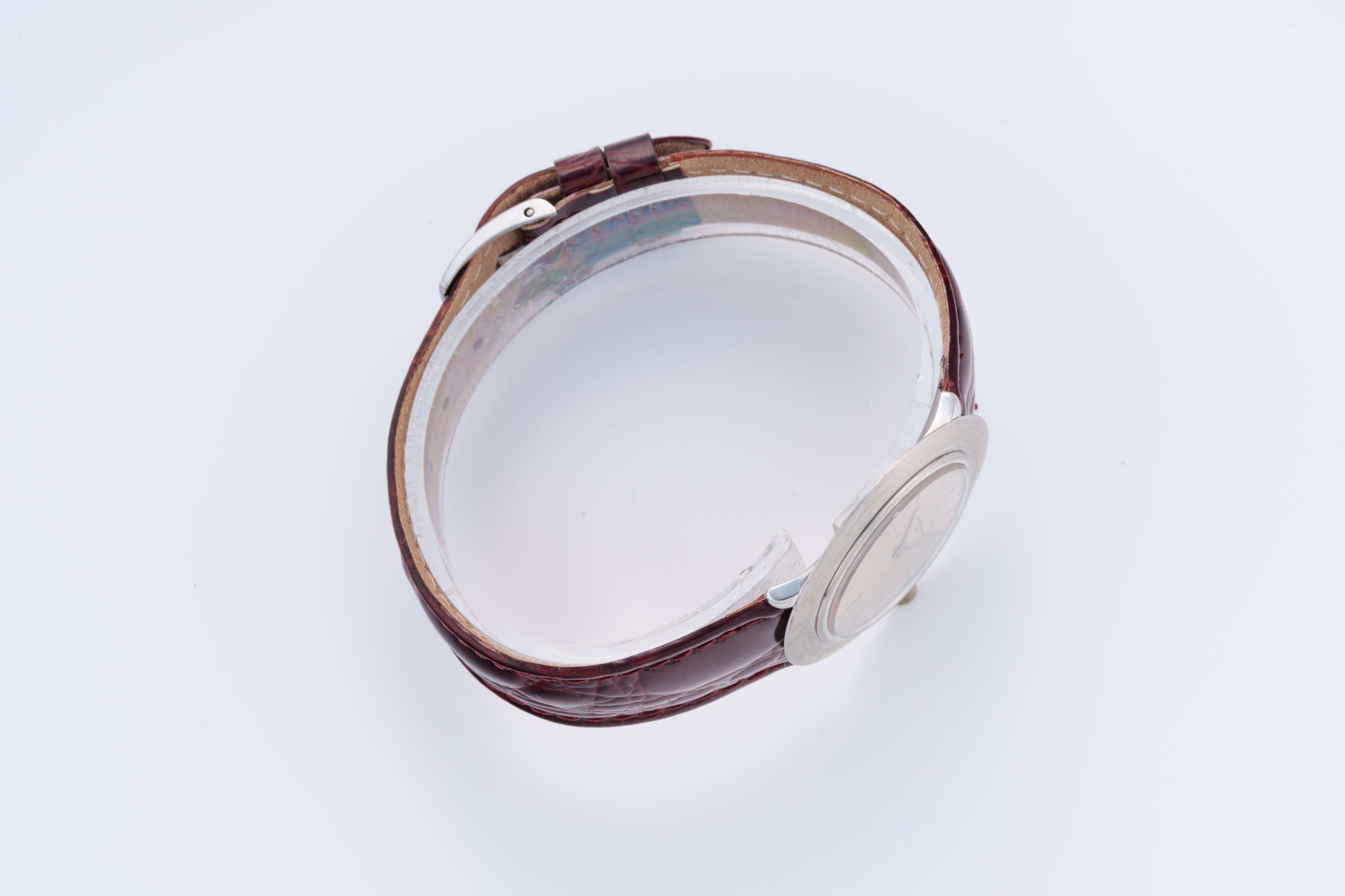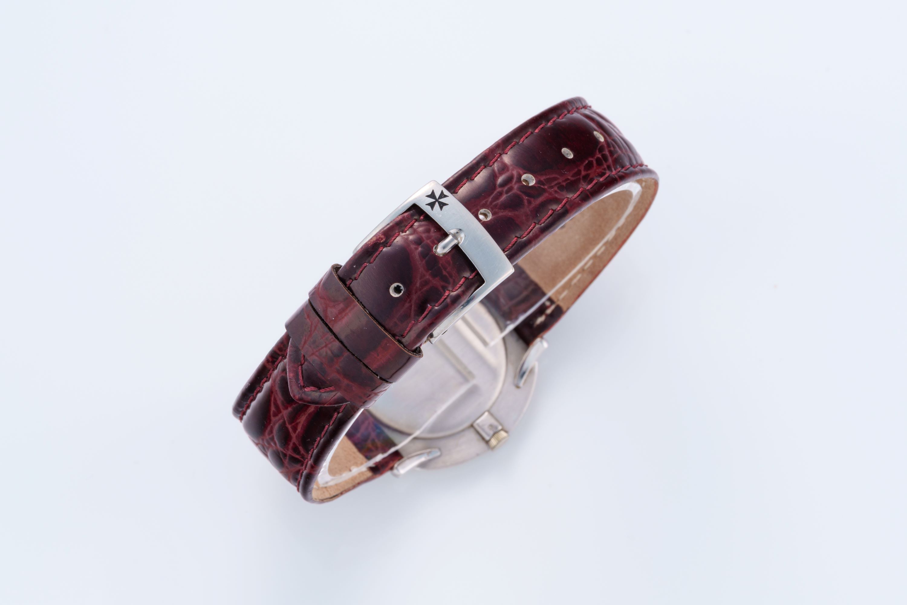 StrapBurgundy leather strap with alligator embossing, stainless steel pin buckle