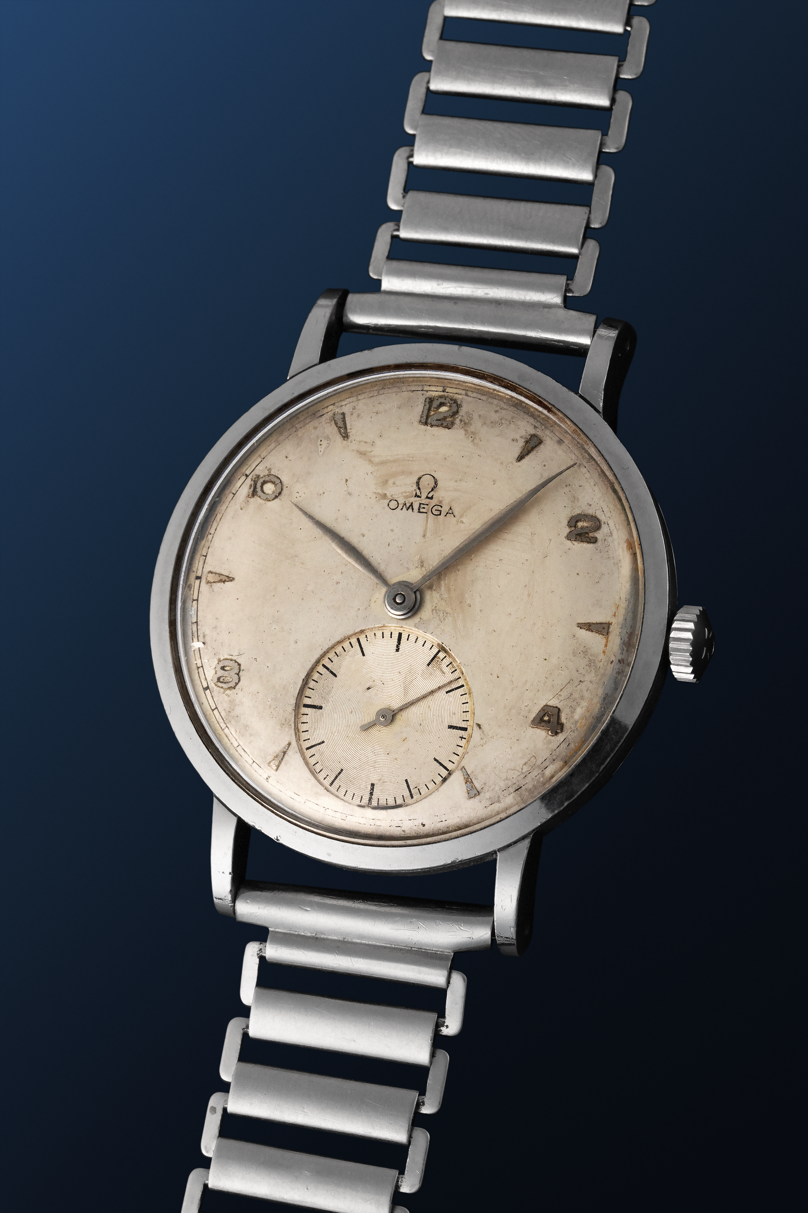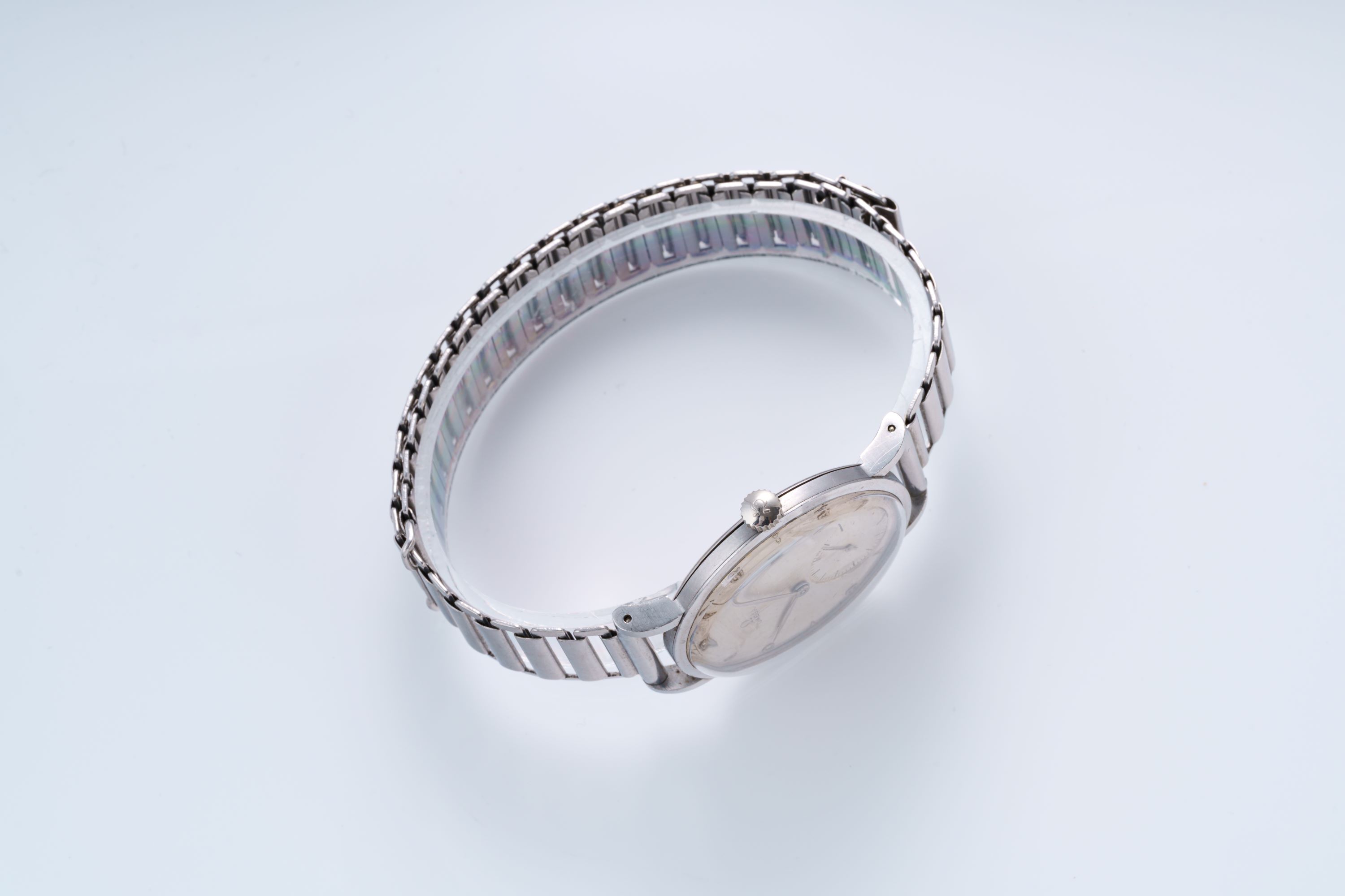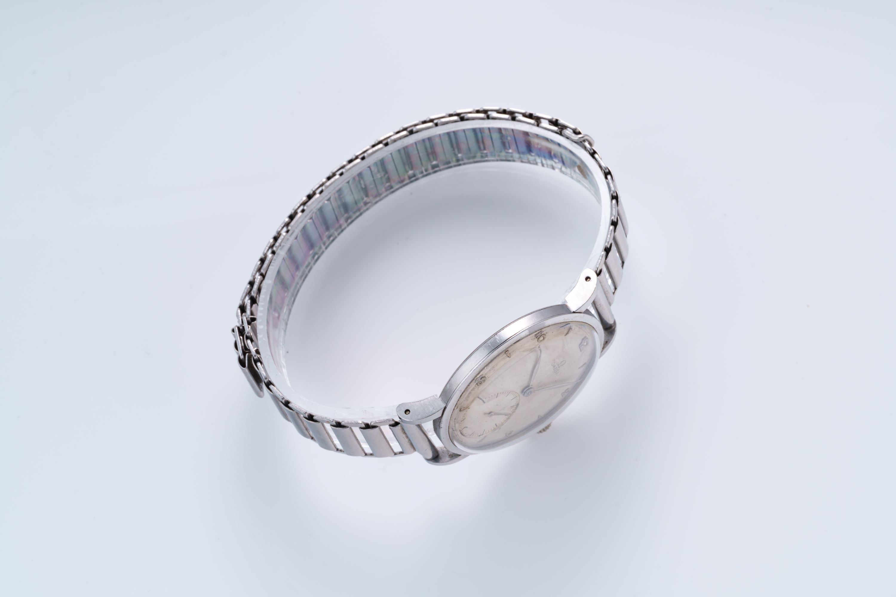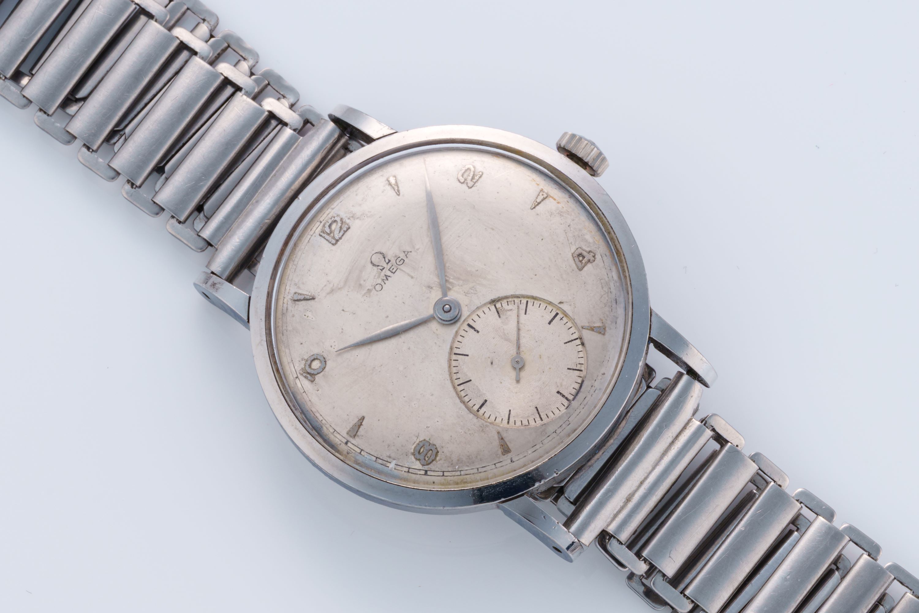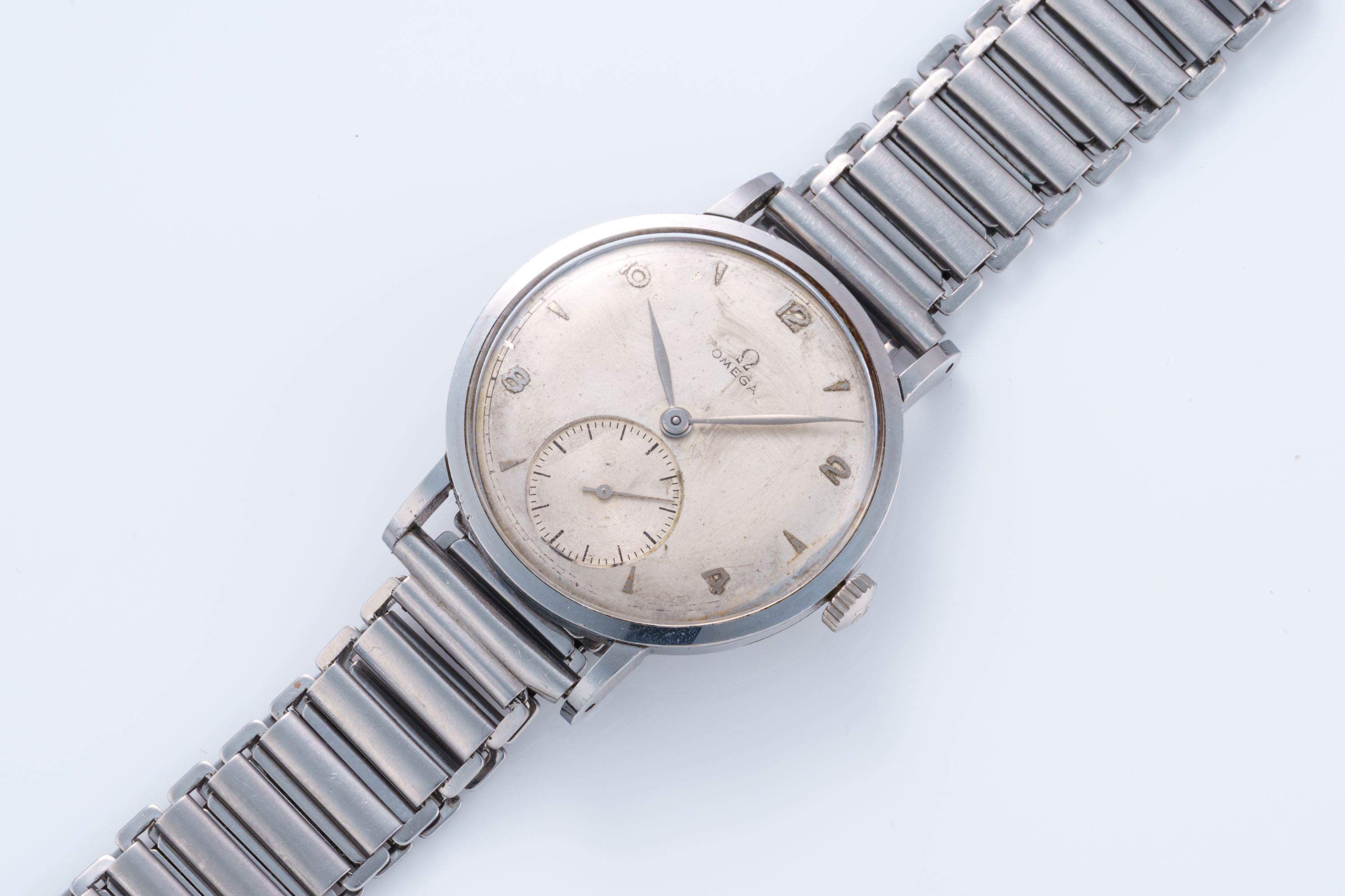 DialSilver-cream dial with applied numerals and indices, leaf hands, small seconds, signed 'Omega' at 12 o'clock