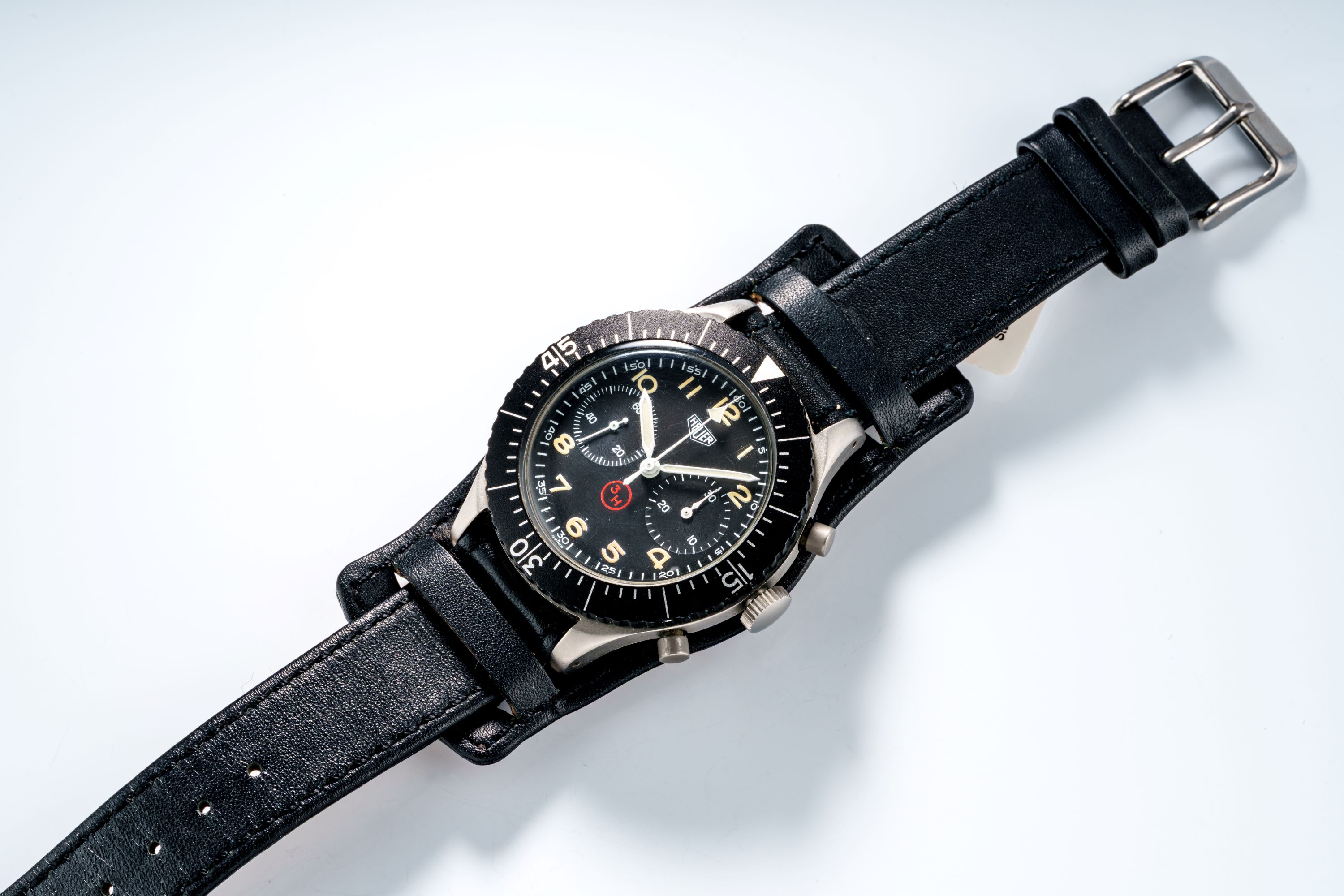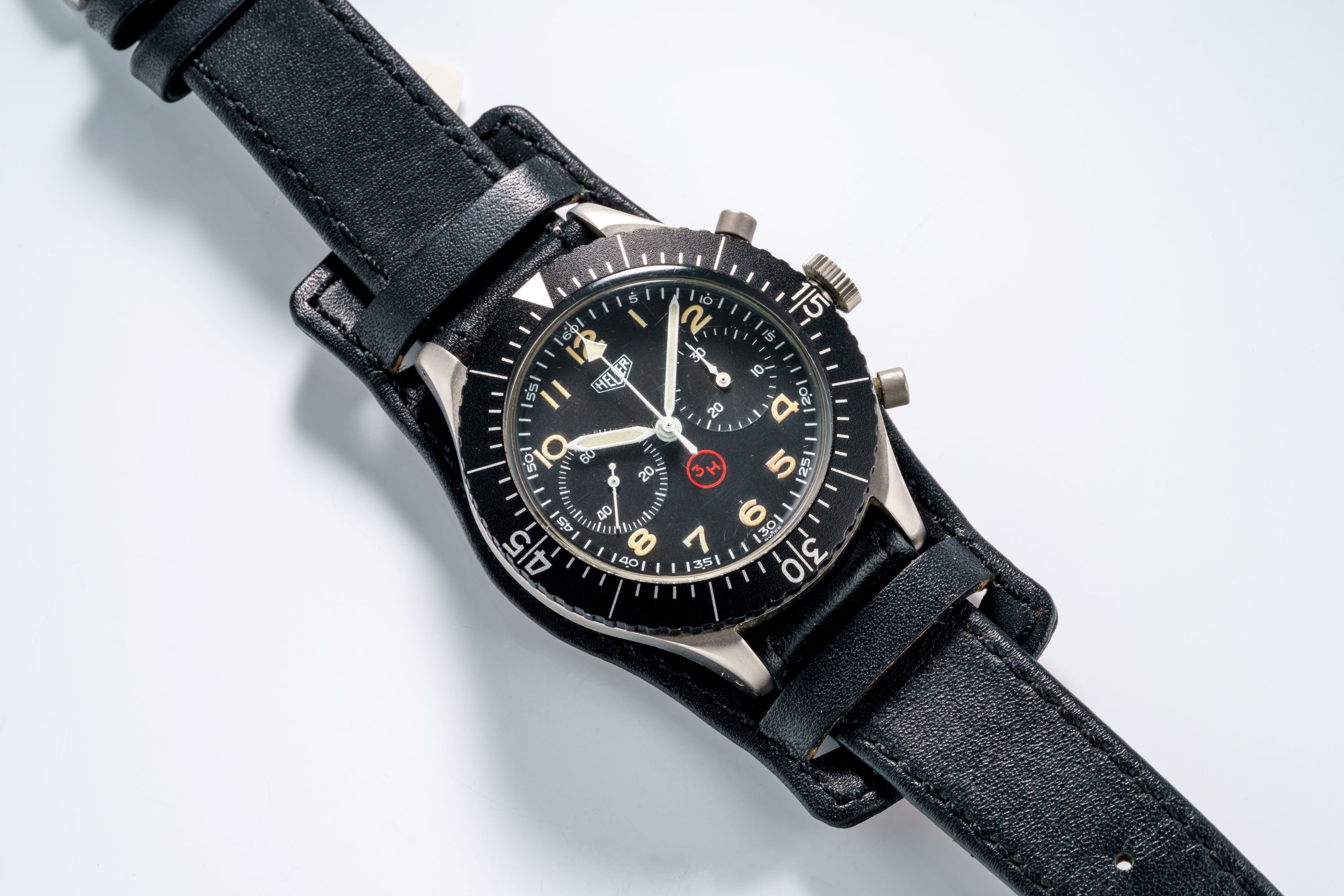 DialMatte black dial with luminous numerals, luminous hands, small seconds at 9 o'clock, 30 minute chronograph counter at 3 o'clock, signed 'Heuer' at 12 o'clock, red '3H' emblem at 6 o'clock