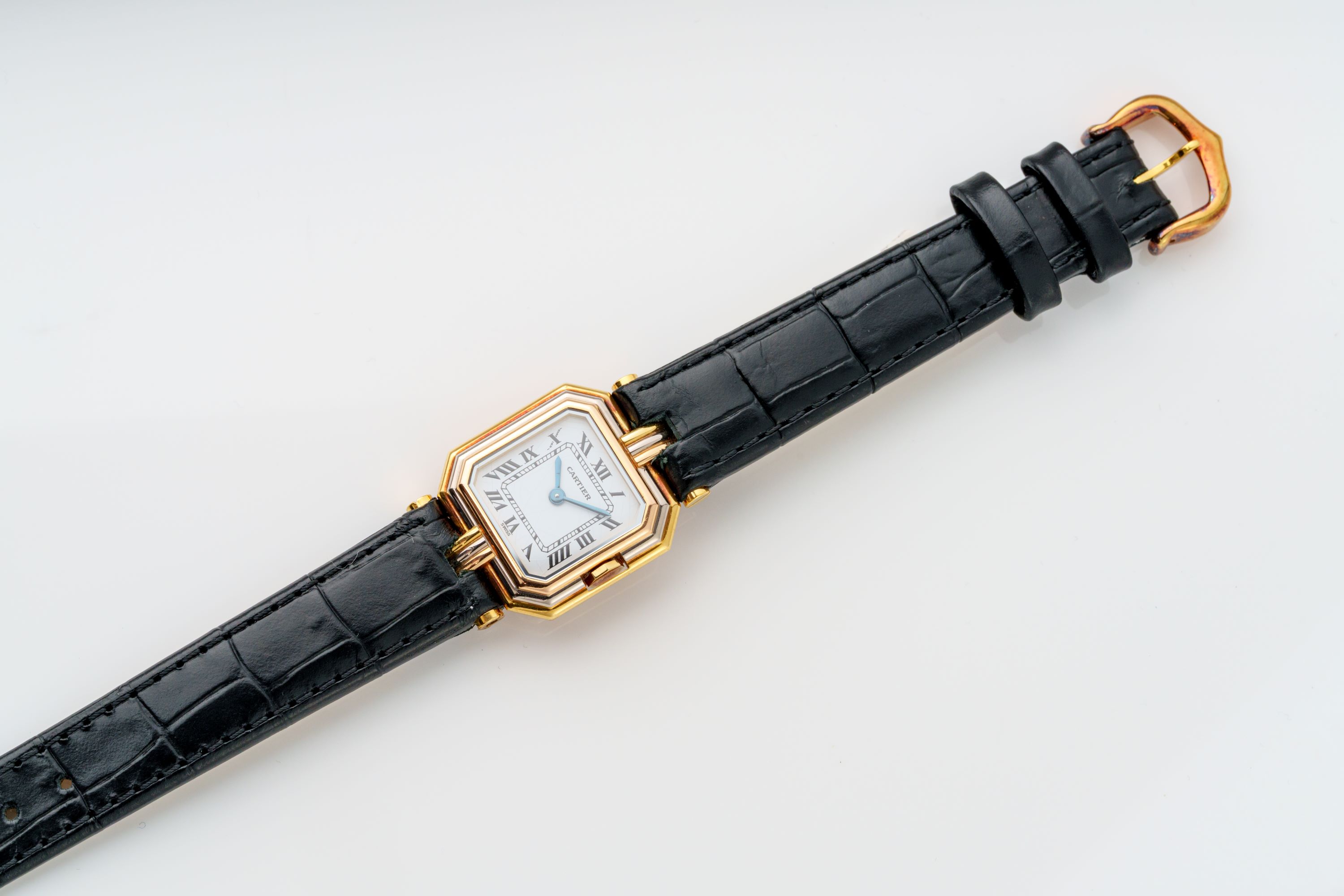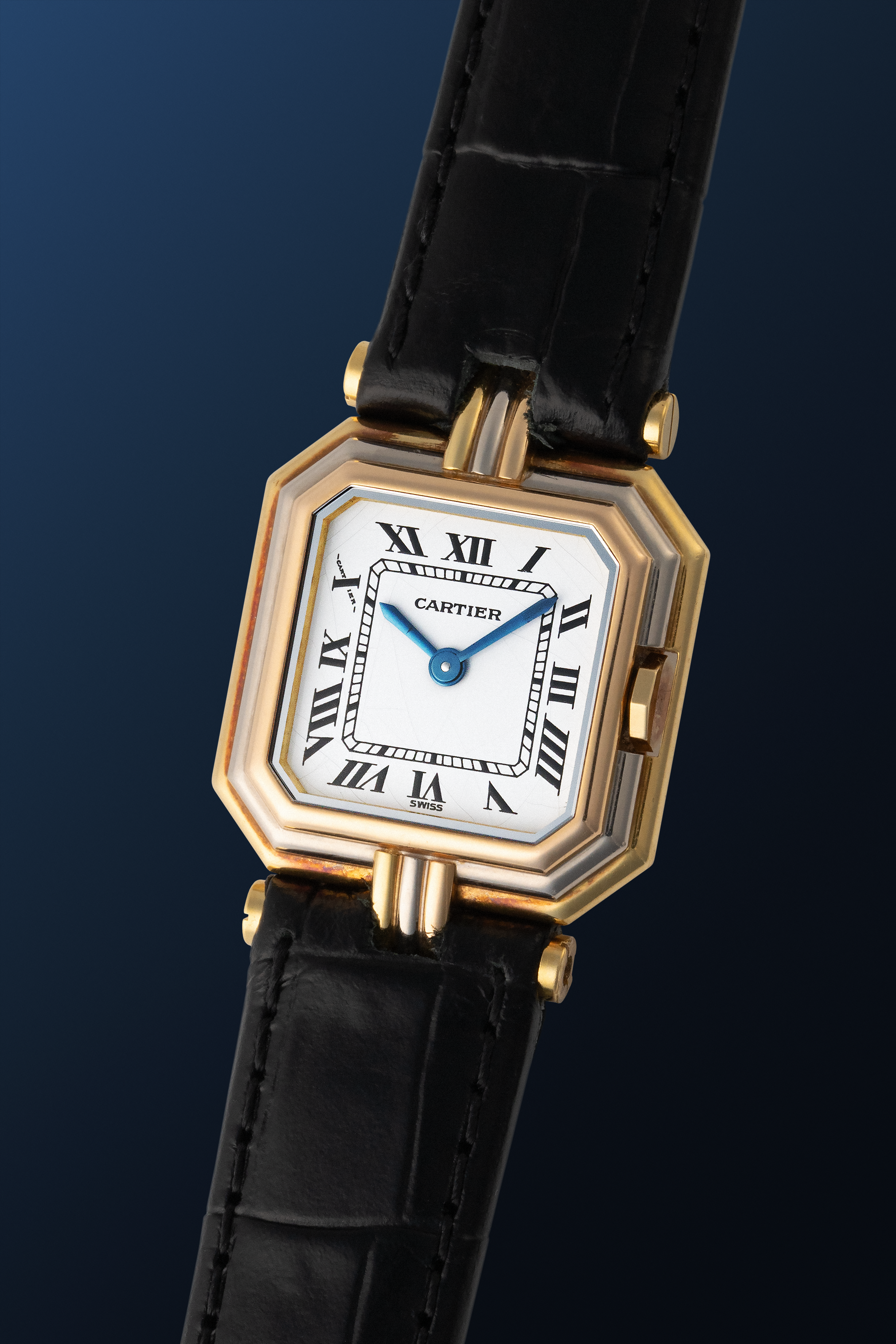 CaseOctagonal case in 18k yellow, white, and rose gold, integrated crown at 3 o'clock, solid caseback