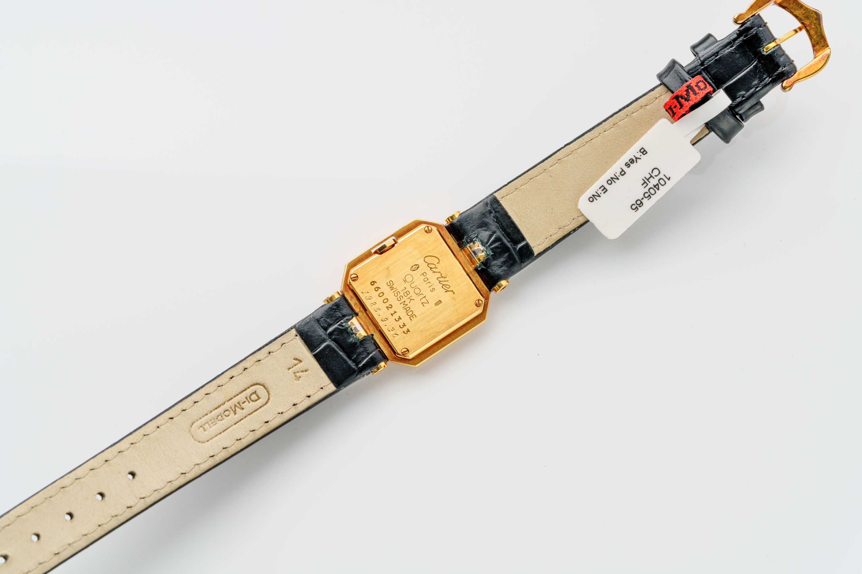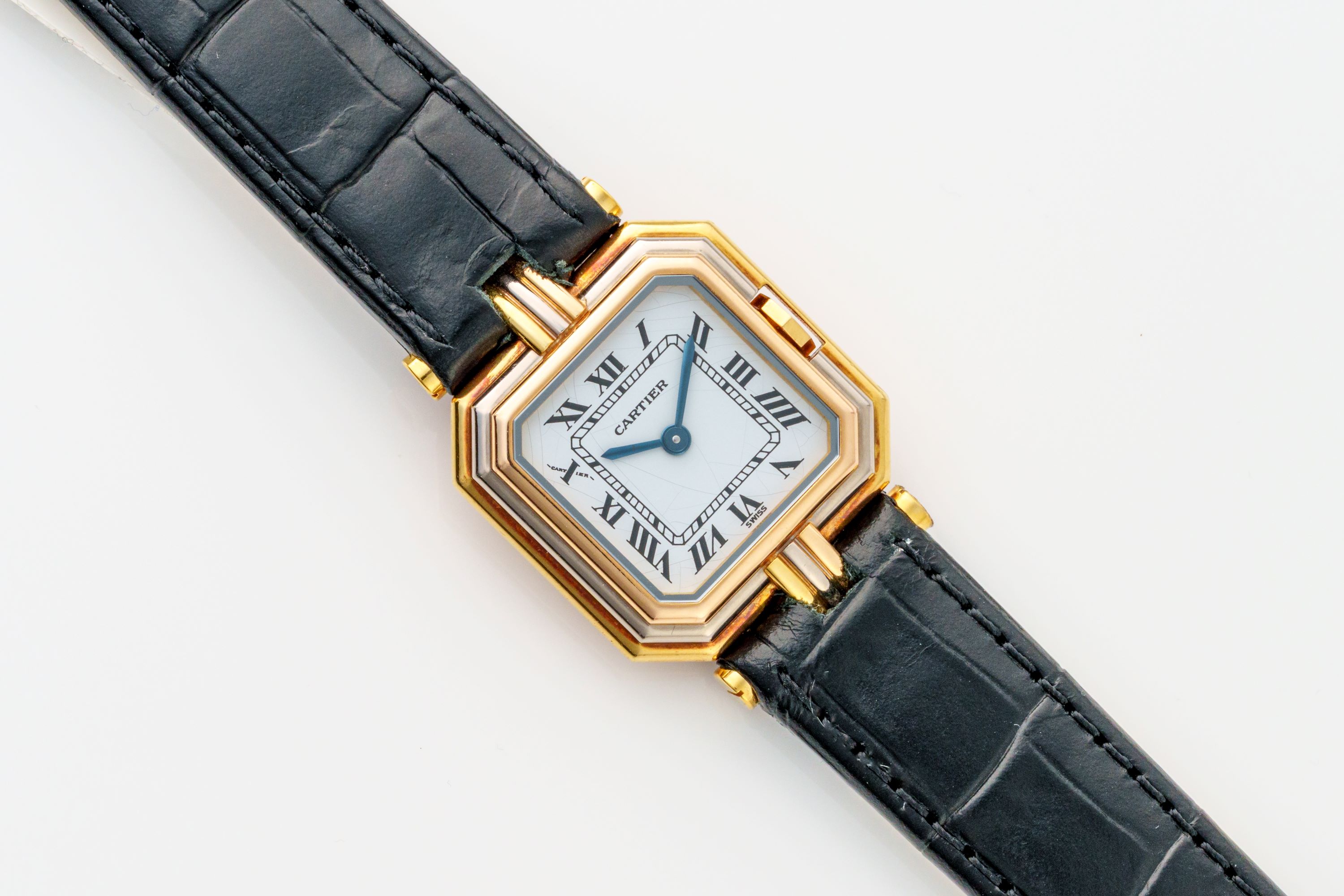 DialWhite lacquer dial with Roman numerals, heat-blued hands, signed 'Cartier' at 12 o'clock, spider cracks in the lacquer