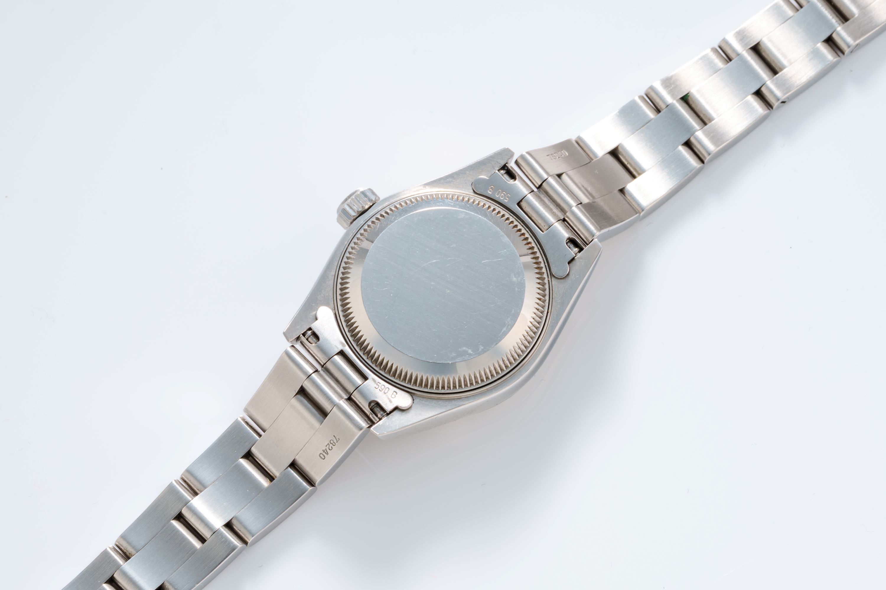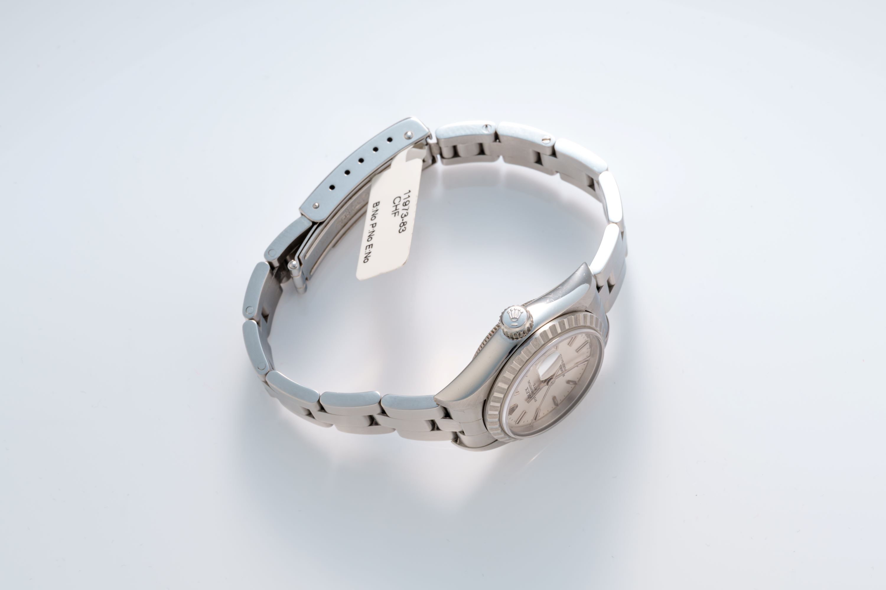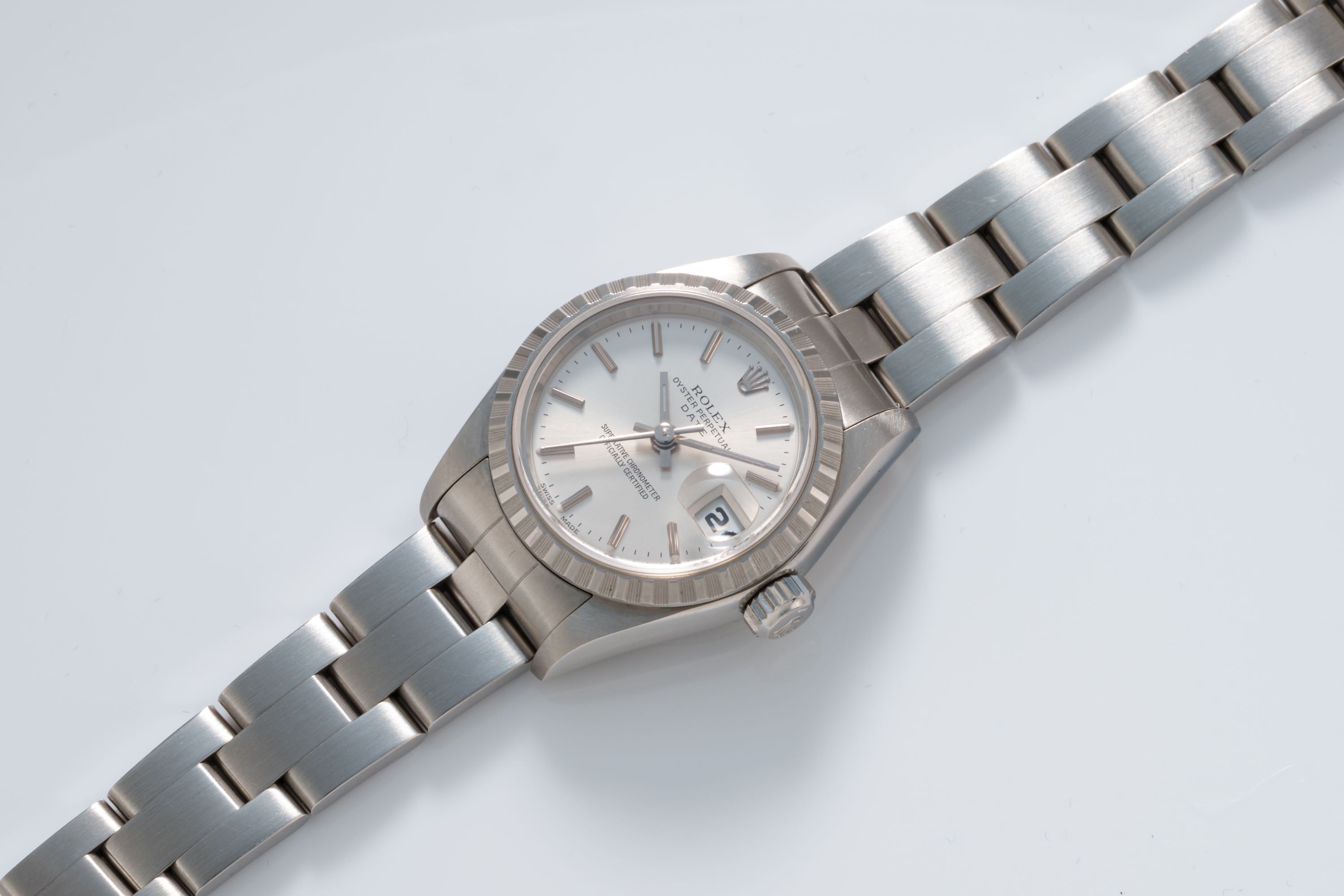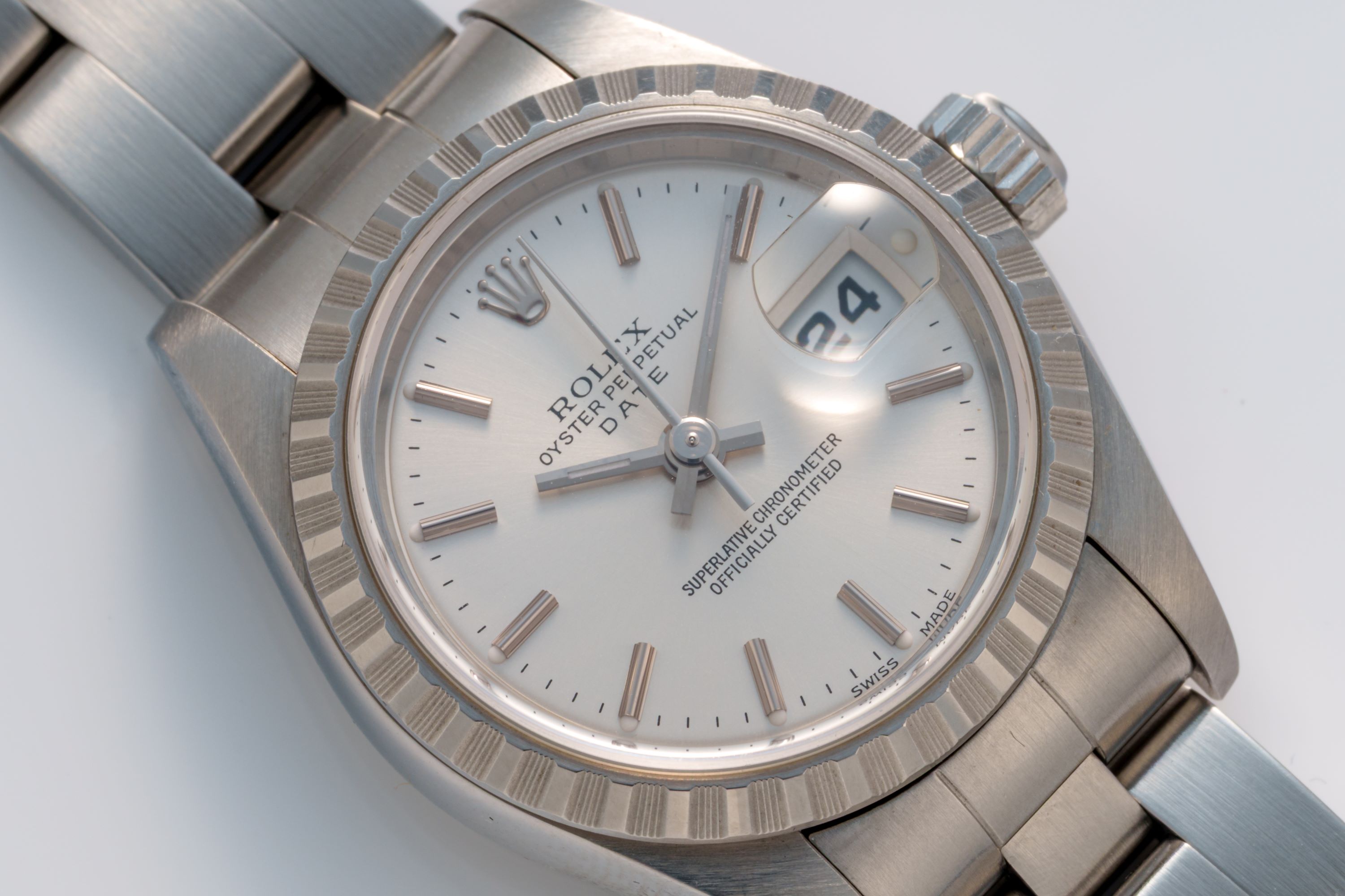 DialSilver sunburst dial with applied indices, white gold hands, date window at 3 o'clock, signed 'Rolex' at 12 o'clock