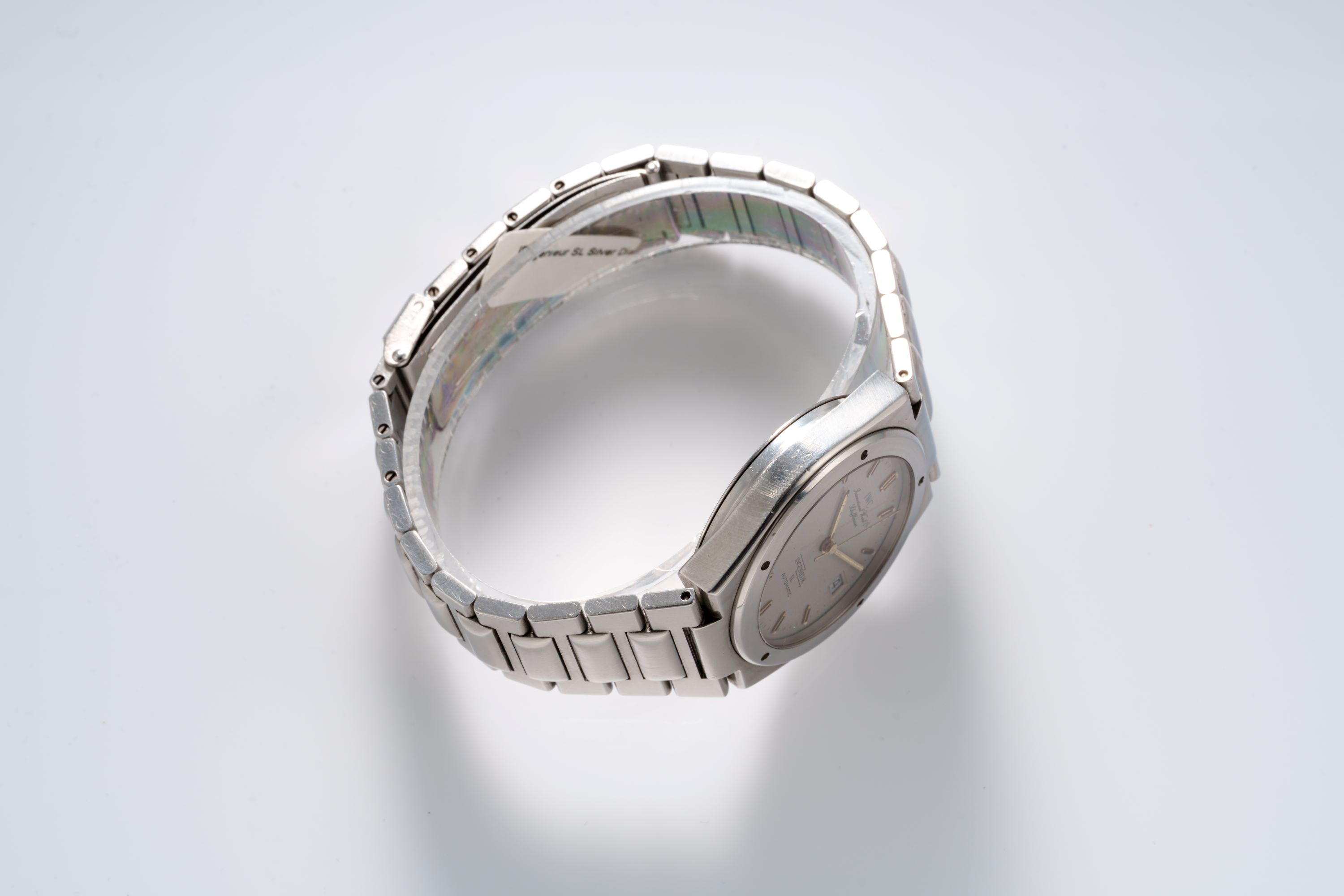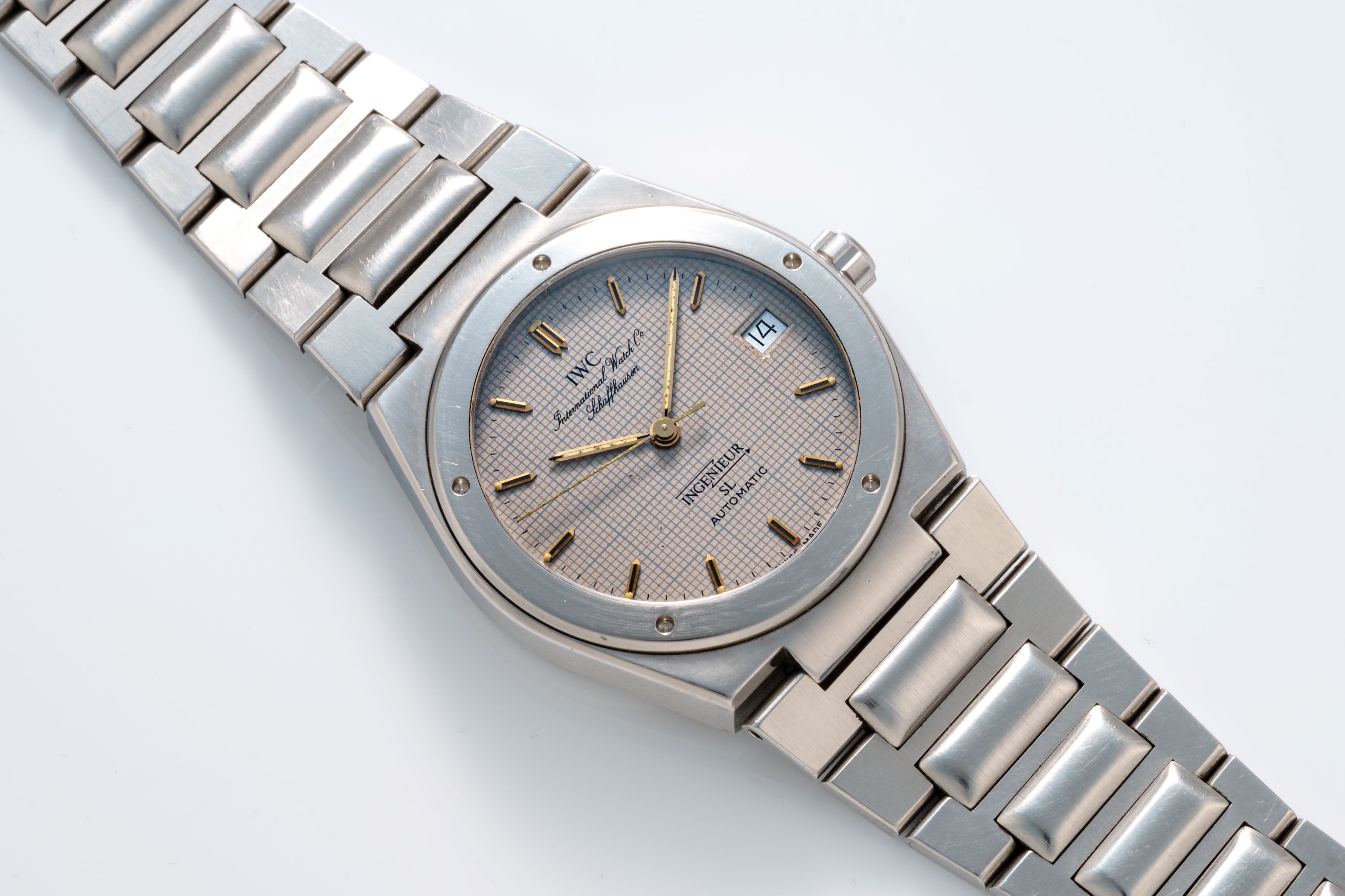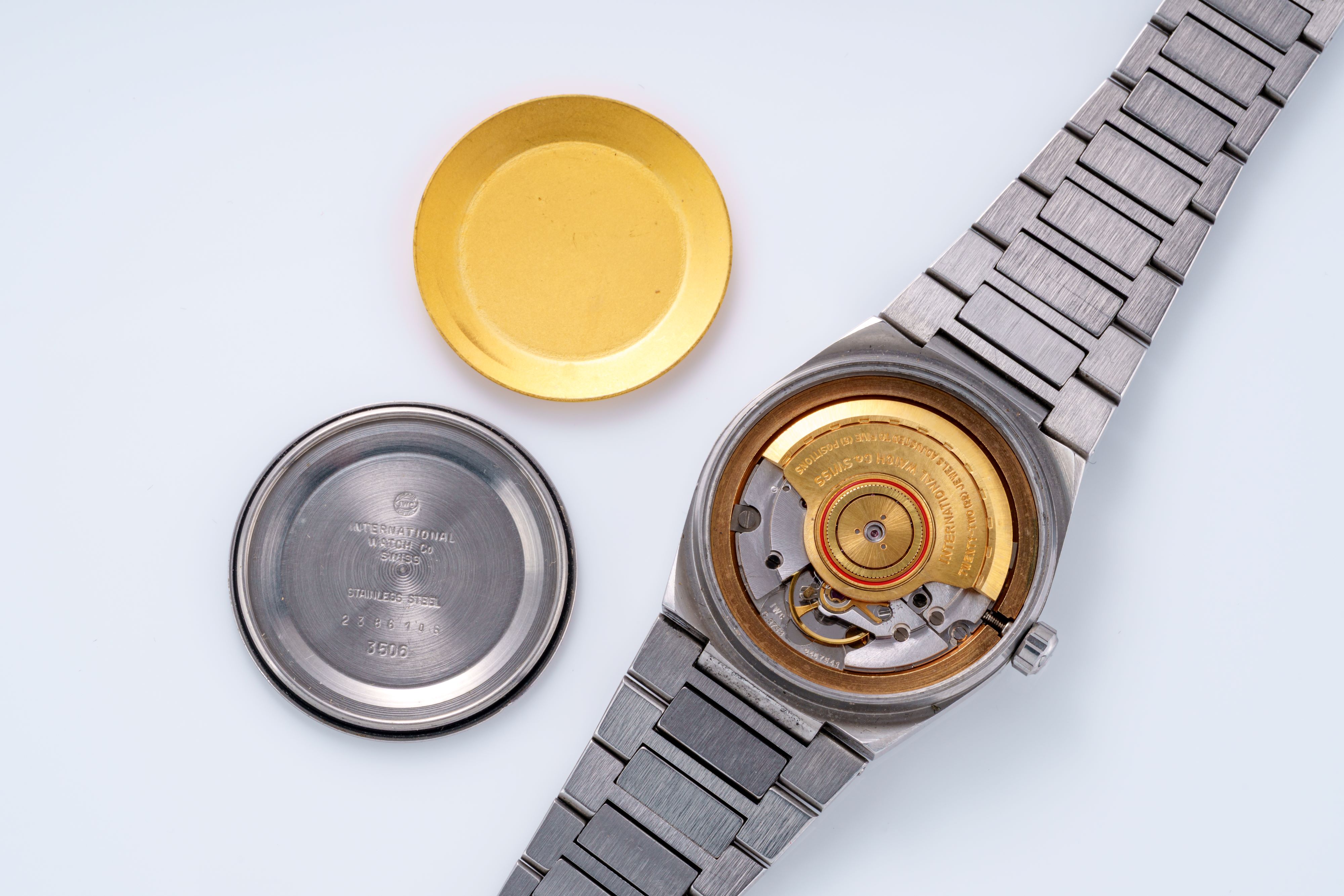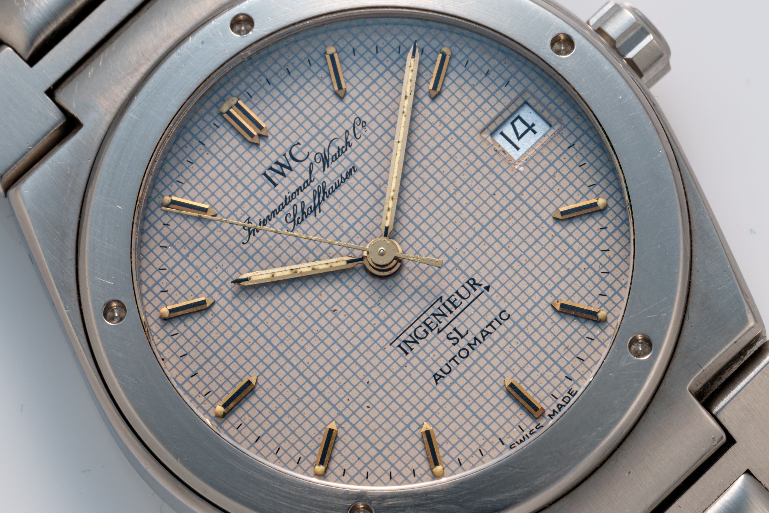 DialSilver grid dial with applied gold indices, gold hands, date window at 3 o'clock, signed 'IWC' at 12 o'clock