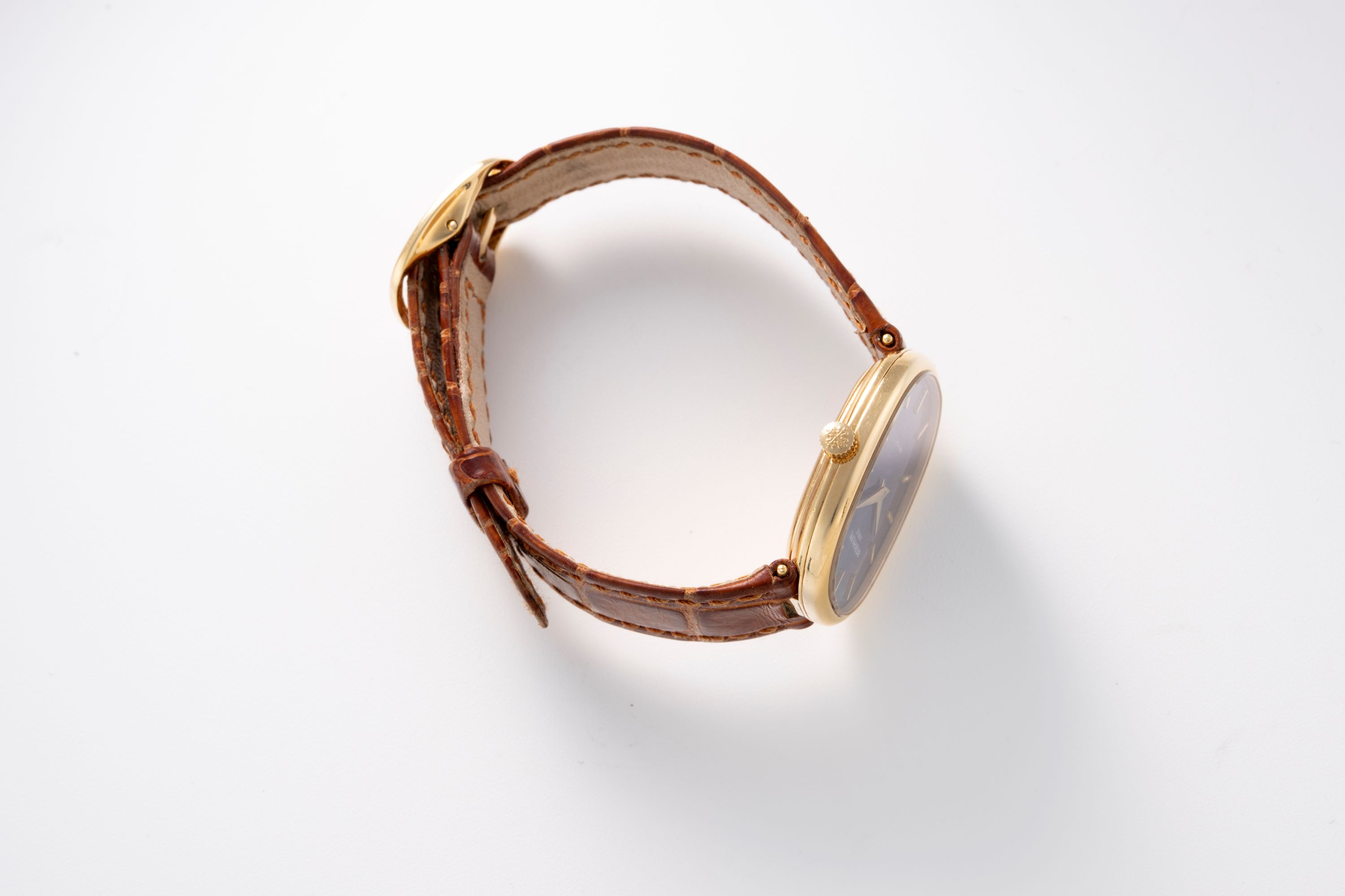 CaseElliptical case in 18k yellow gold with winding crown at 3 o'clock, solid caseback