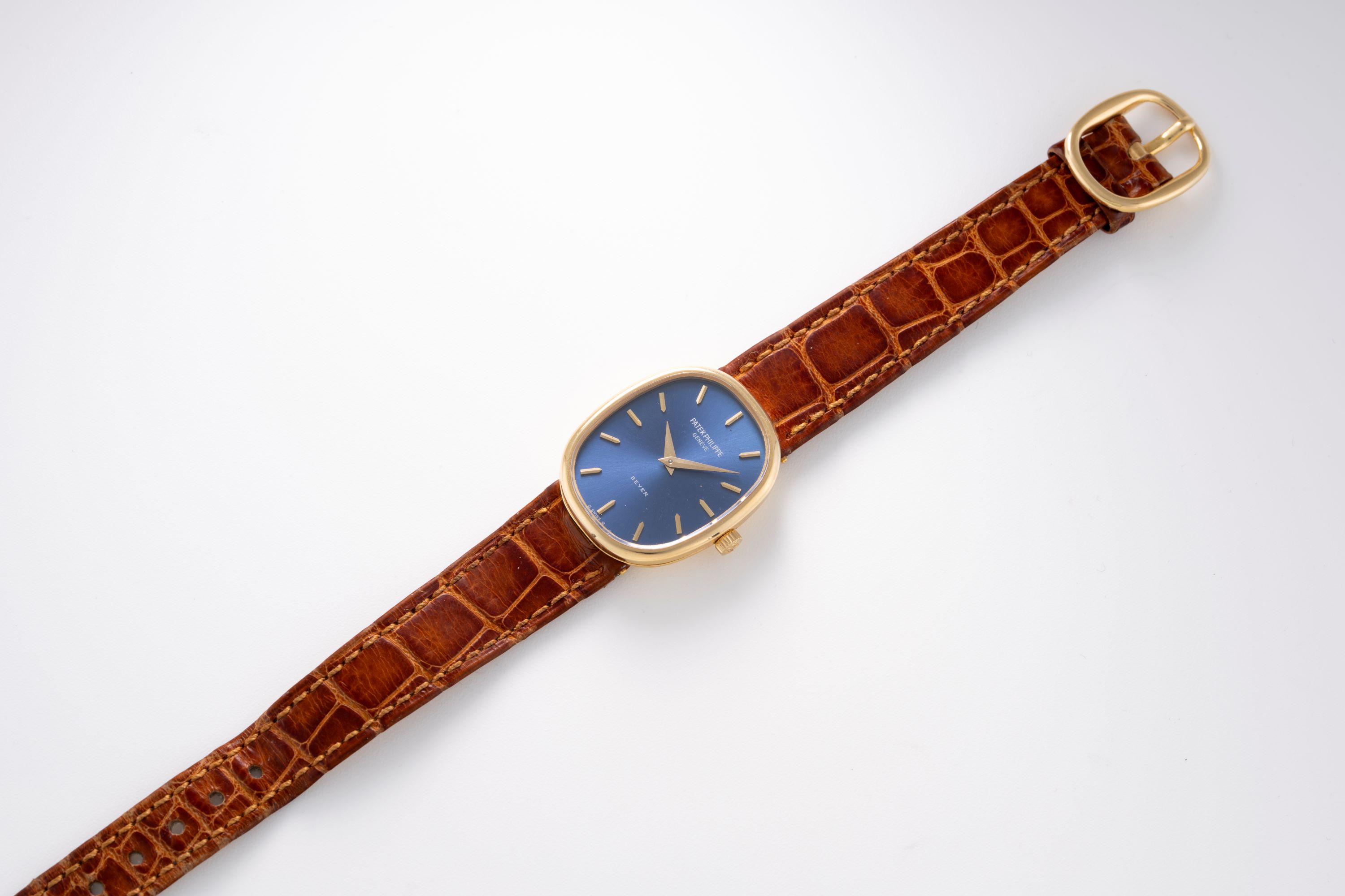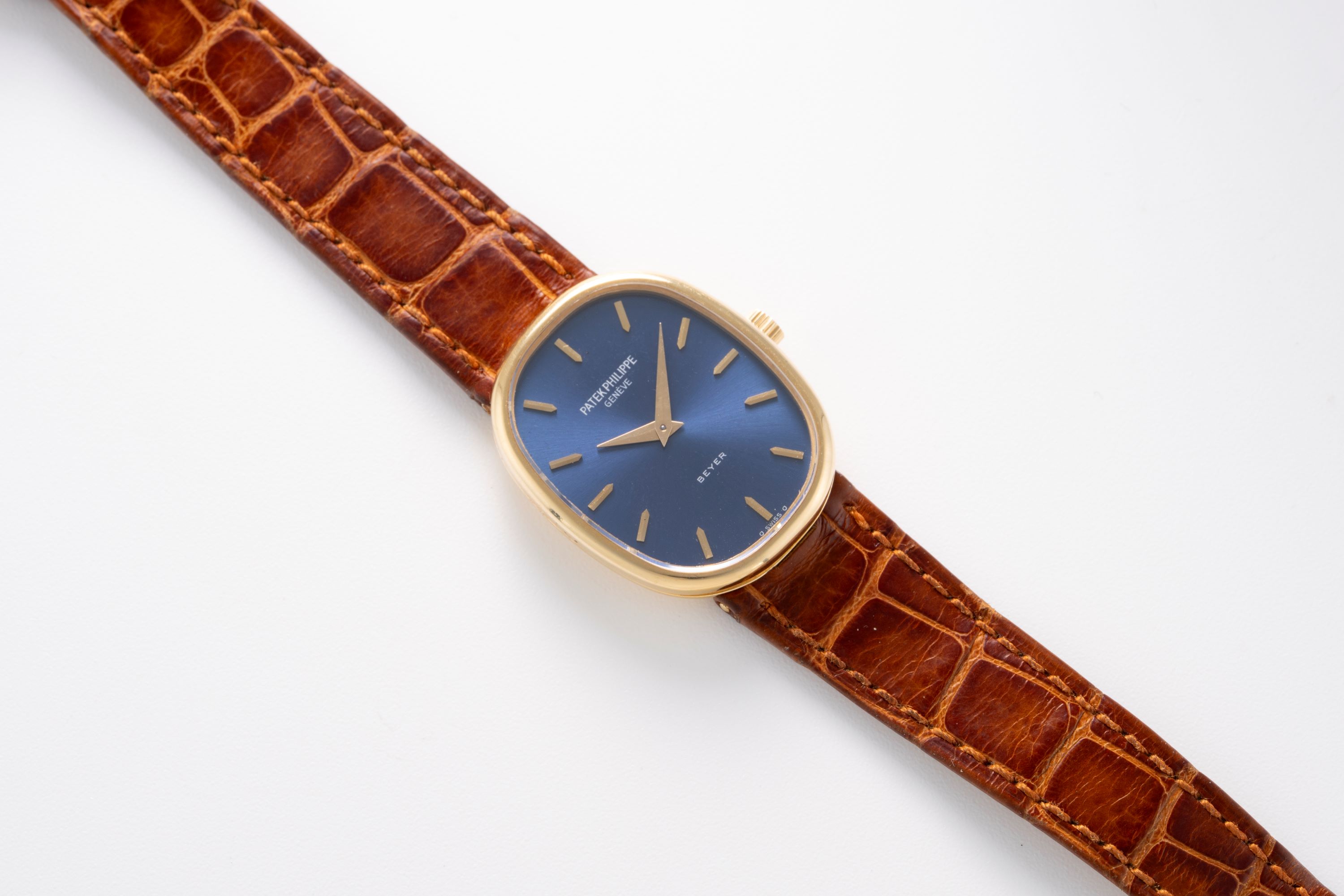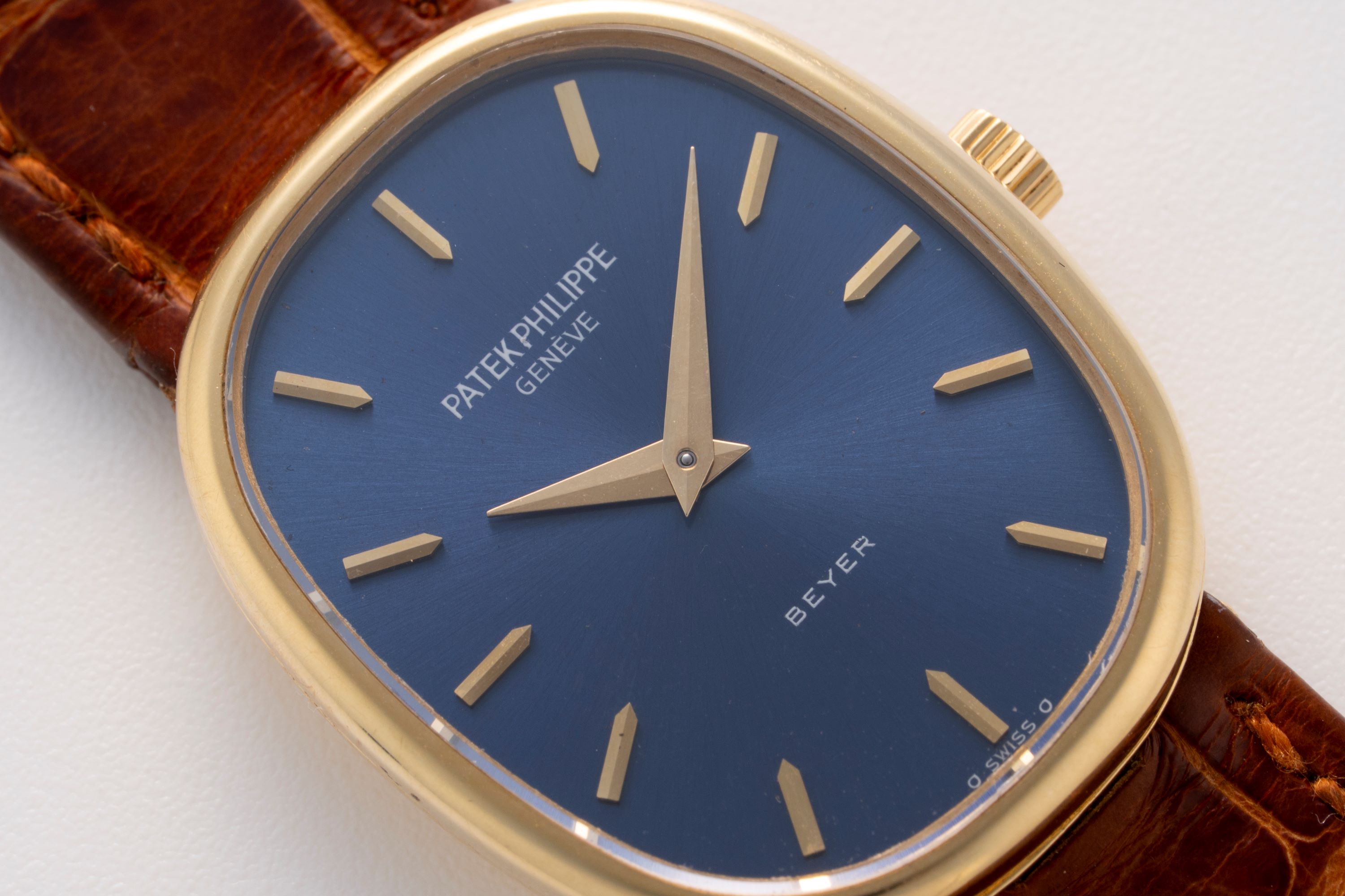 DialBlue sunburst dial with applied gold indices, gold dauphine hands, signed 'Patek Philippe' at 12 o'clock, signed 'Beyer' at 6 o'clock