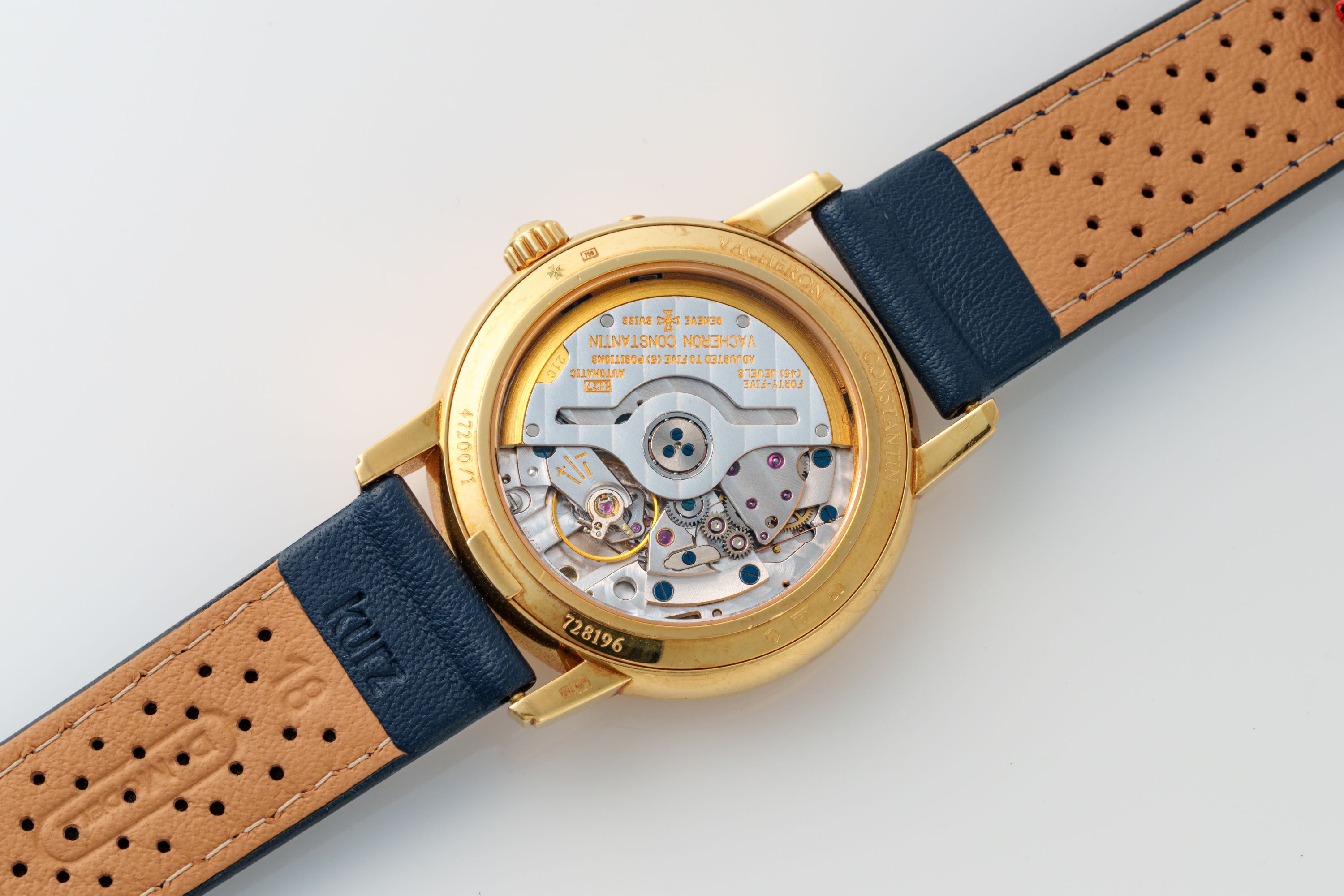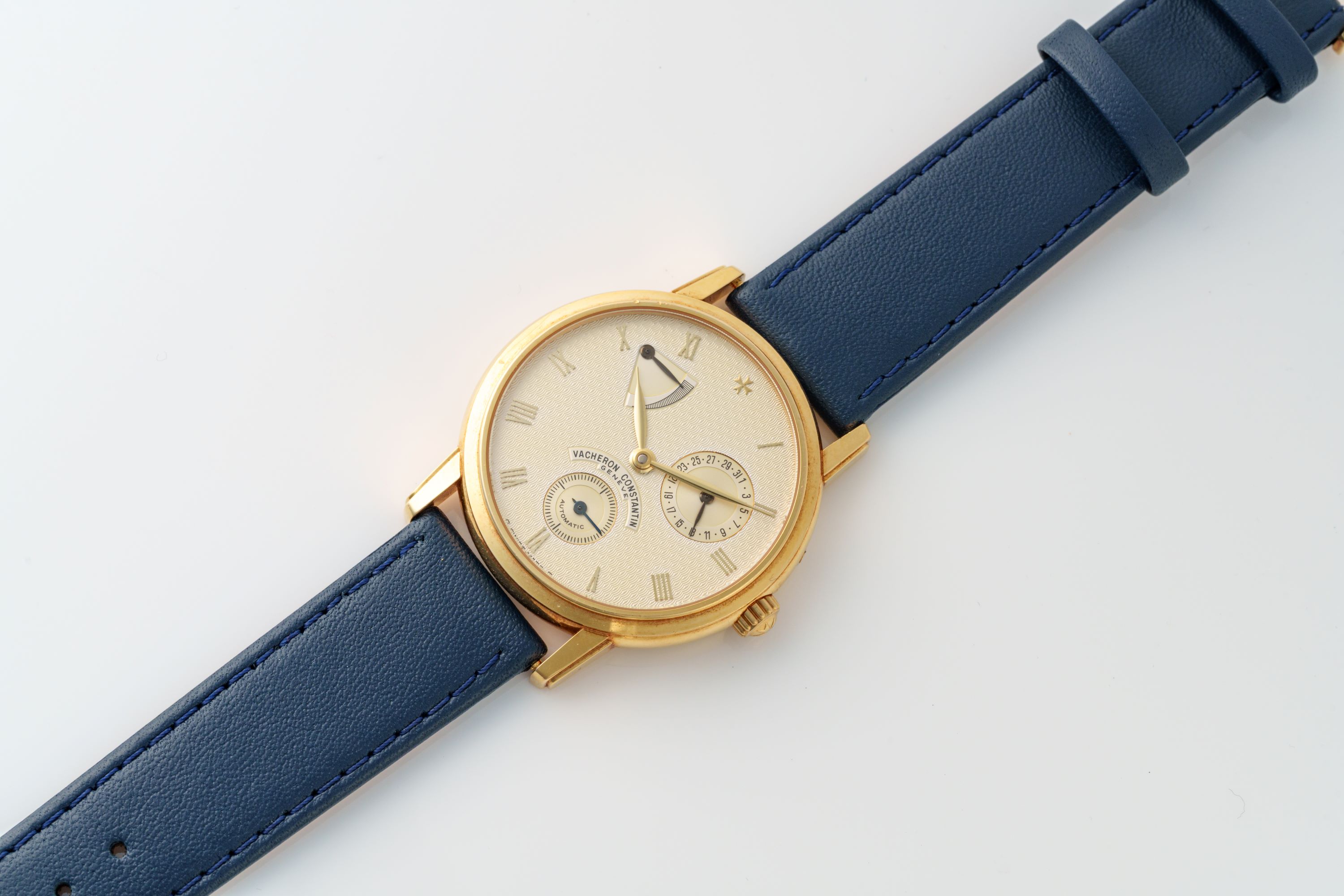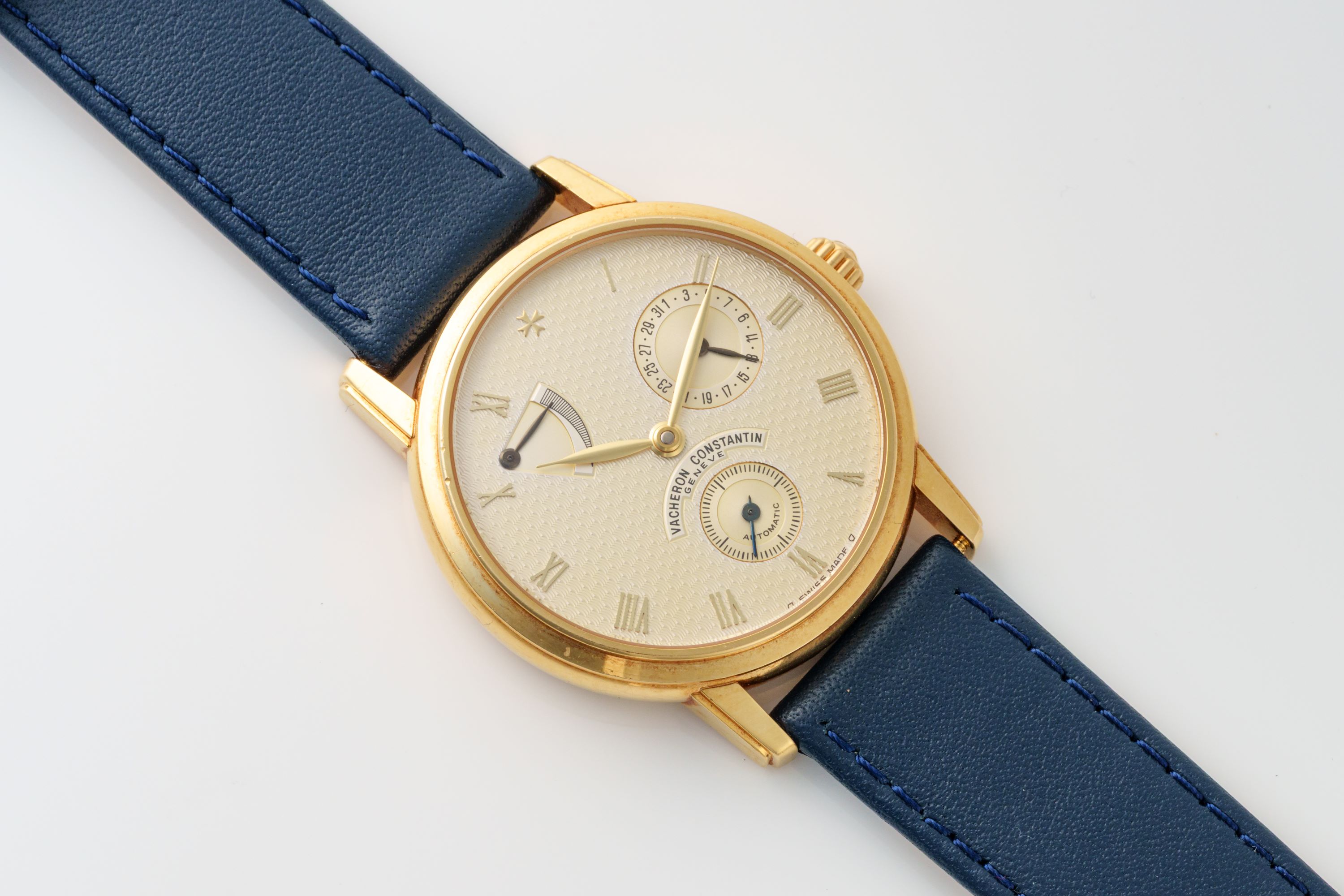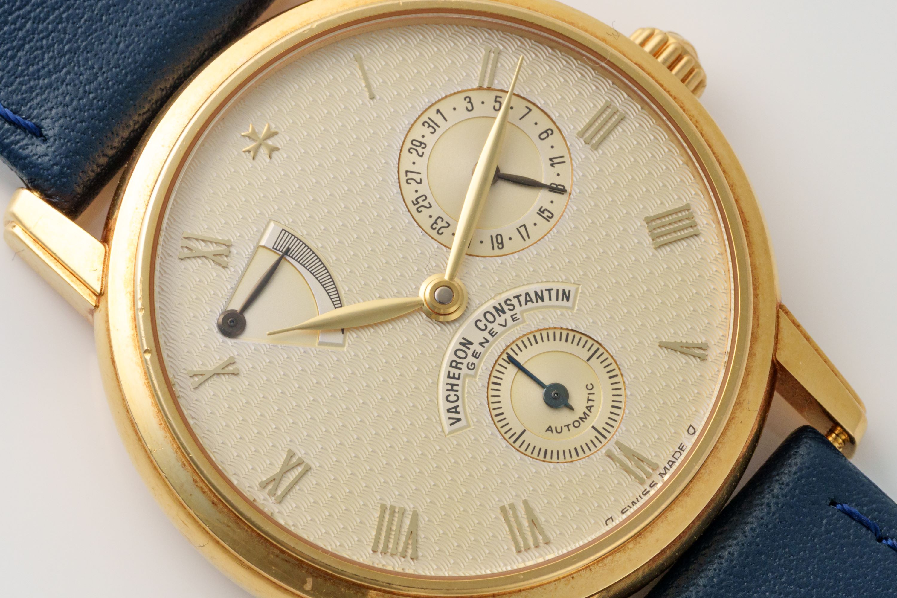 DialSilver-cream guilloche dial with applied Roman numerals, gold leaf hands, power reserve at 10:30, date at 2:30, small seconds at 6 o'clock, signed 'Vacheron Constantin' at 6 o'clock