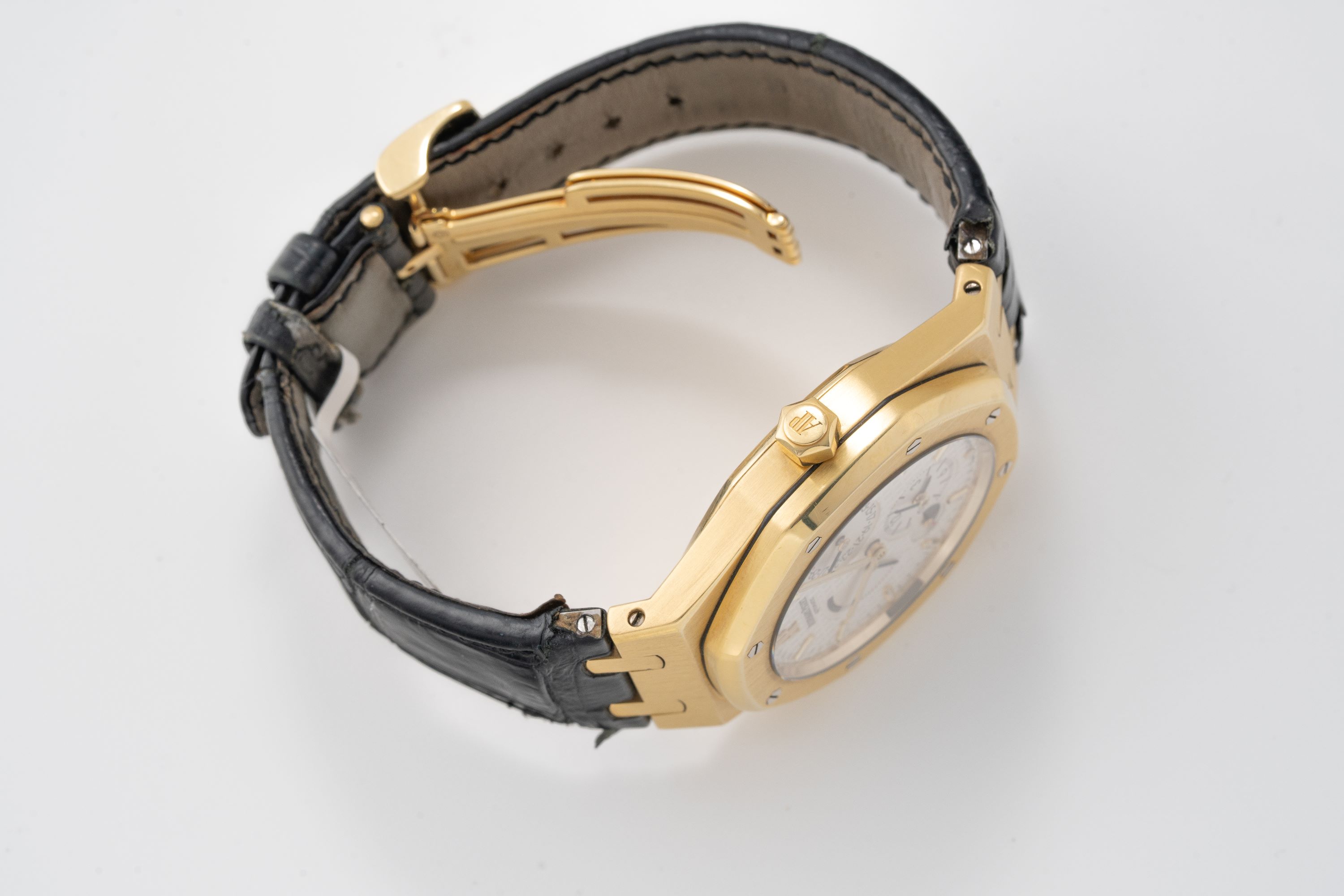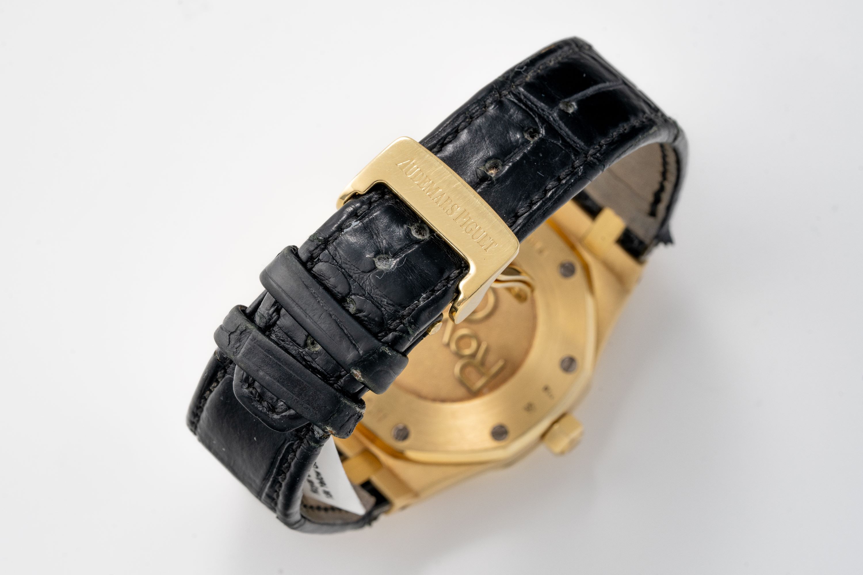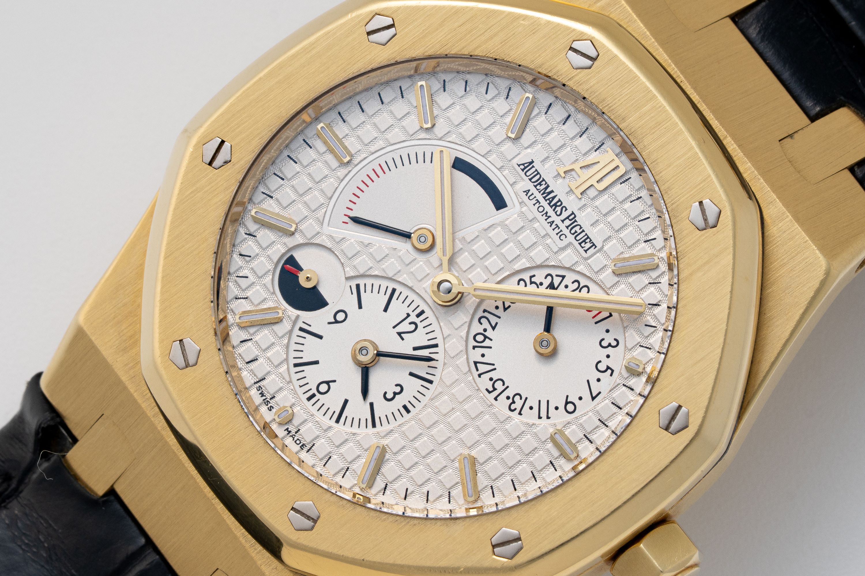 DialSilver-white tapisserie dial with applied luminous gold inidces, gold luminous hands, date at 2 o'clock, second timezone dial at 6 o'clock, day/night indicator to the left of it, power reserve at 10 o'clock, signed 'Audemars Piguet' with applied 'AP' logo at 12 o'clock