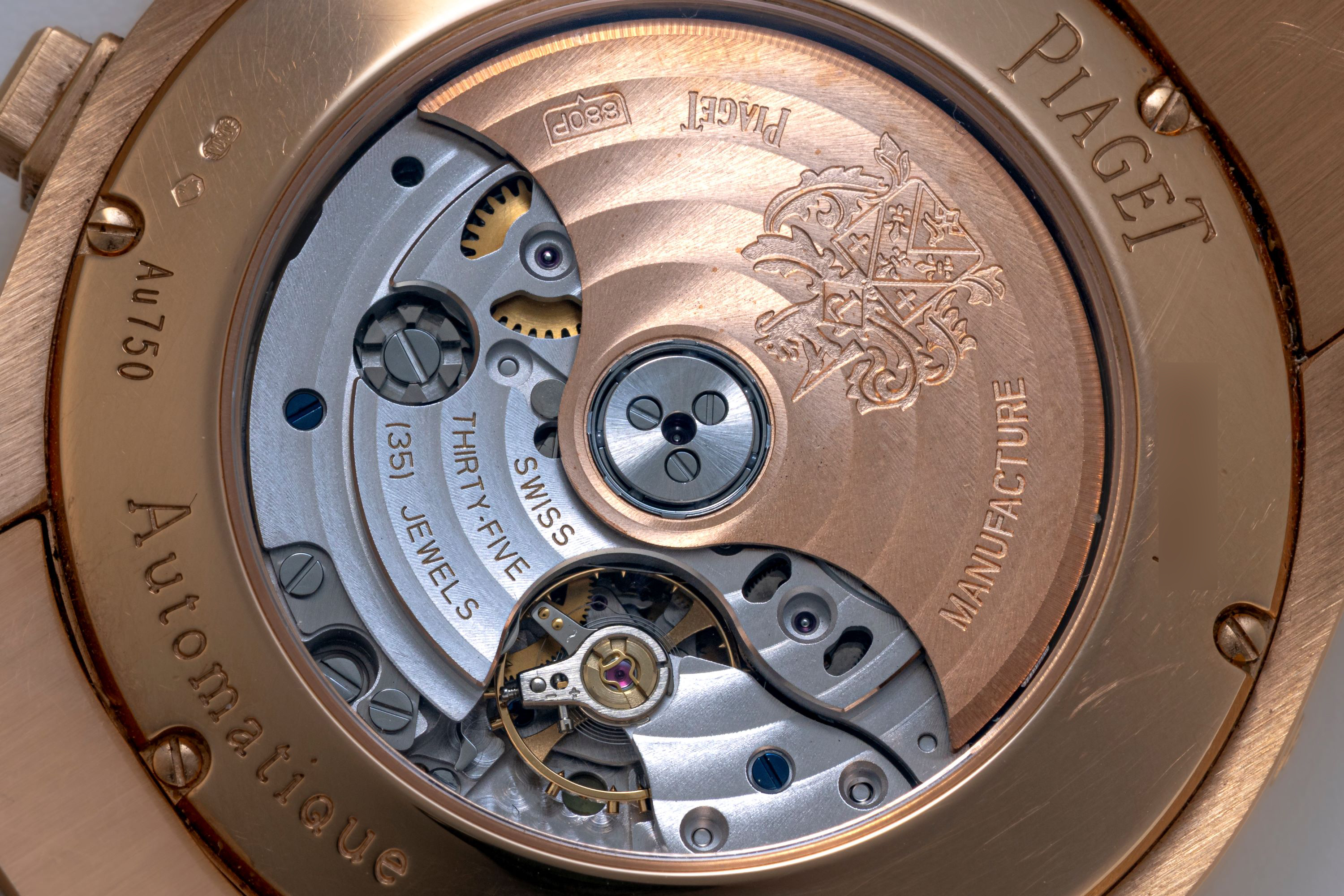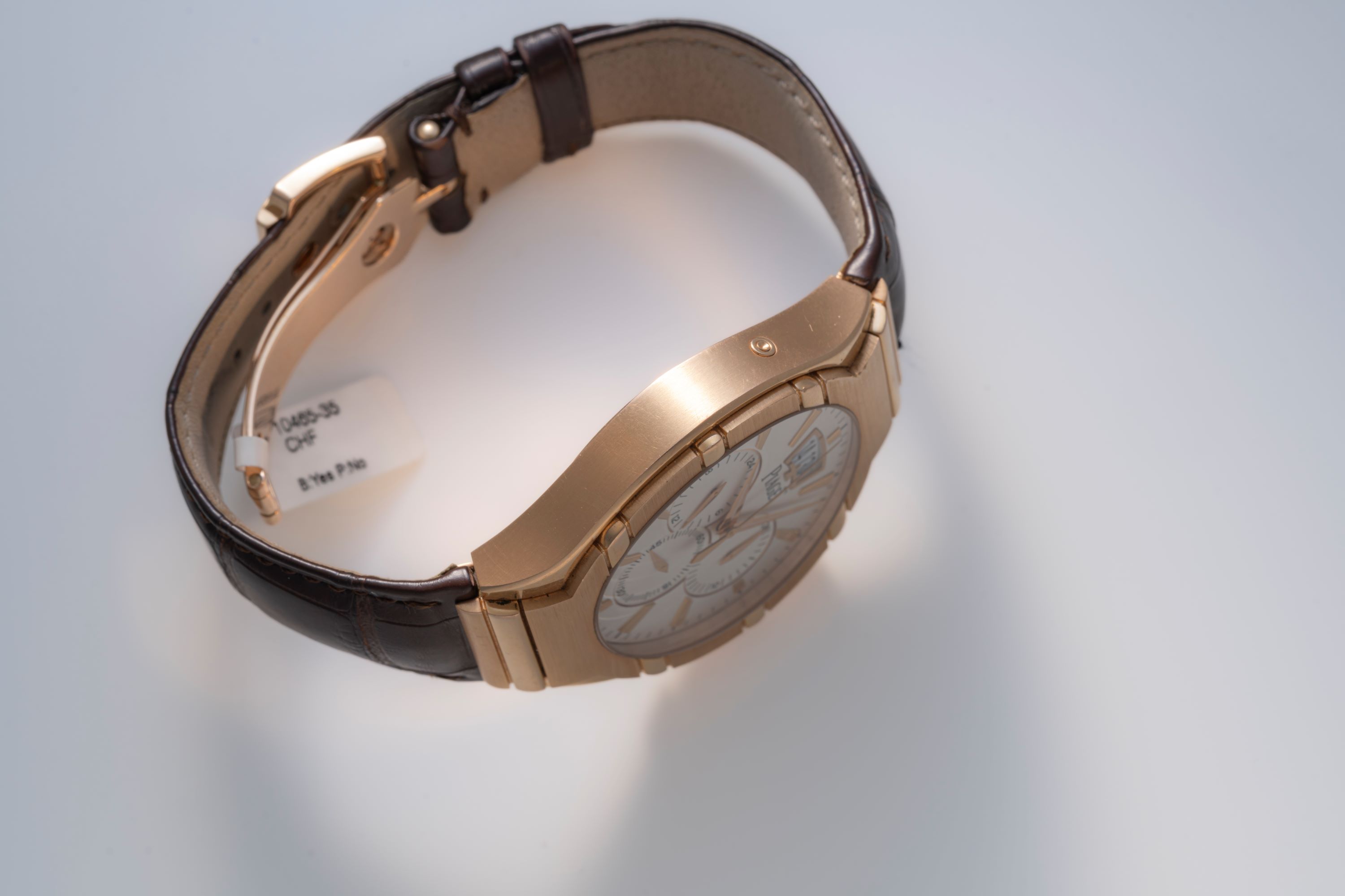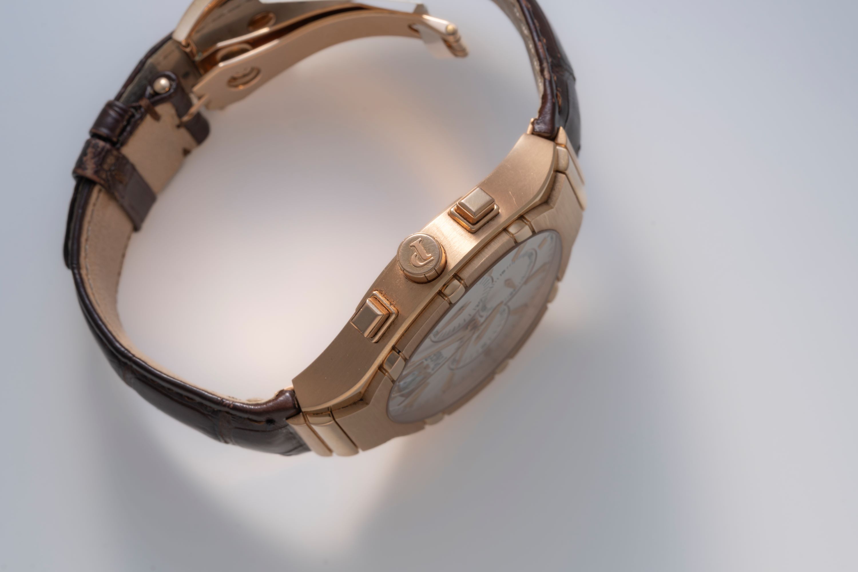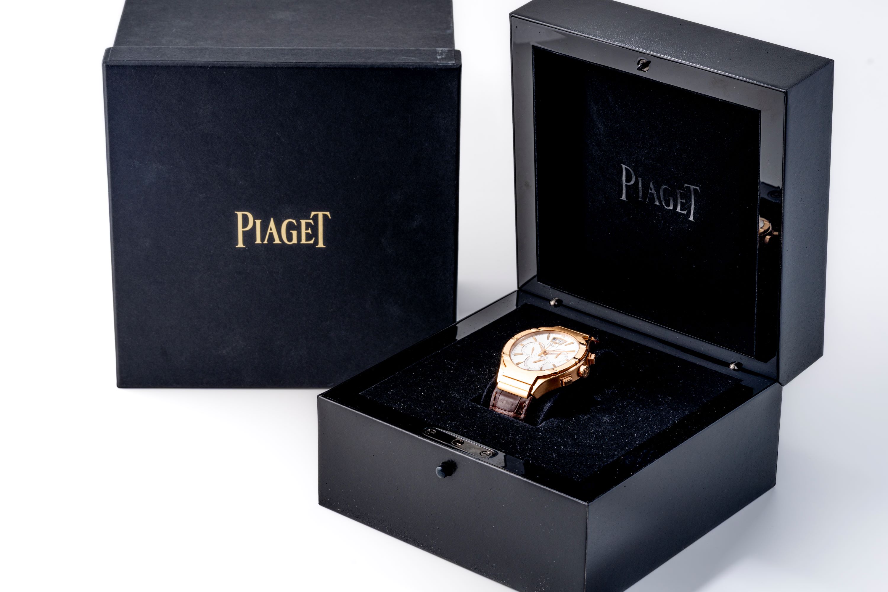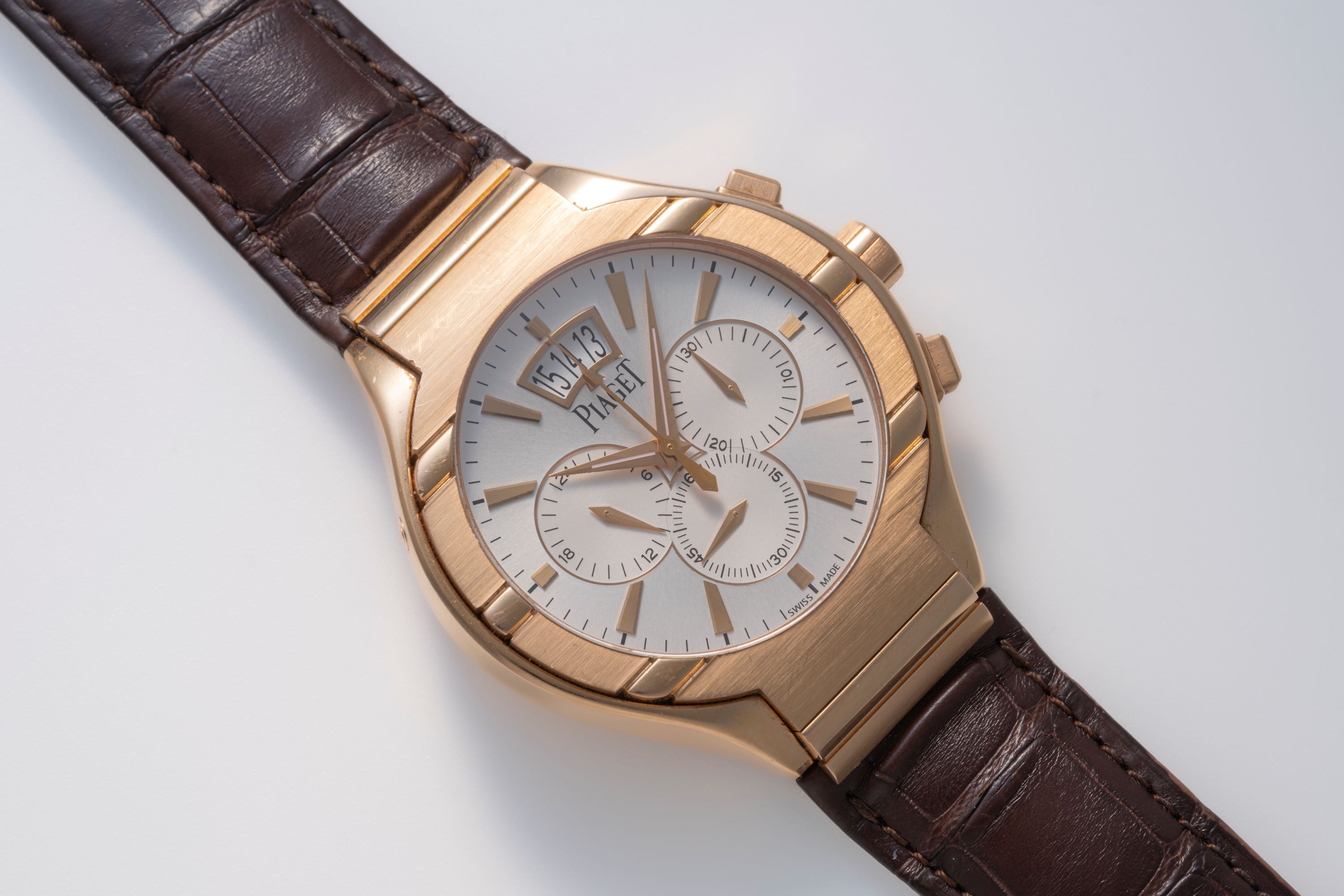 DialSilver dial with rose gold accents, rose gold hands and indices, small seconds at 6 o'clock, 24 hour indicator at 9 o'clock, 30 minute chronograph counter at 3 o'clock, large date window at 12 o'clock, signed 'Piaget' at 12 o'clock