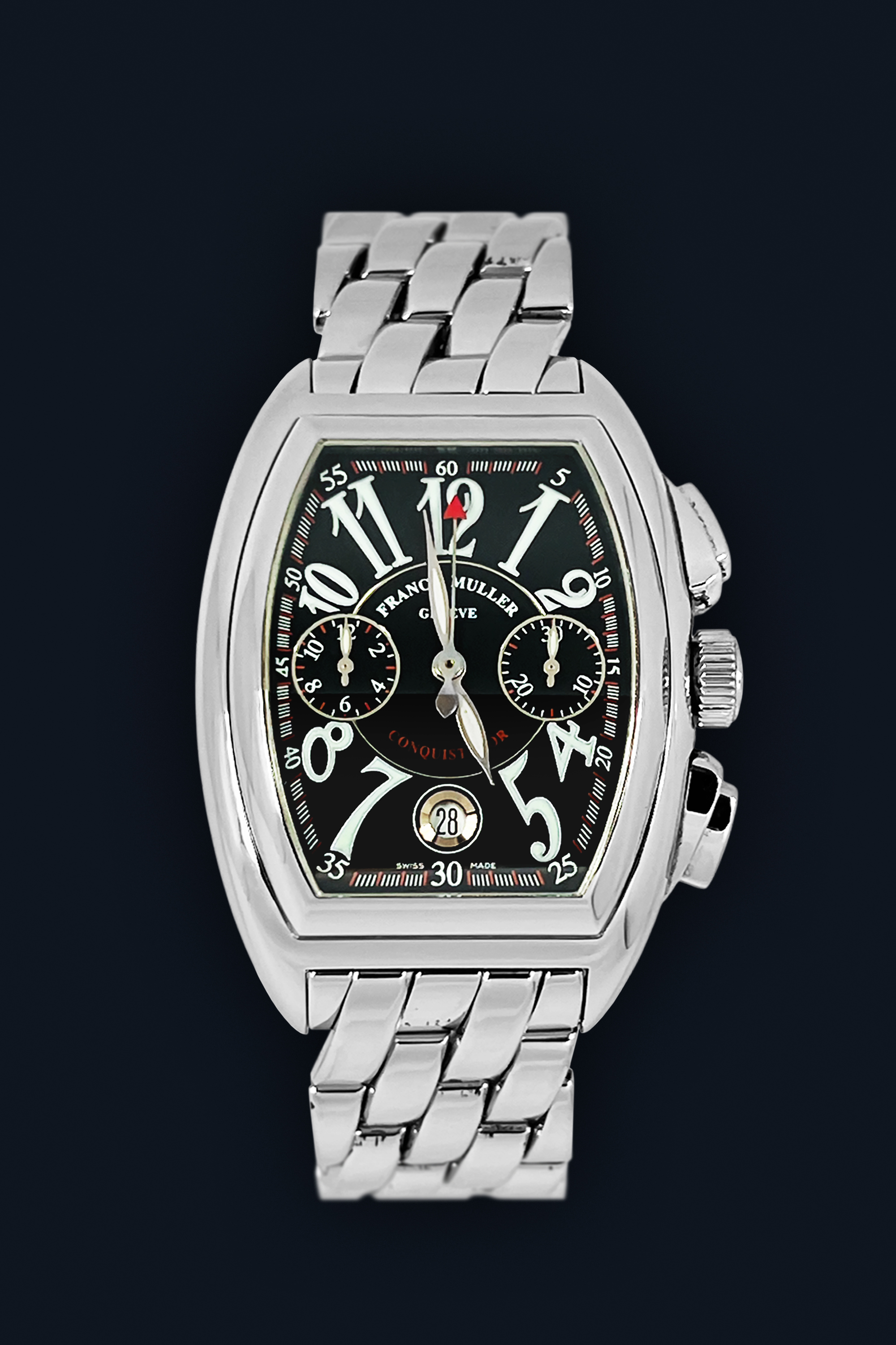 DialBlack dial, signed ‘Franck Muller Geneve Conquistador’, ‘leaf’ hour and minute hands, luminous, ‘stick’ chrono central seconds hand with ‘olive’ counterweight and red triangle tip, chapter ring with white luminous Art-deco Arabic numerals, outer white and red minute/seconds track with 5-minute markings by Arabic numerals, recessed sub-dials of 12-hour counter at 9 o’clock and chrono 30-minute counter at 3 o’clock, date aperture at 6 o’clock