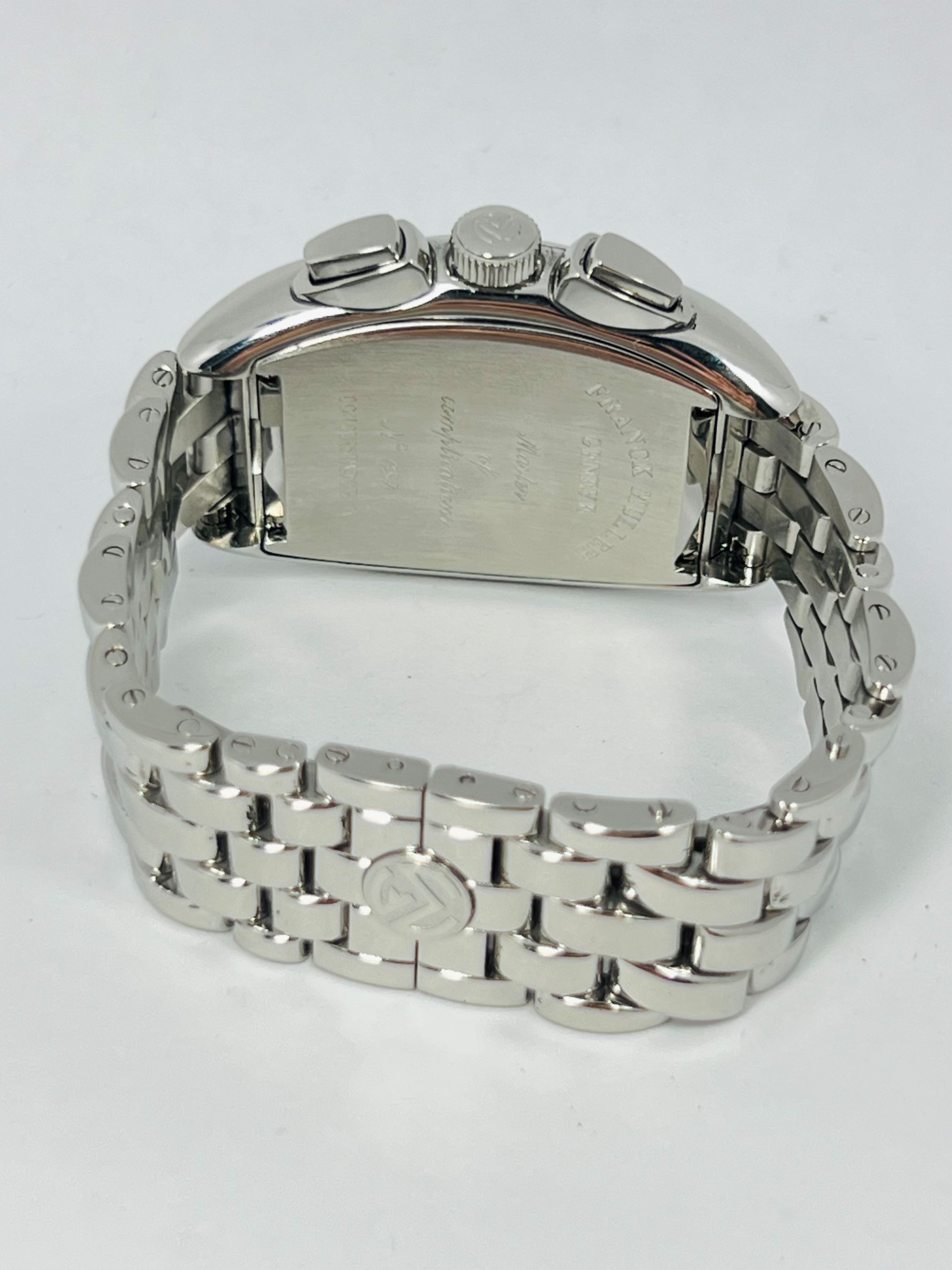CaseTonneau curved case in stainless steel, polished, fixed bezel in stainless steel, polished, solid steel caseback fixed by 4 screws engraved with ‘Franck Muller Geneve Master of Complications Conquistador’, reference and case number, winding crown at 3 o’clock with ‘FM’ logo embossed, shaped chronograph pushers at 2 and 4 o’clock in protective case protrusions