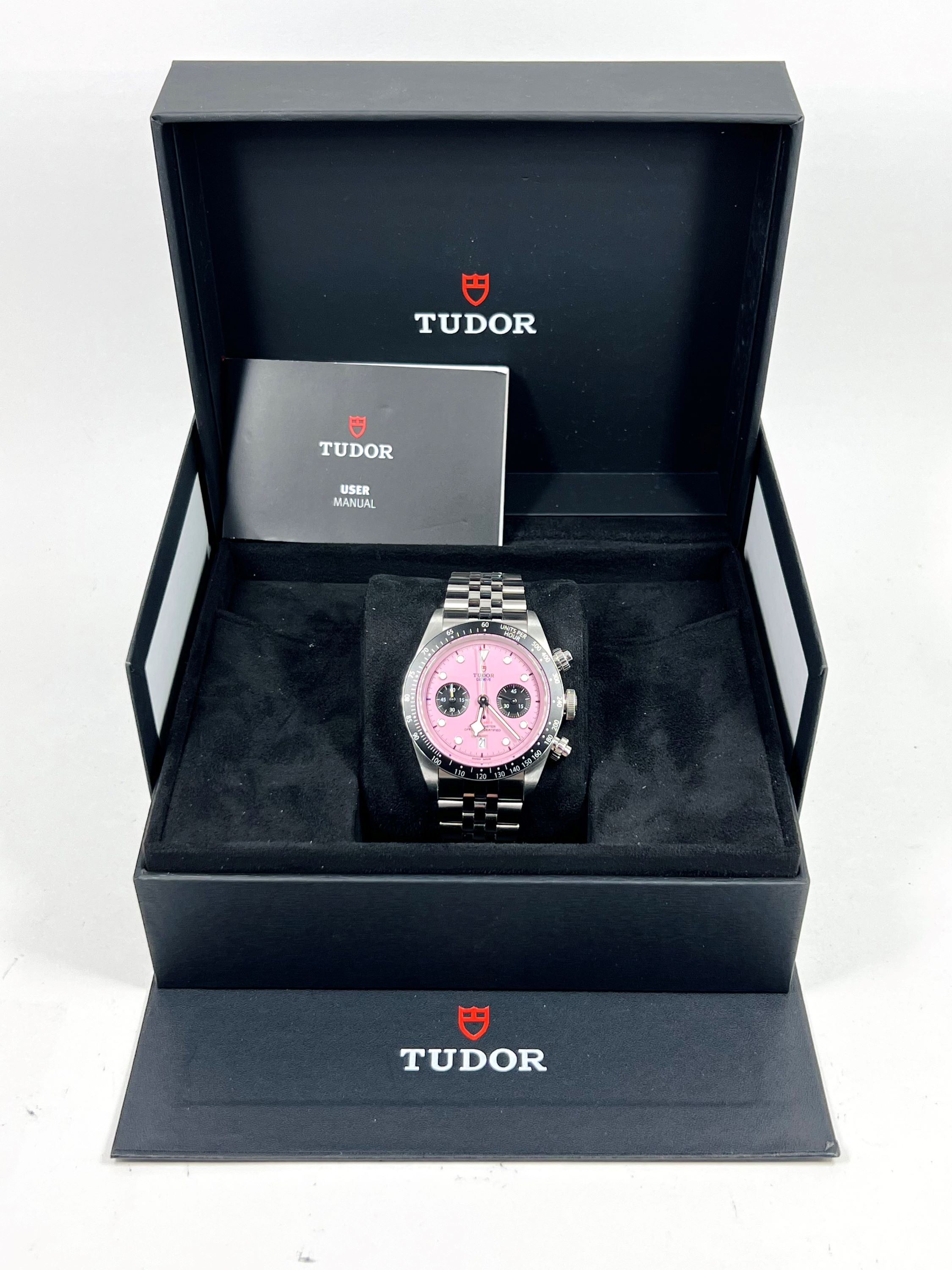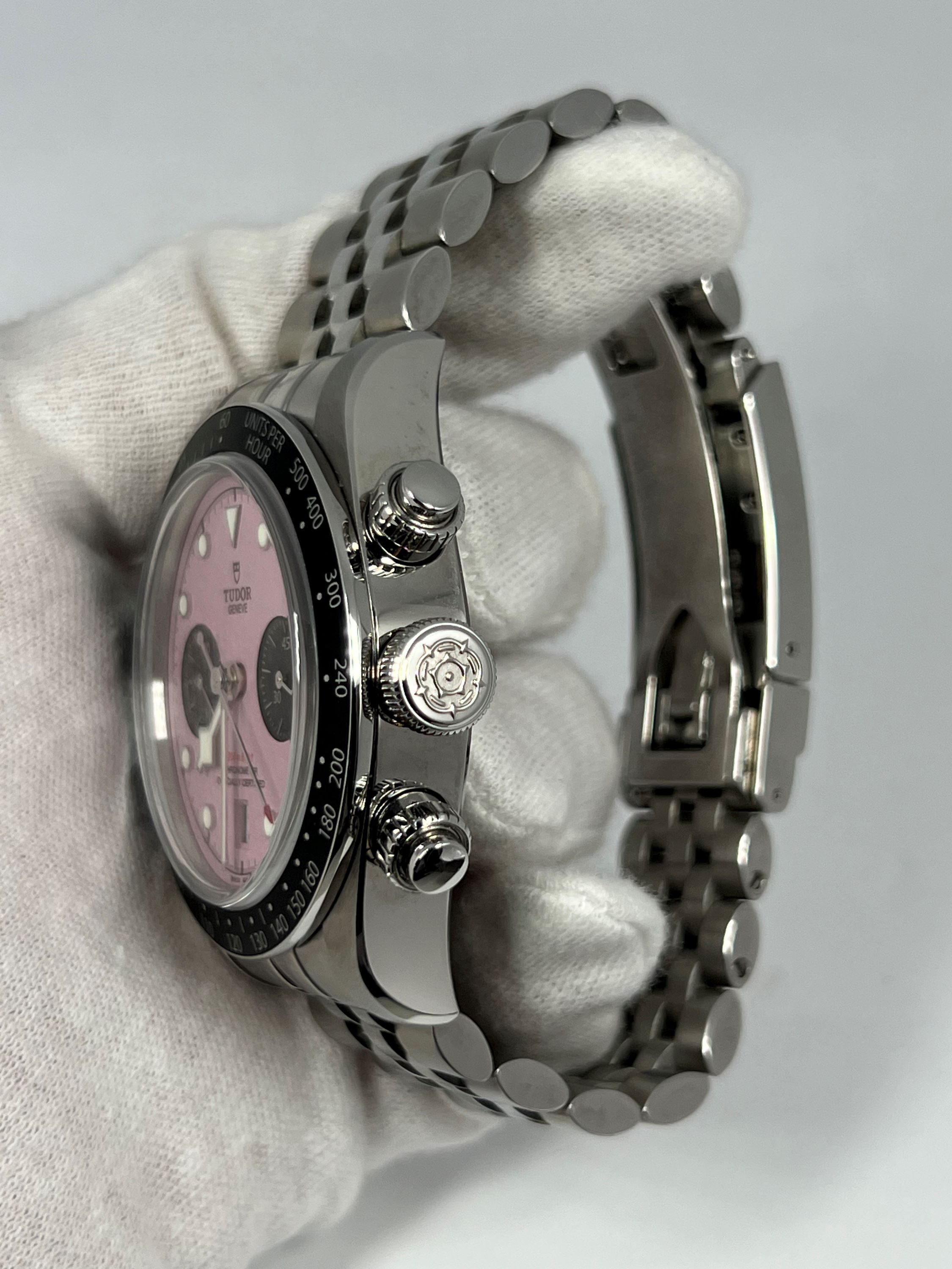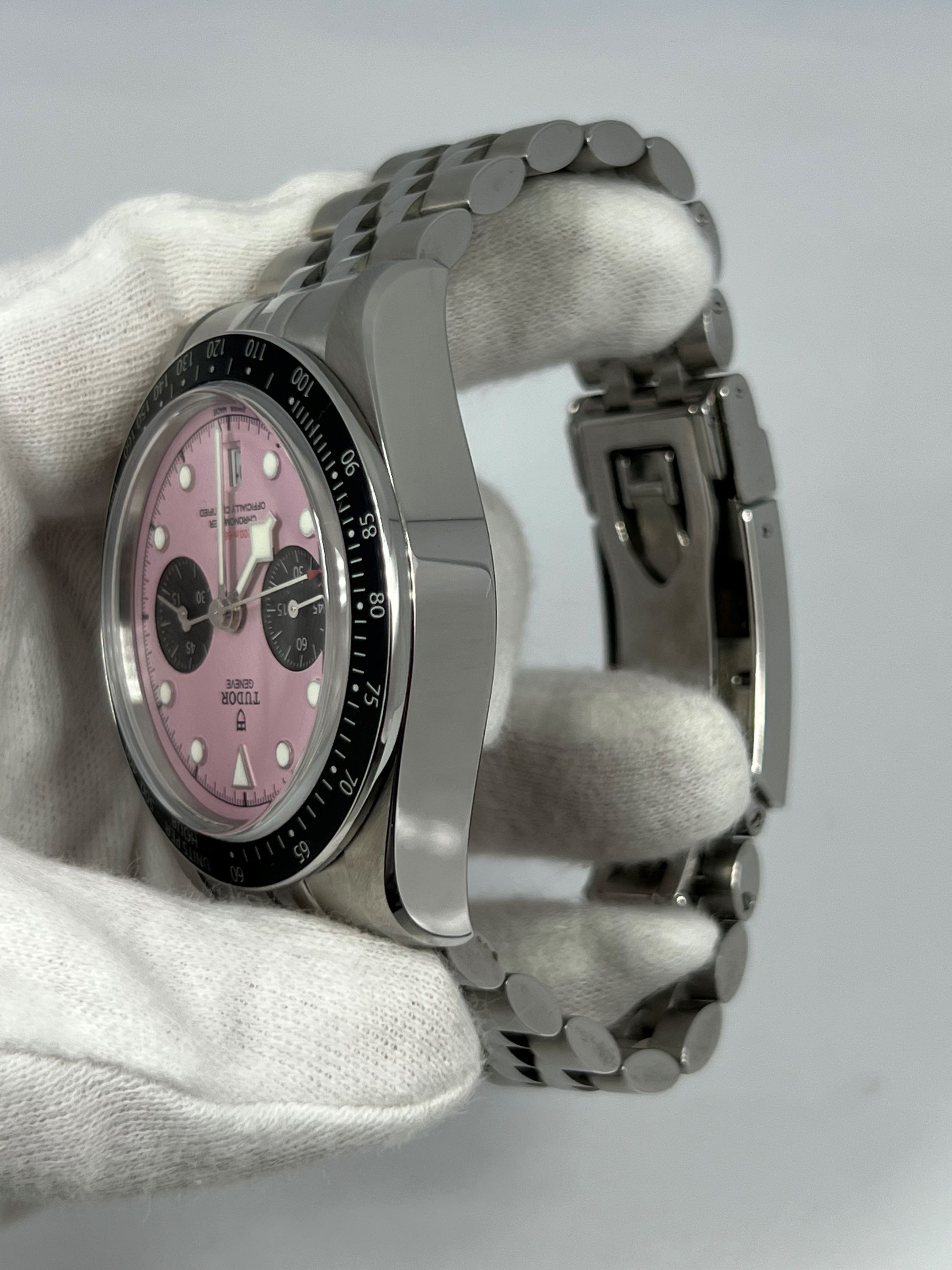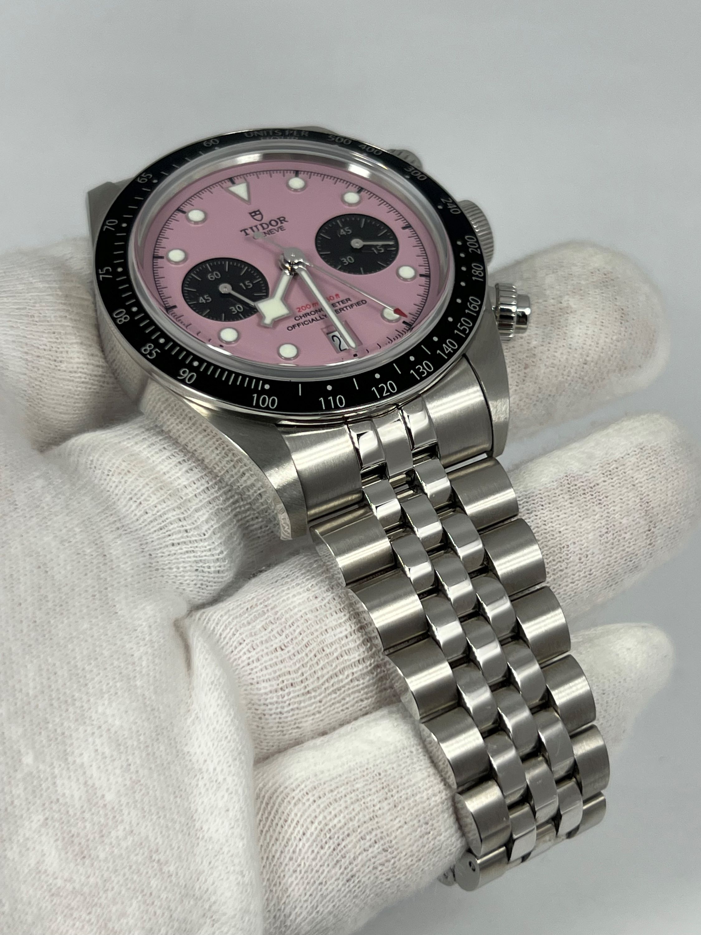DialMatt pink dial as a reference to various Tudor ambassadors & supported ventures, such as Jay Chou (favorite color), Giro d’Italia (leader’s jersey) and Inter Miami CF, dial signed ‘Tudor Geneve’, luminous applied hour markers – round and triangle at 12 o’clock, ‘Snowflake’ hands, luminous, polished ‘stick’ central chronograph seconds hand with red ‘arrow’ tip, black recessed counters with inclined outline of small seconds at 9 o’clock and chrono 45-minute counter at 3 o’clock, outer minute and 1/4-second track