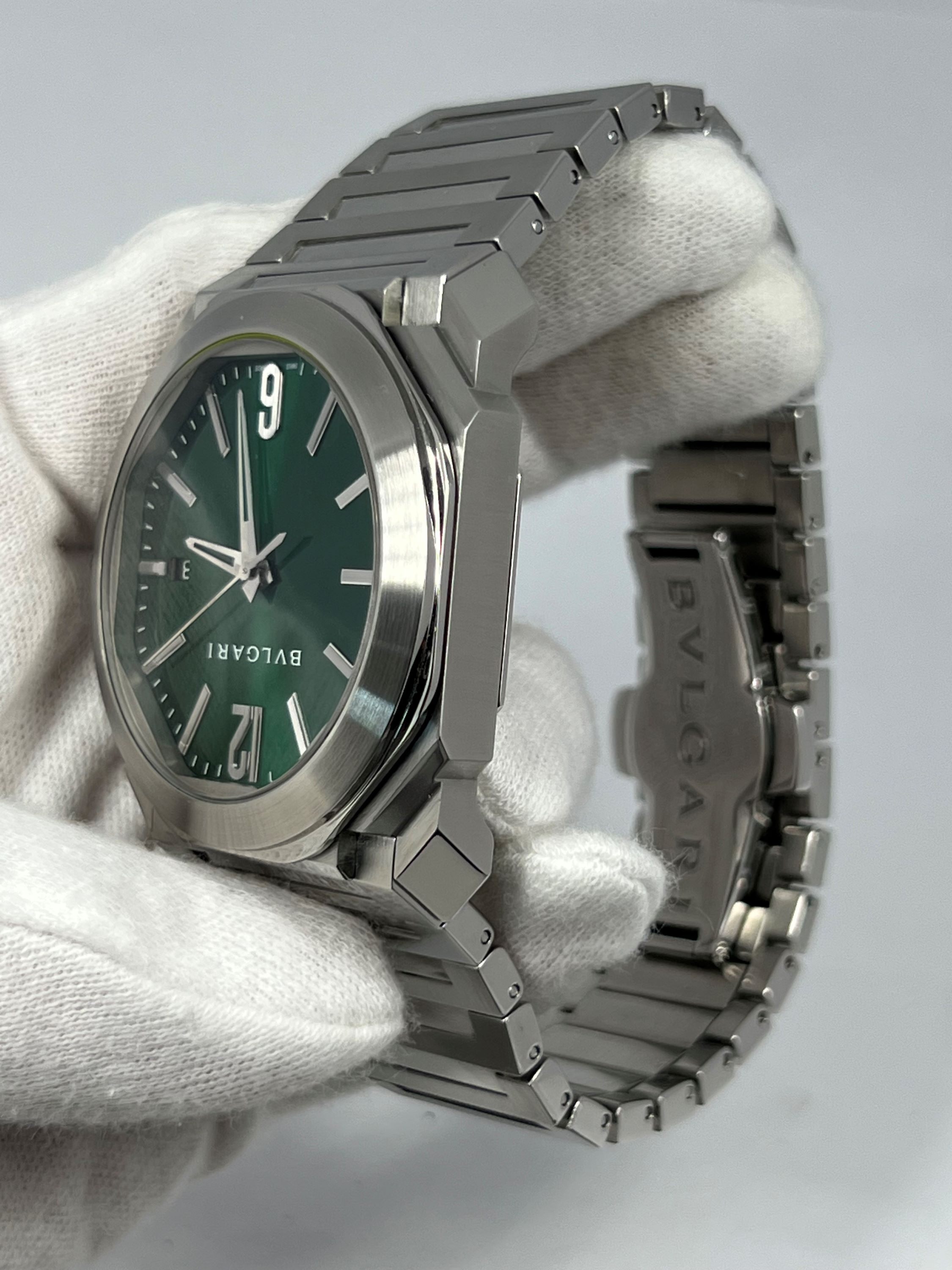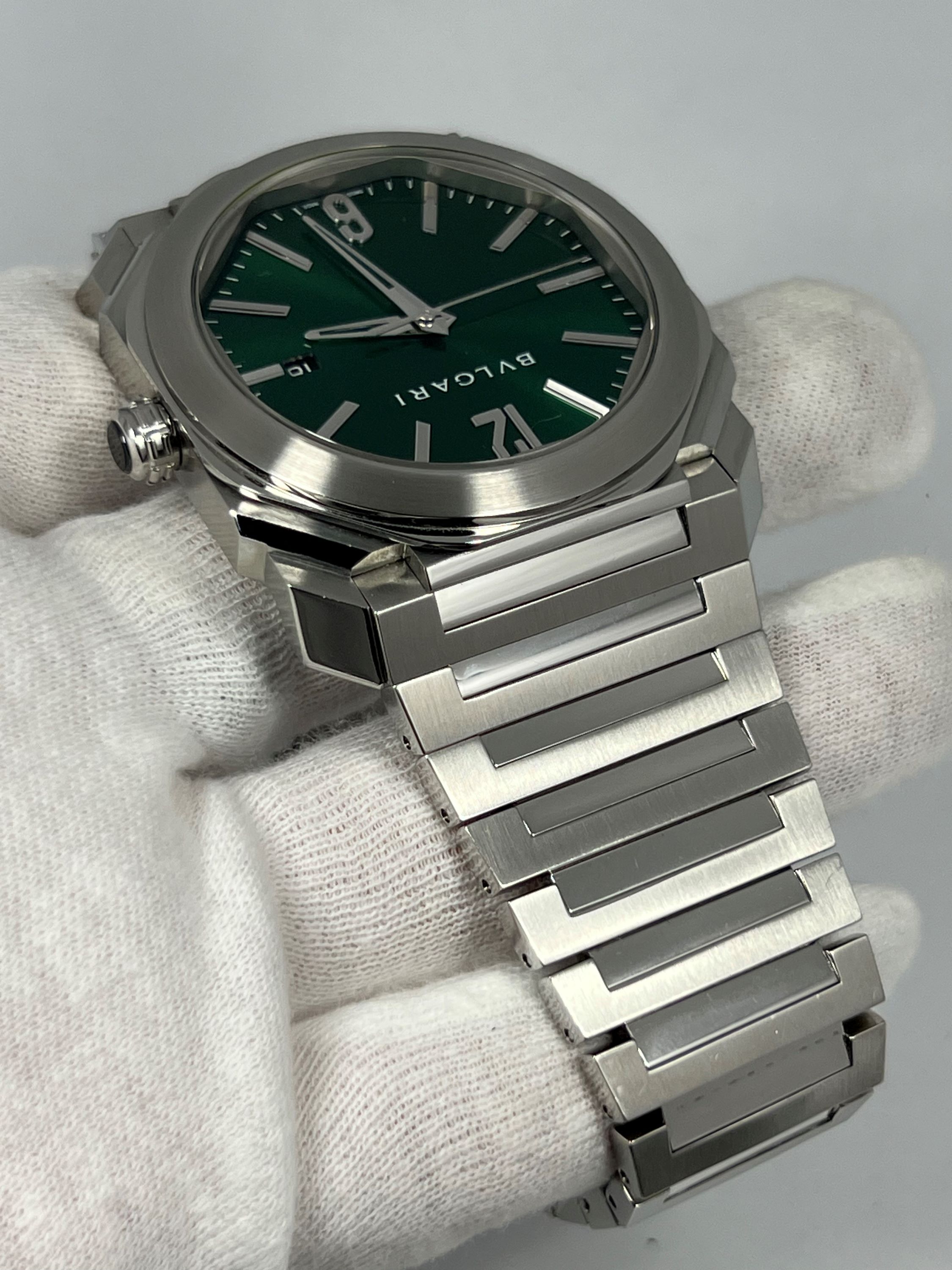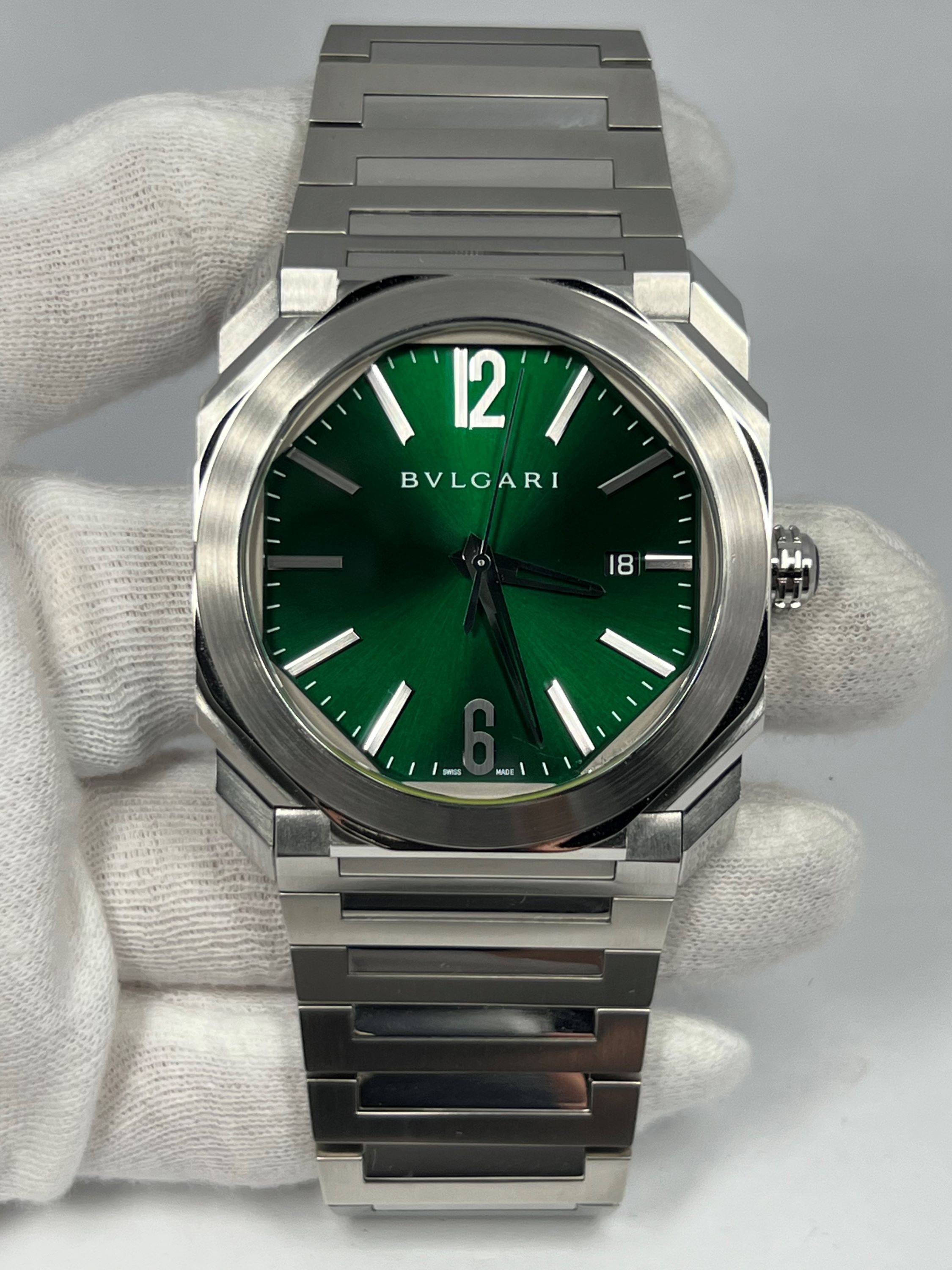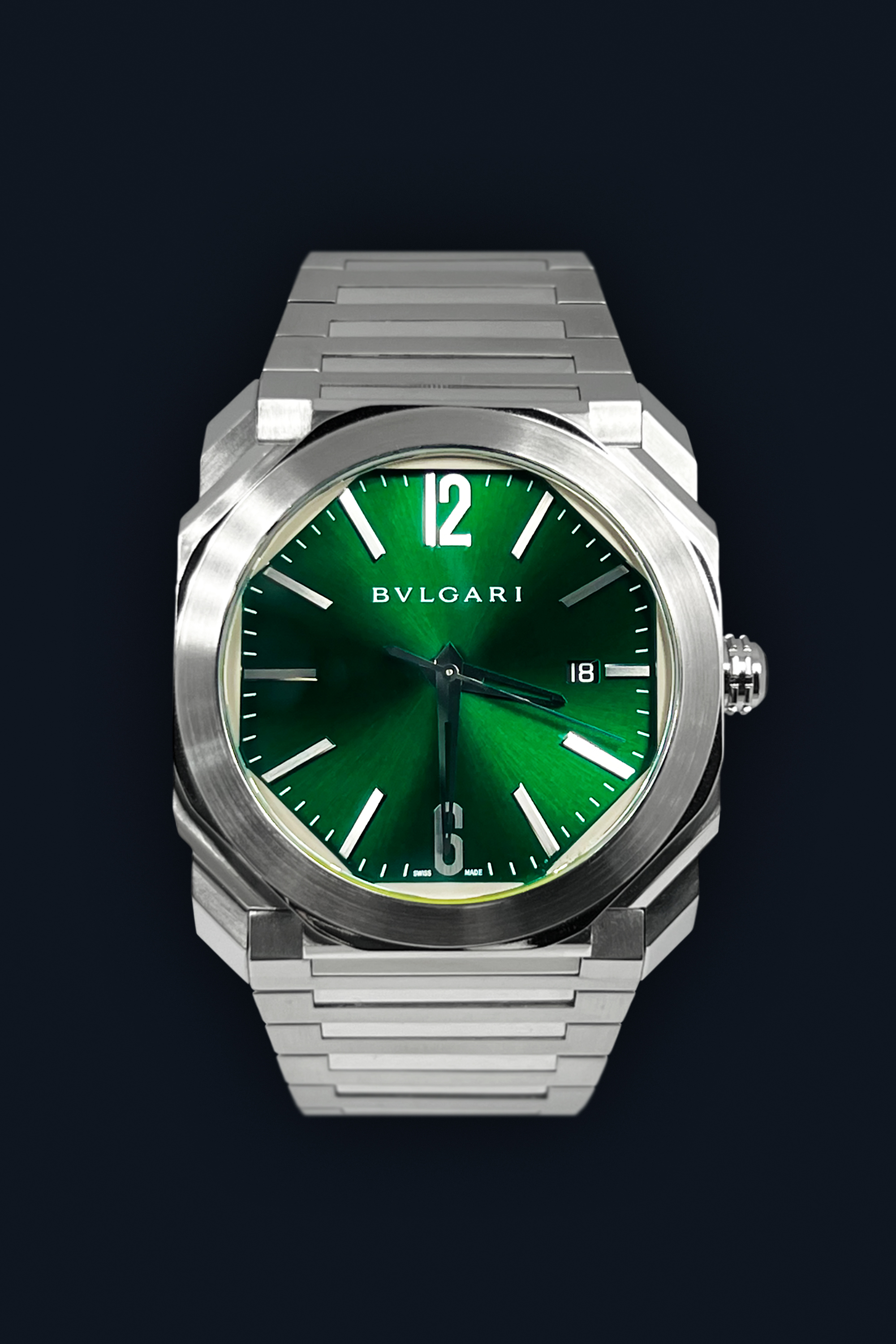 DialSunburst green dial, signed “Bvlgari”, embossed ‘stripe’ indexes and 12 and 6 |Arabic numerals, open-worked ‘Dauphine’ hour and minute hands, ‘stick’ central seconds hand, date aperture at 3 o’clock