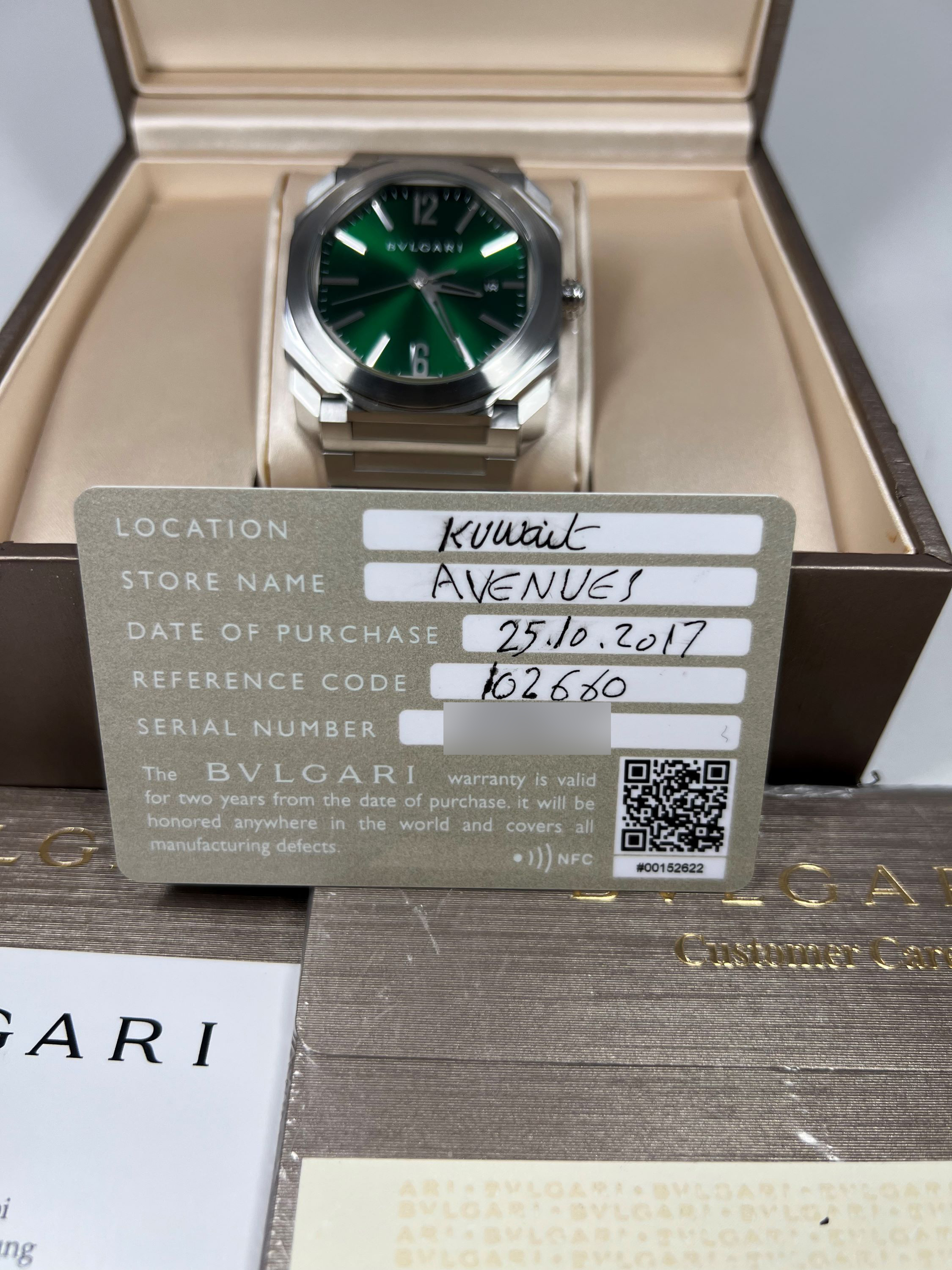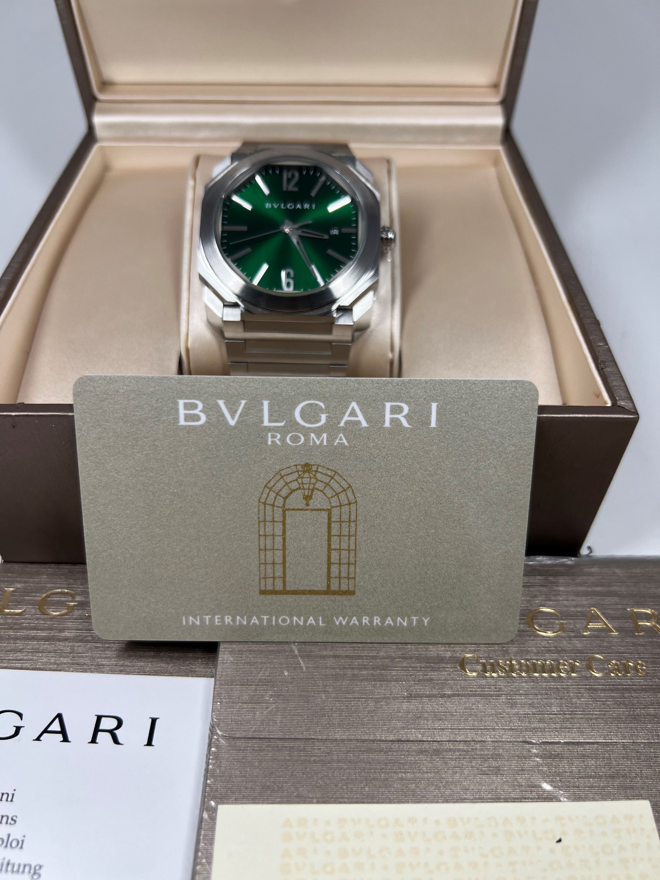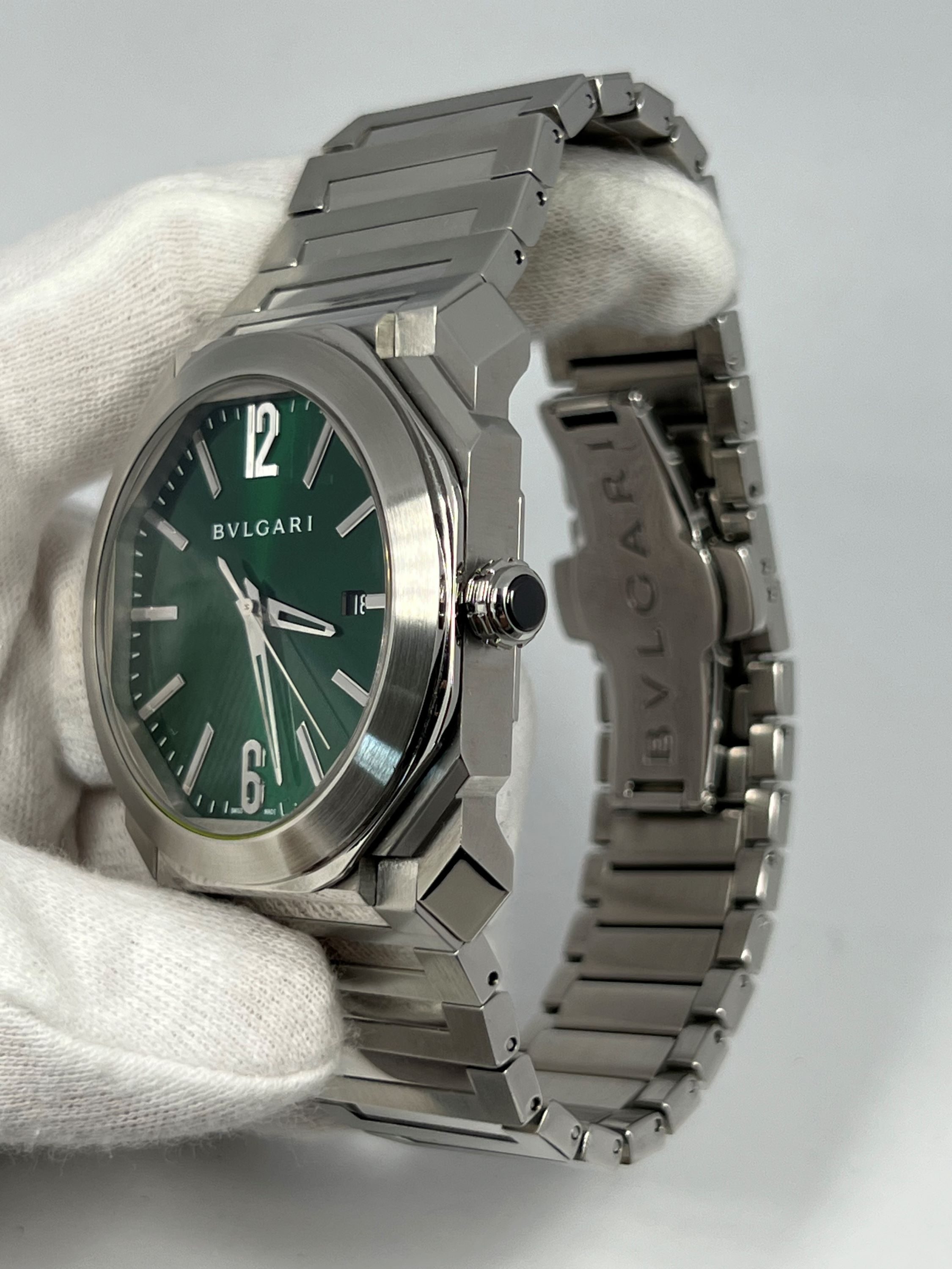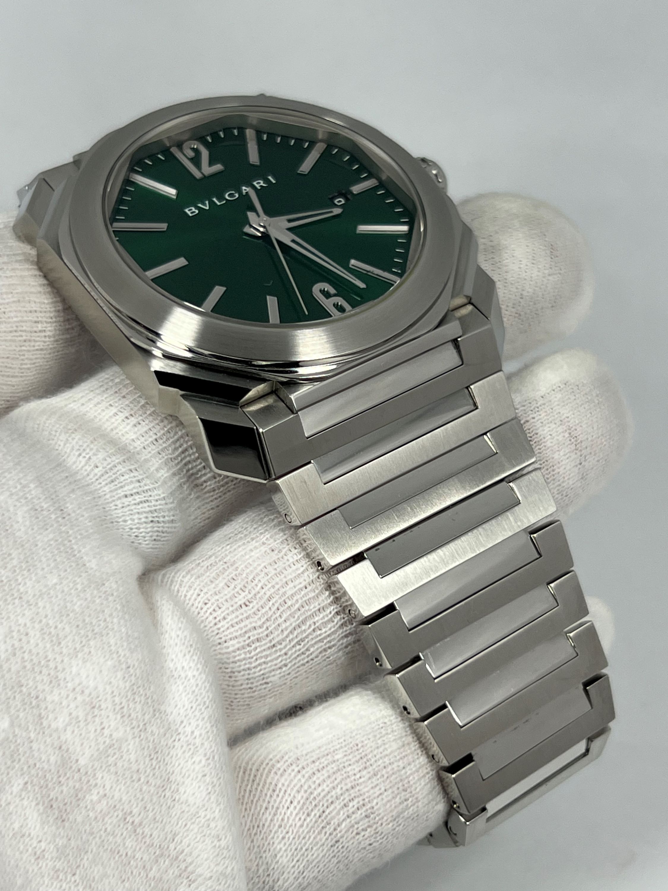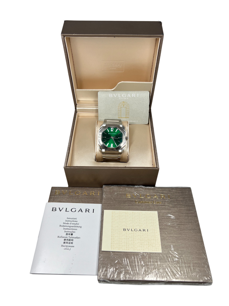 DialSunburst green dial, signed “Bvlgari”, embossed ‘stripe’ indexes and 12 and 6 |Arabic numerals, open-worked ‘Dauphine’ hour and minute hands, ‘stick’ central seconds hand, date aperture at 3 o’clock