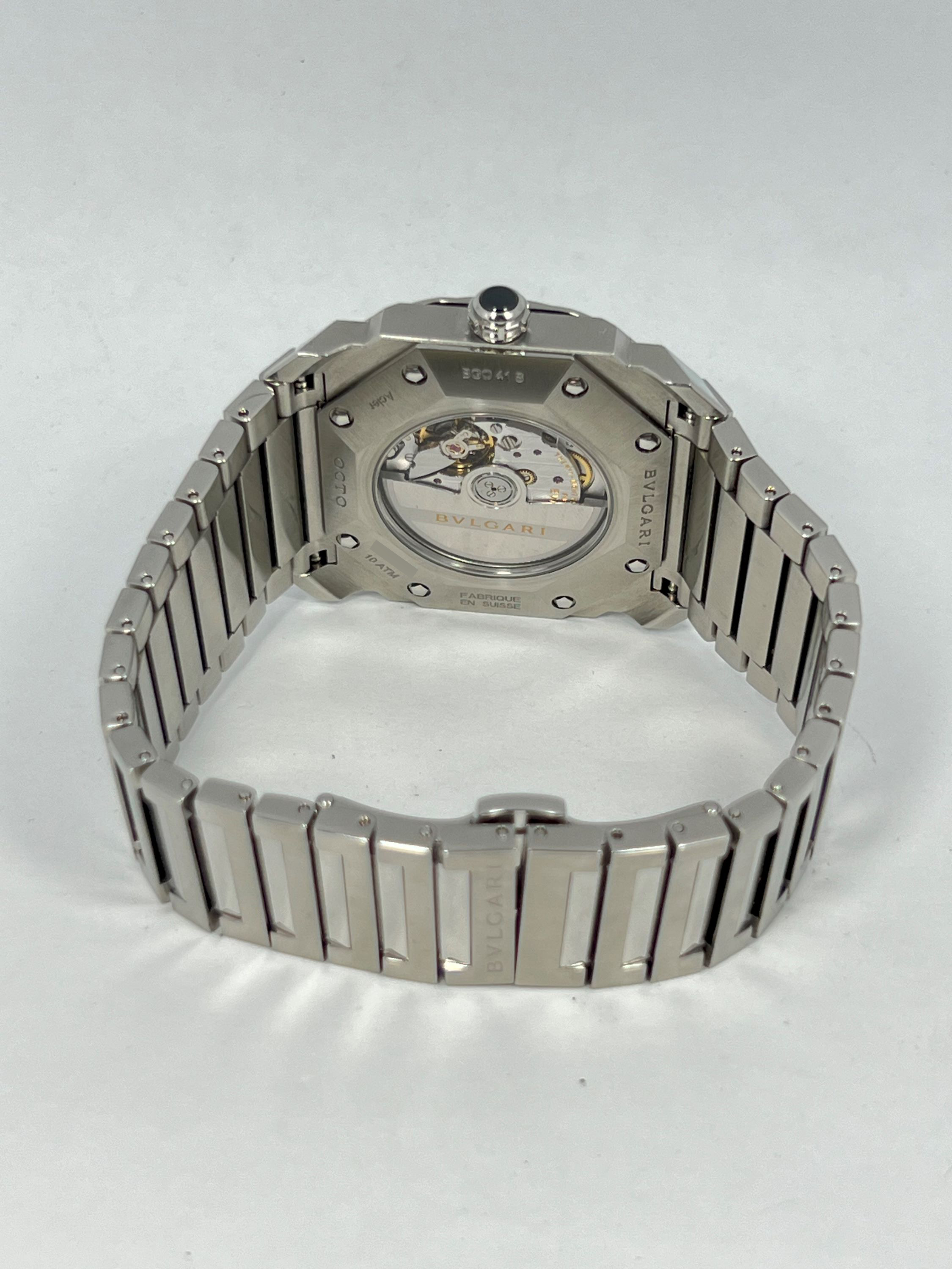 CaseOctagonal case in stainless steel, brushed and polished, fixed bezel in stainless steel, brushed and polished, exhibition caseback fixed on 8 screws, with ‘Bvlgari Octo’, reference and case numbers engraved, winding crown at 3 o’clock with black ceramic insert