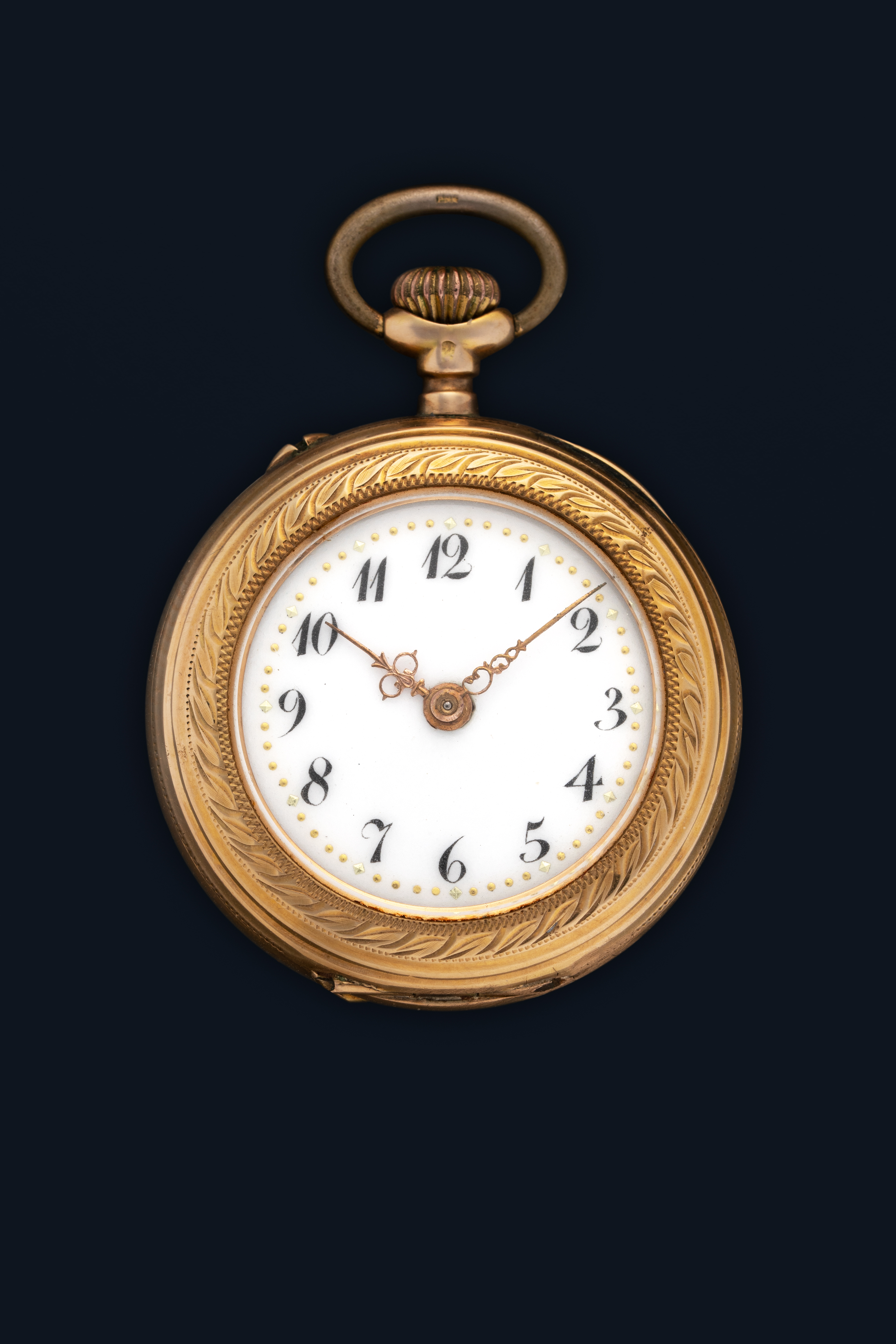 Small Pocket Watch in 14k Yellow Gold with Enamel Decoration