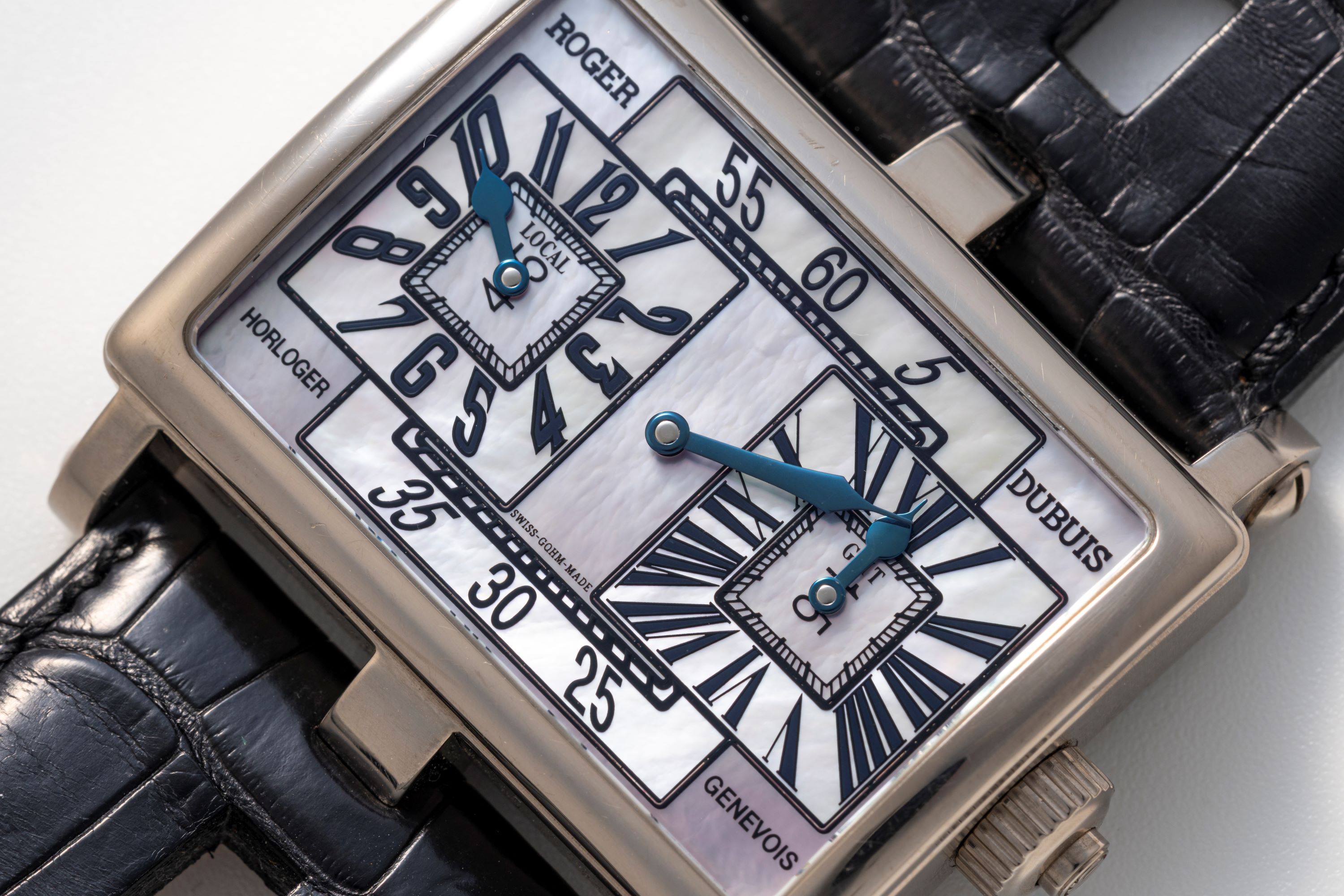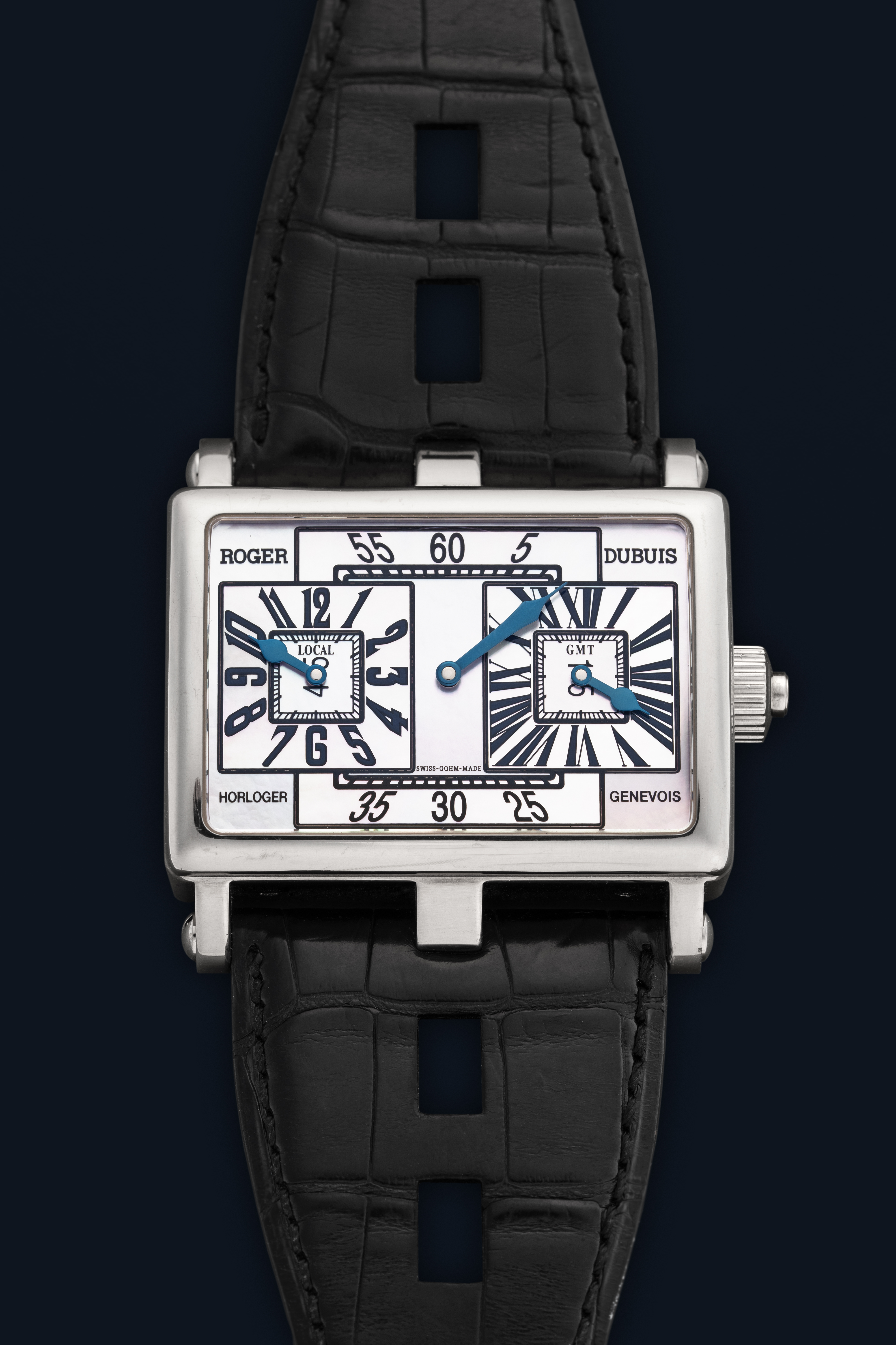 DialMother of pearl dial with complex layout, heat-blued hands, local time dial on the left side, GMT dial on the right side, central minutes hand, signed 'Roger Dubuis Horloger Genevois' in each corner
