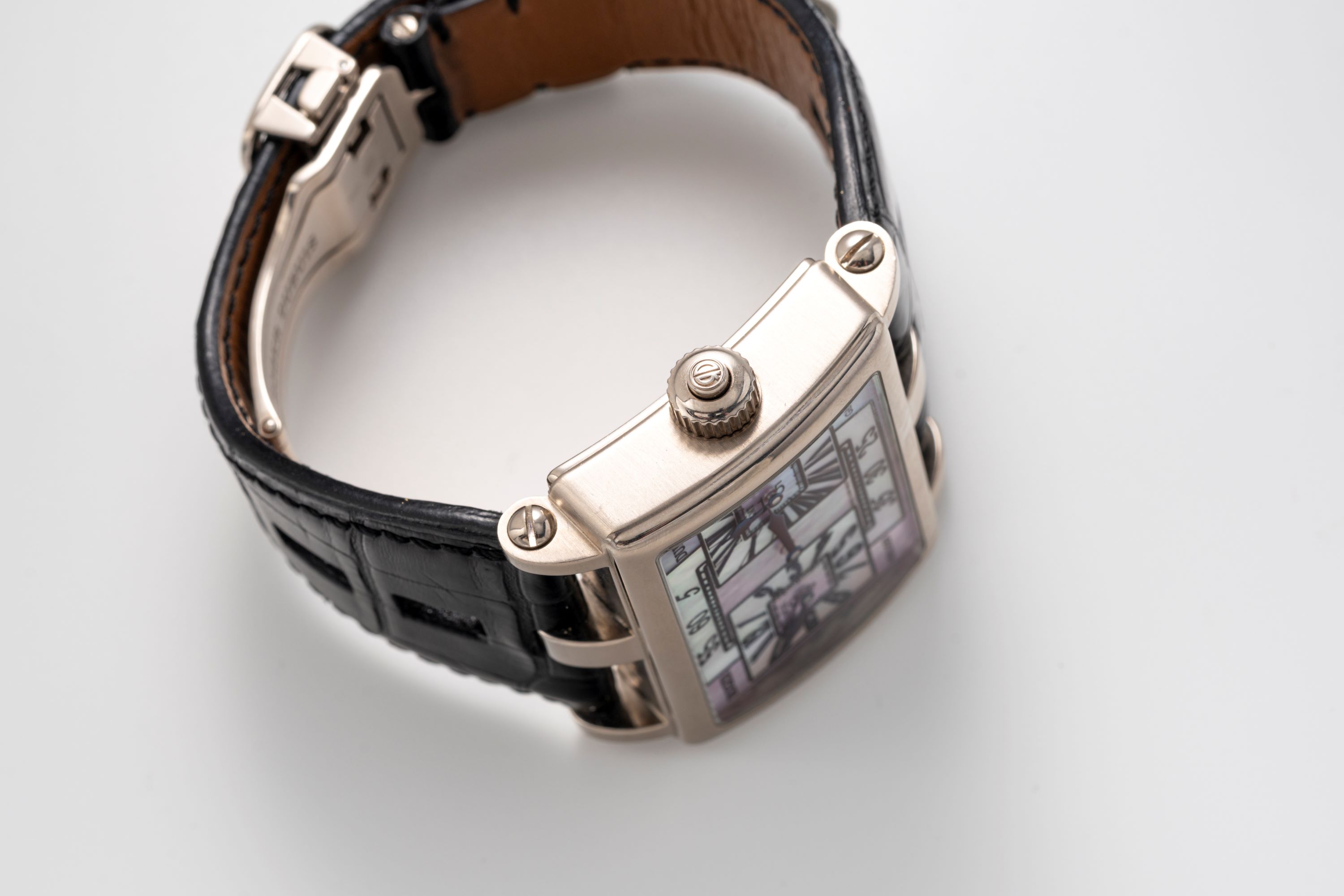 CaseRectangular case in 18k white gold with crown and GMT pusher at 3 o'clock, display caseback