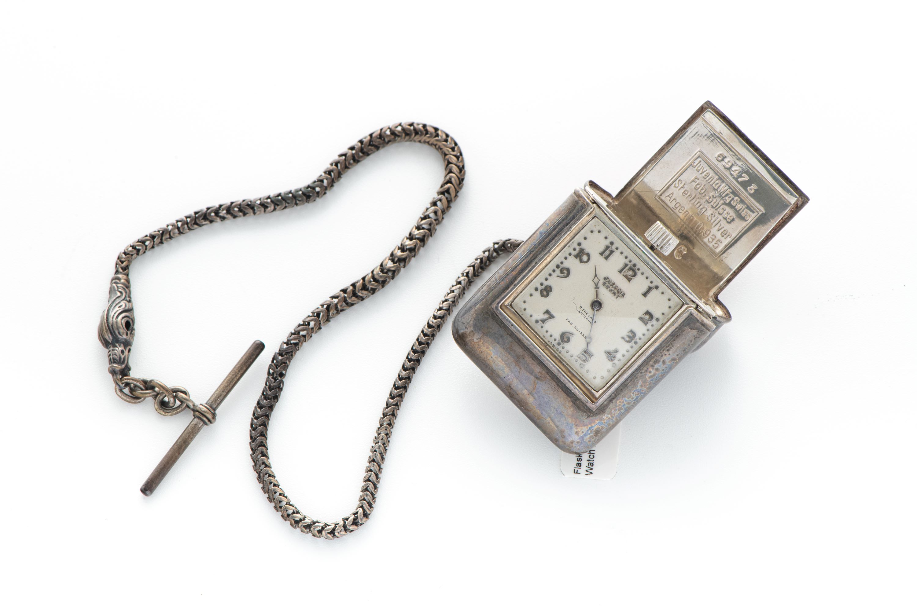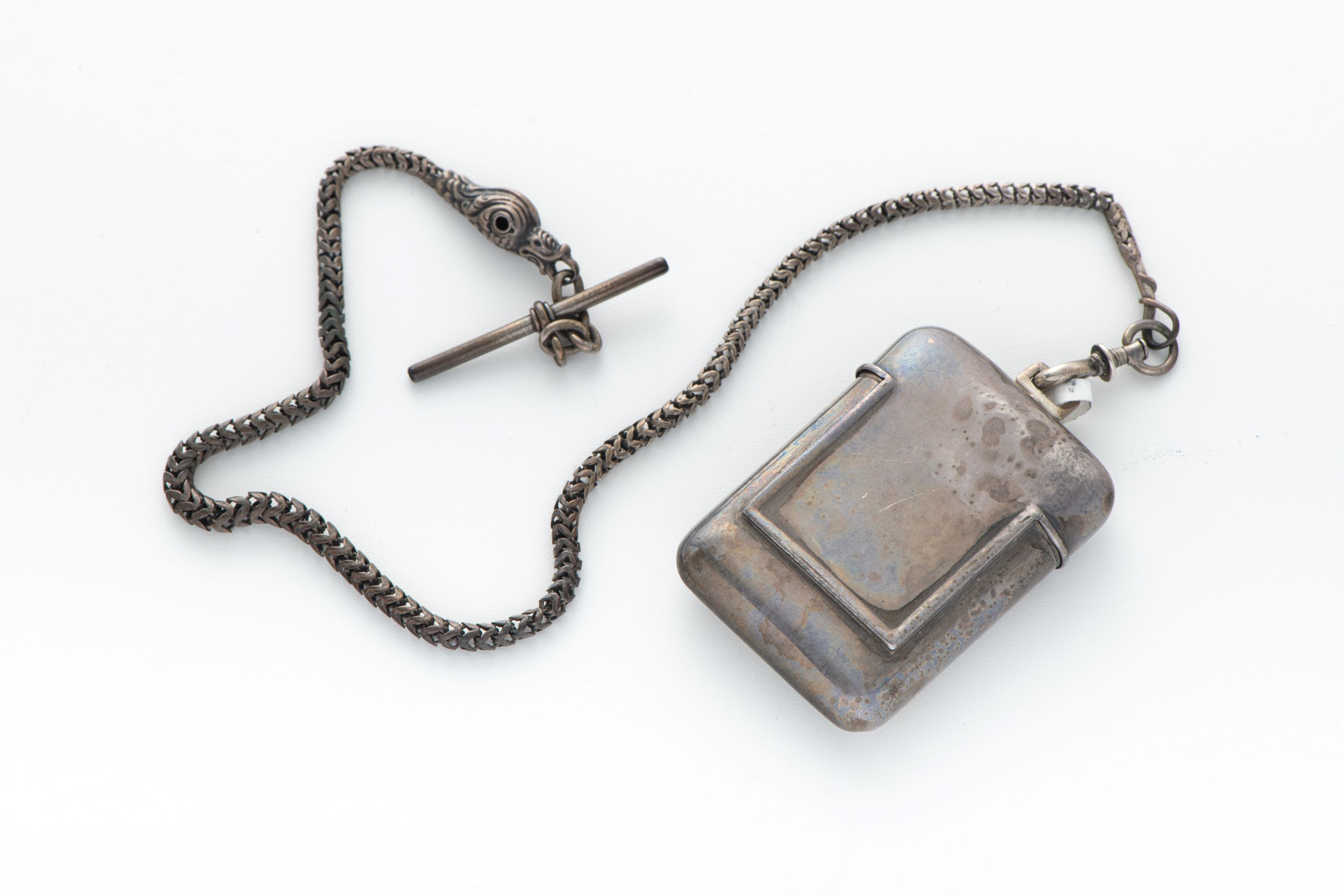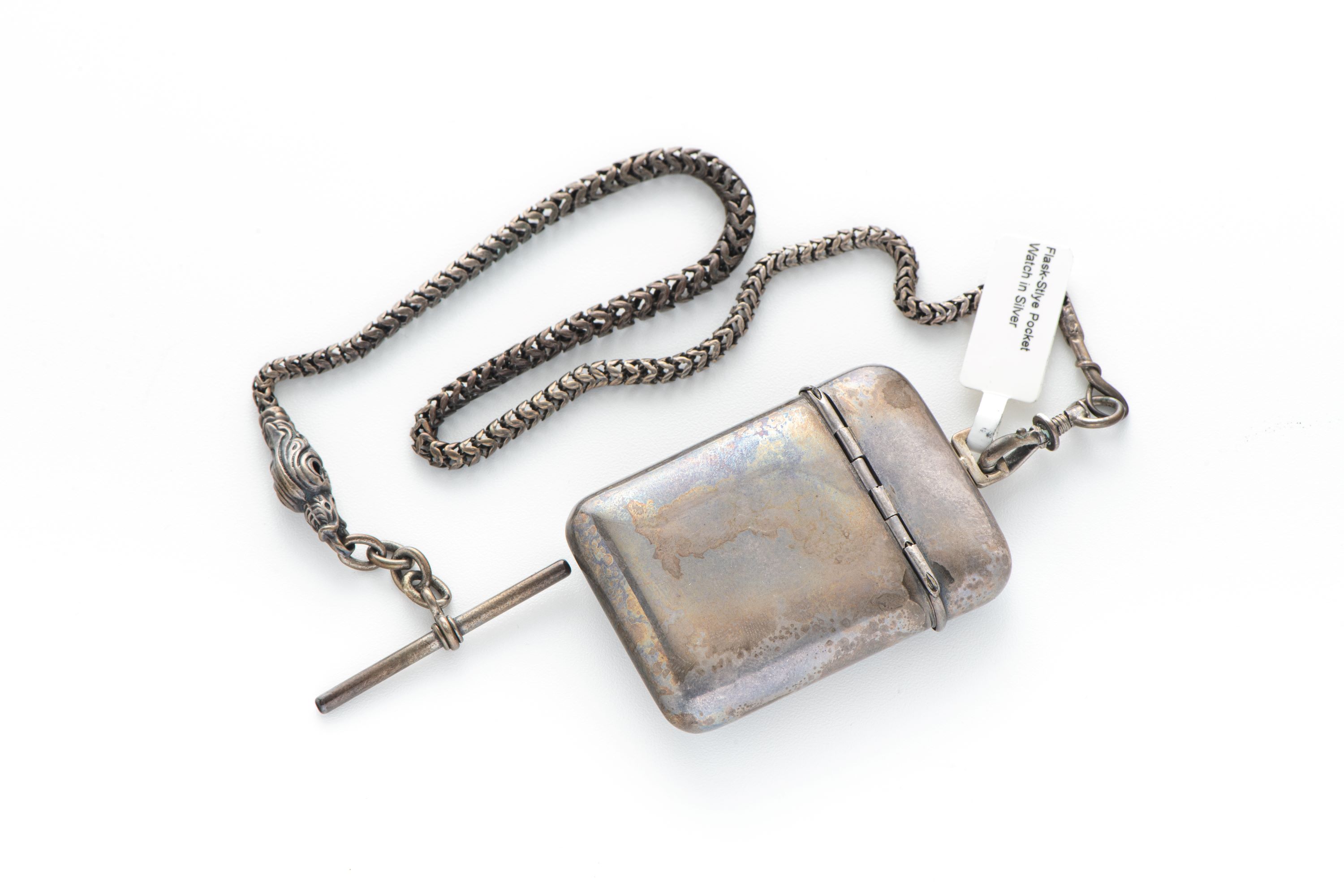 CaseRectangular "flask" case in 935 silver with removable watch inner case, winding crown at 12 o'clock of the inner case