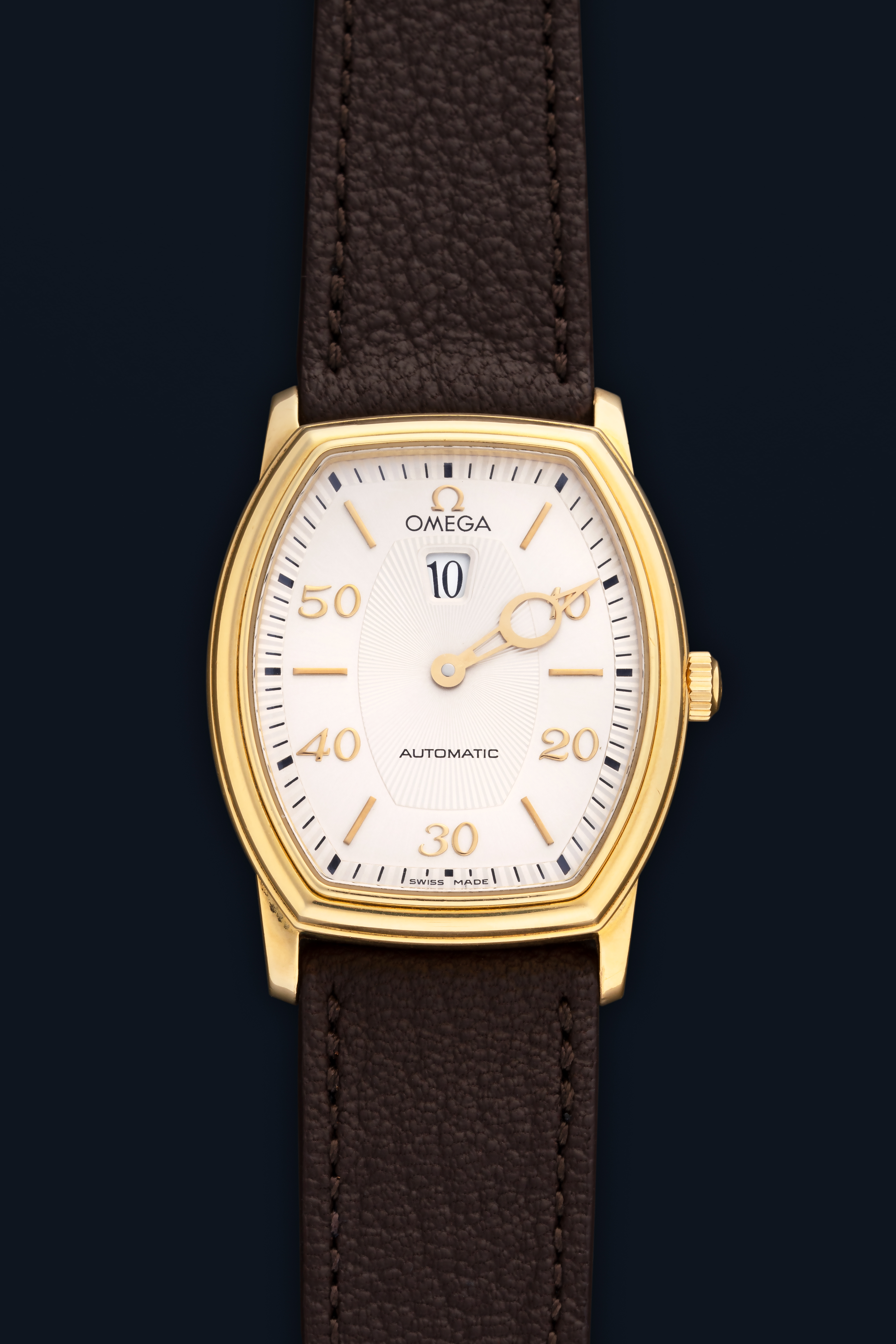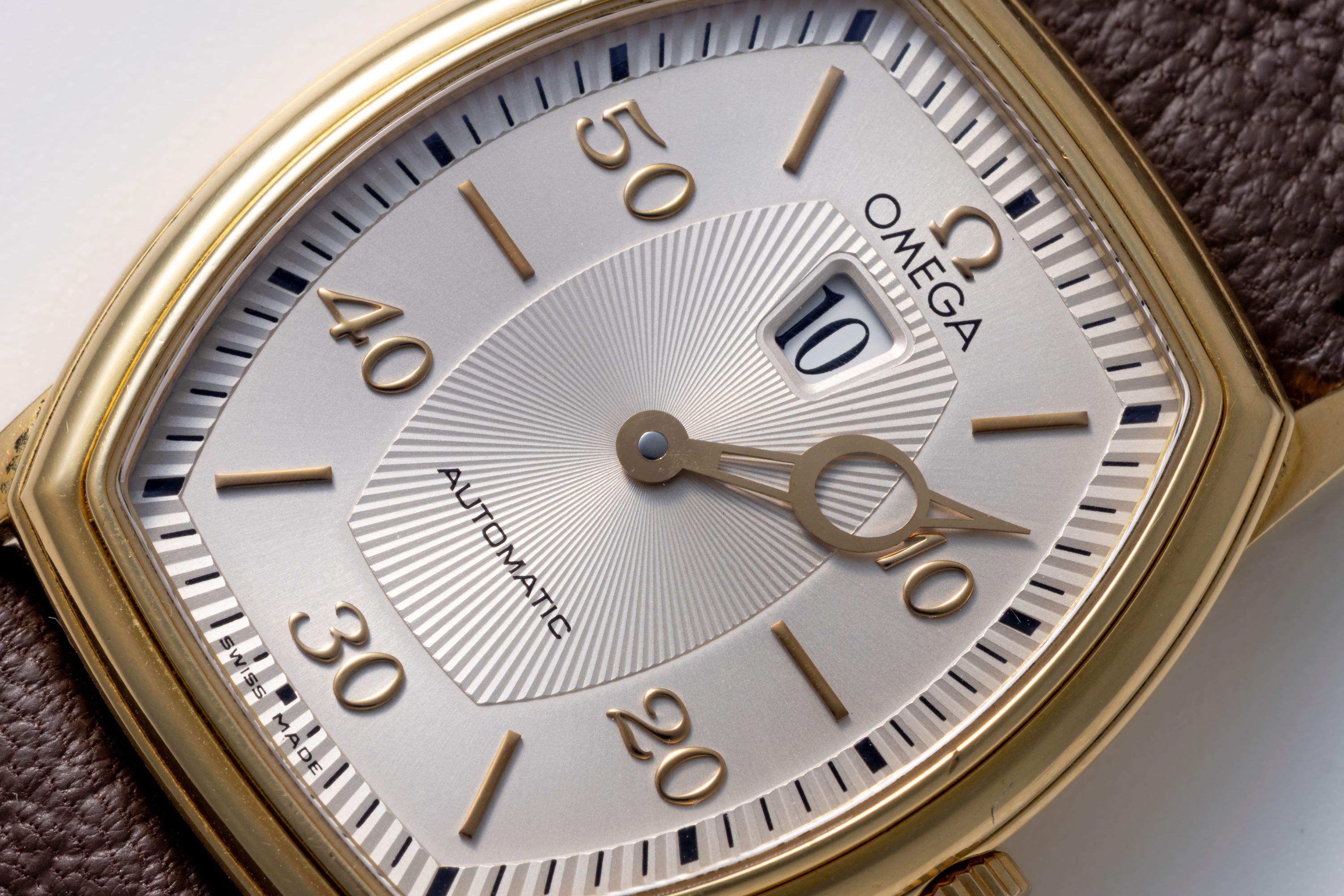DialSilver guilloche dial with applied indices and numerals in gold, jumping hour window at 12 o'clock, large gold minute hand with hole for hour display even when the window is covered, signed 'Omega' at 12 o'clock