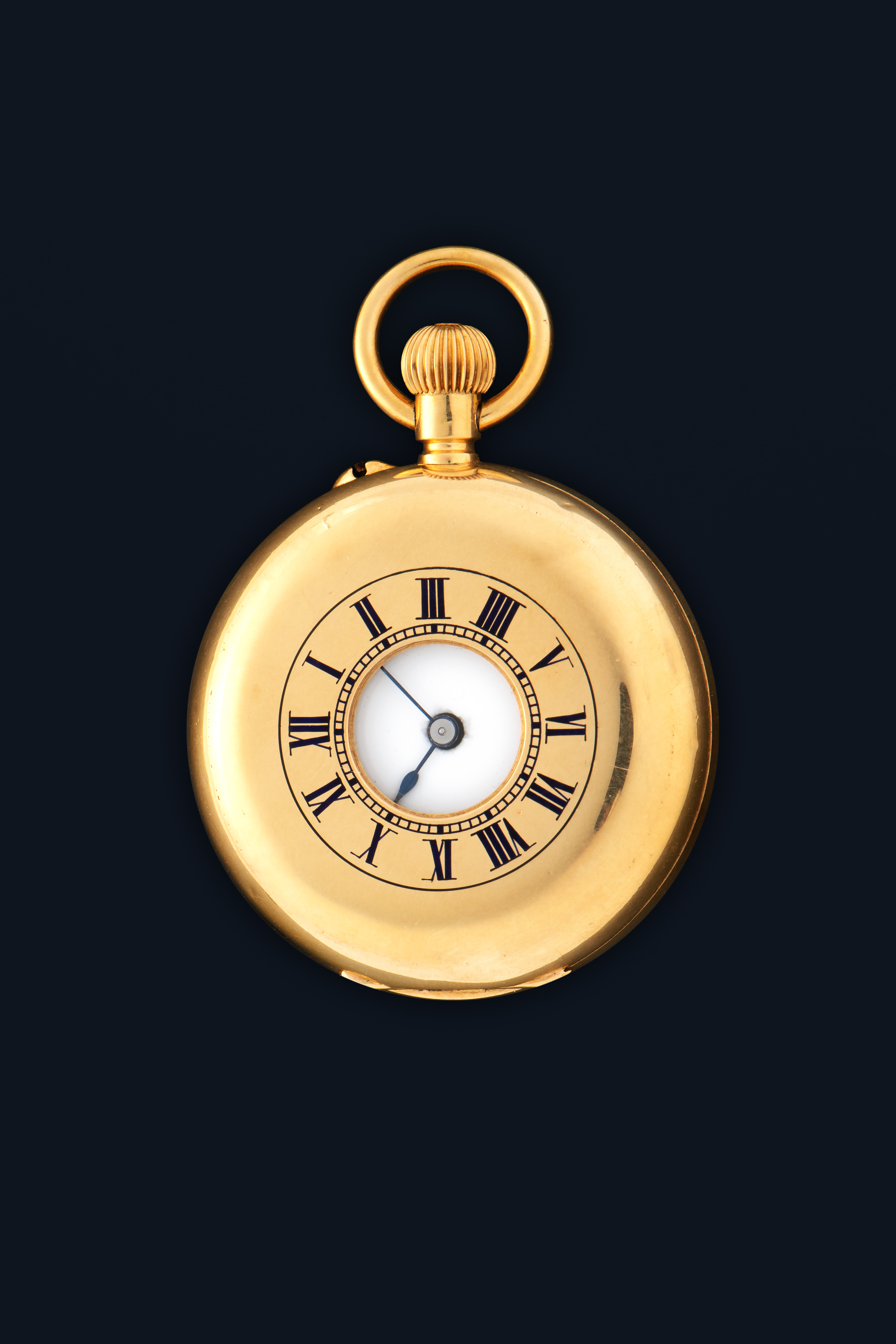 CaseRound case in 18k yellow gold with half-hunter lid, engraved inscription on the inner caseback: "To the Queen, Le Roy & Fils, 57 New Bond Street London, 13-15 Palais Royal Paris, Made in France'