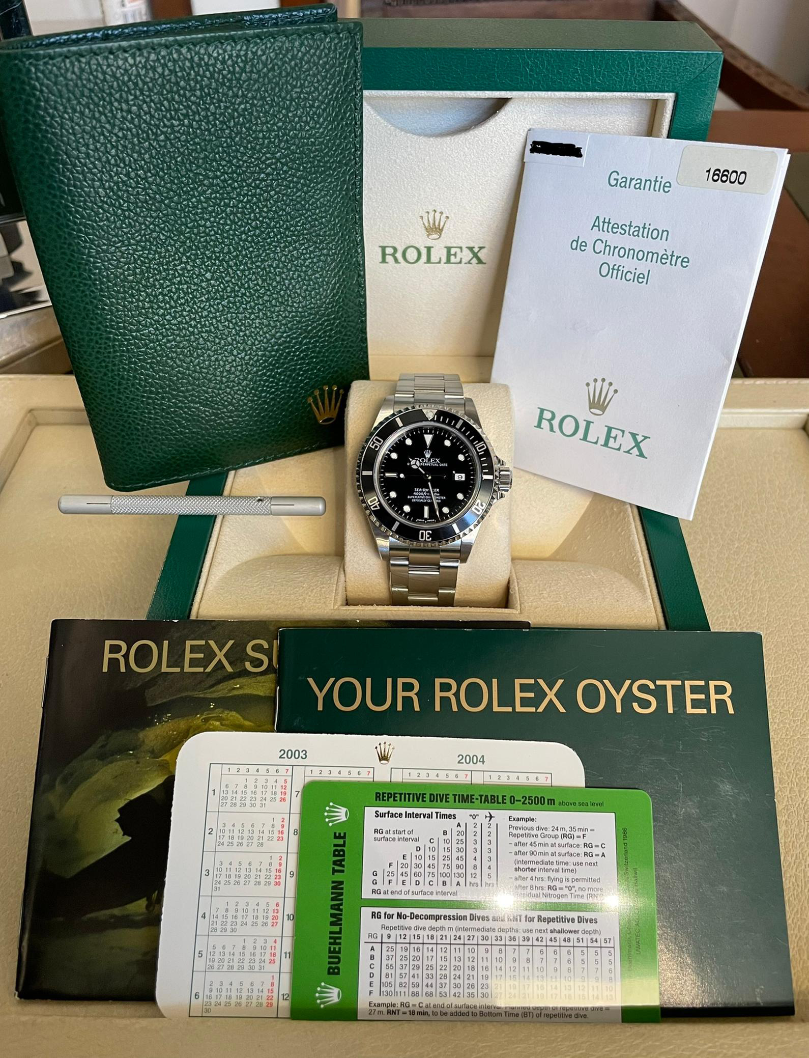 CaseRound case in stainless steel, brushed, unidirectional turning bezel with black insert, diver 60-minute scale and luminous zero marker, screw-down solid steel caseback with “Rolex Oyster Original Gas Escape Valve” and two Rolex coronets engraved and black-filled, screwed winding crown with embossed Rolex coronet at 3 o’clock between protective shoulders of the case, helium escape valve on caseband at 9 o’clock