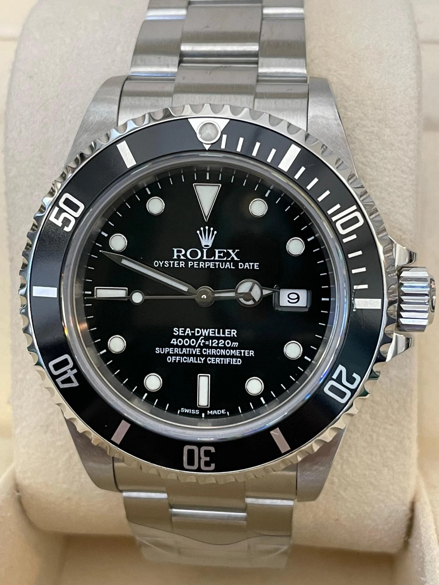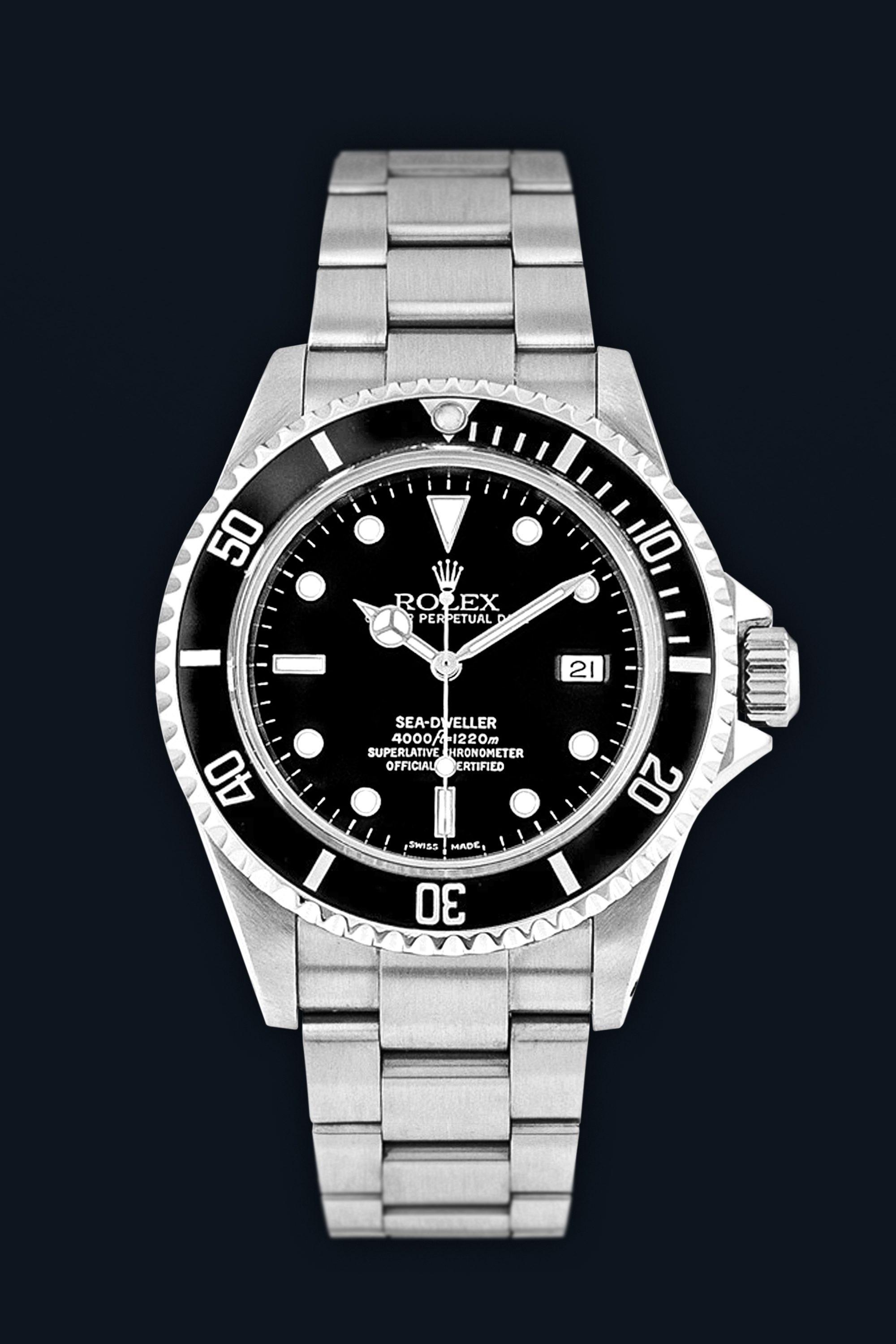 DialBlack dial, signed ‘Rolex Oyster Perpetual Date Sea-Dweller 4000ft/1220m’, luminous filled applied hour markers – round, baton at quarters and triangle at 12 o’clock, polished ‘Mercedes’ hands, luminous, ‘lollipop’ central seconds hand, luminous, date aperture at 3 o’clock