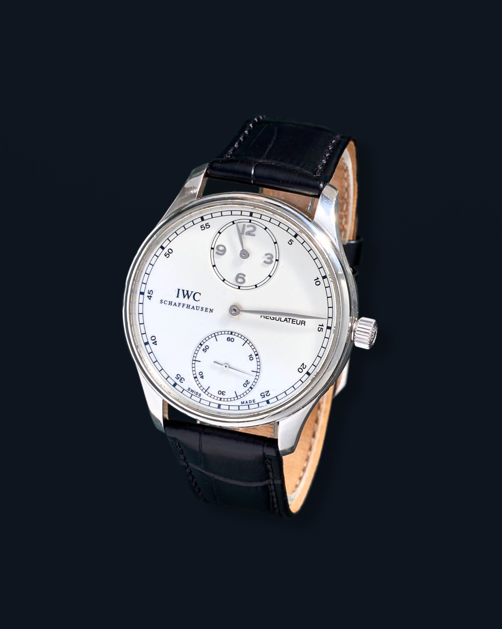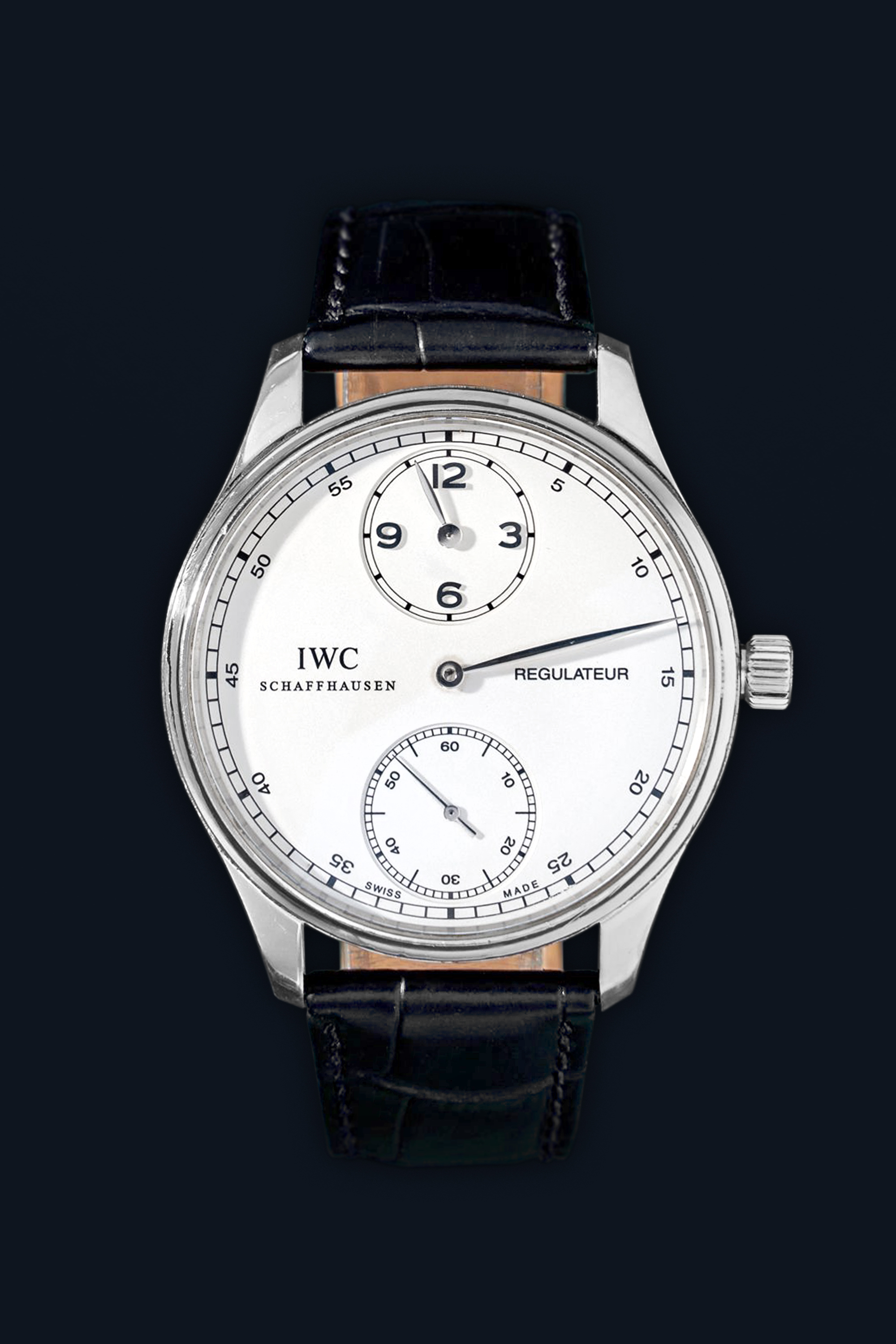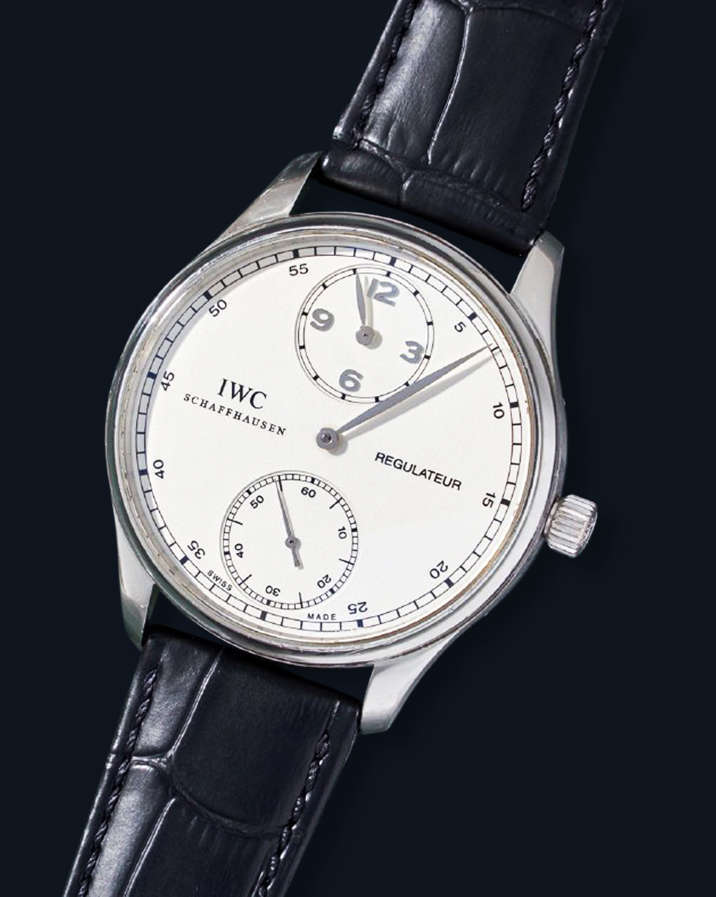 DialWhite regulator dial, signed “IWC Schaffhausen Regulateur”, applied polished Arabic numerals, outer ‘railway’ minute track, polished ‘leaf’ hour hand at 12 o’clock on recessed sub-dial, polished ‘leaf’ central minute hand, recessed small seconds sub-dial at 6 o’clock