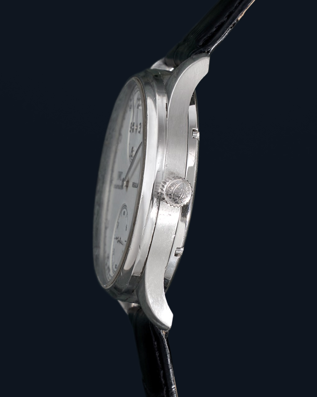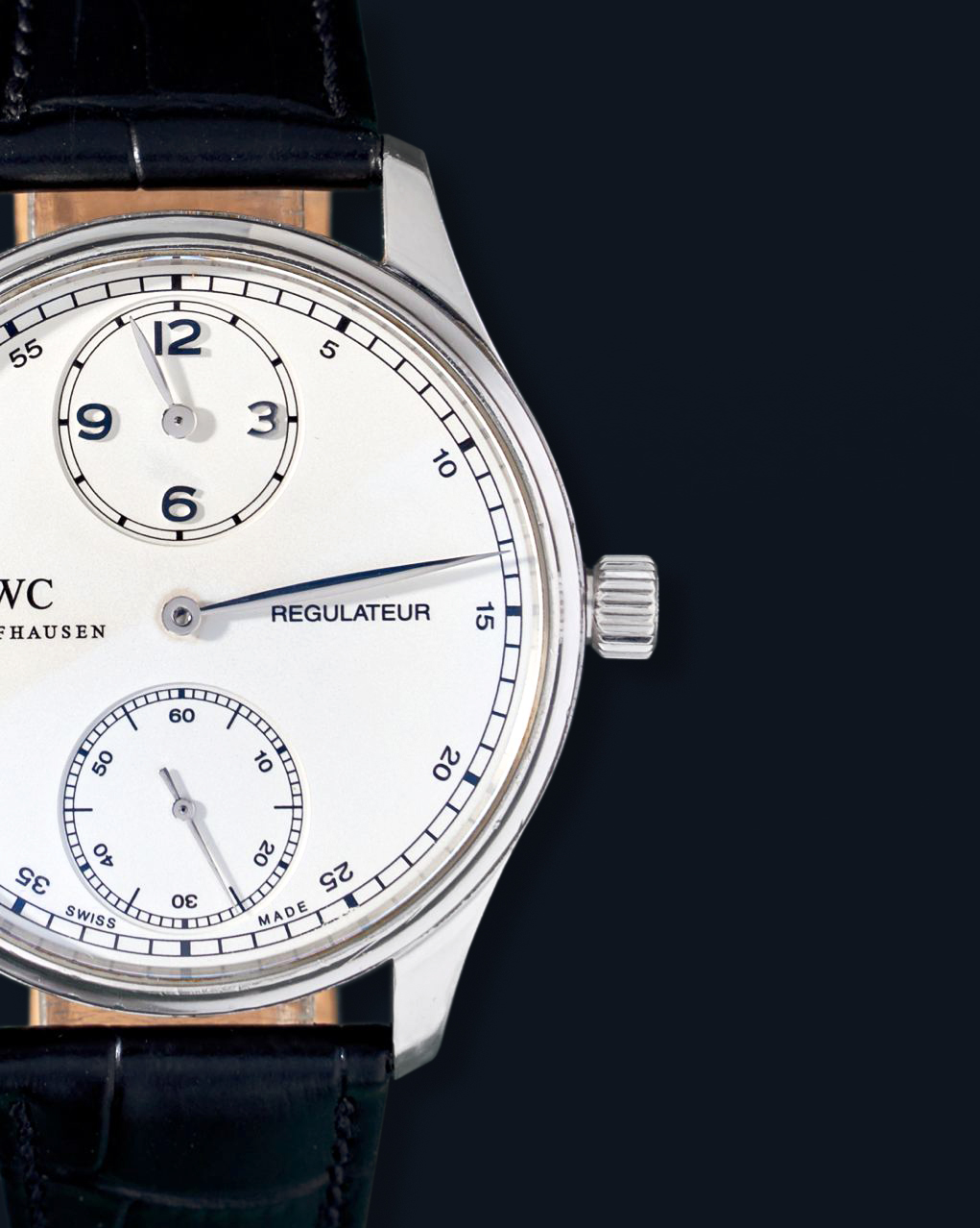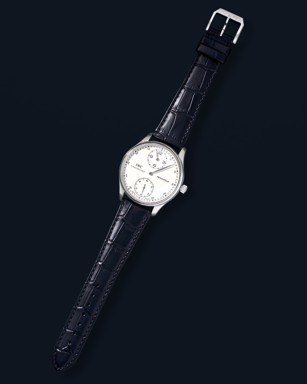 DialWhite regulator dial, signed “IWC Schaffhausen Regulateur”, applied polished Arabic numerals, outer ‘railway’ minute track, polished ‘leaf’ hour hand at 12 o’clock on recessed sub-dial, polished ‘leaf’ central minute hand, recessed small seconds sub-dial at 6 o’clock