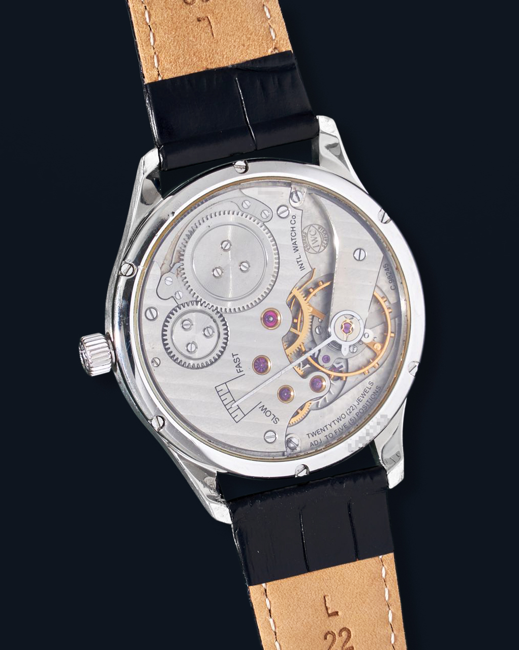 MovementHand-wound mechanical “Jones caliber” movement, signed “Intl Watch Co.”, rhodium plated bridges and mainplate with cotes de Geneve and perlage, elongated index pointer, engraved and black filled inscriptions, functions: hours, minutes, seconds