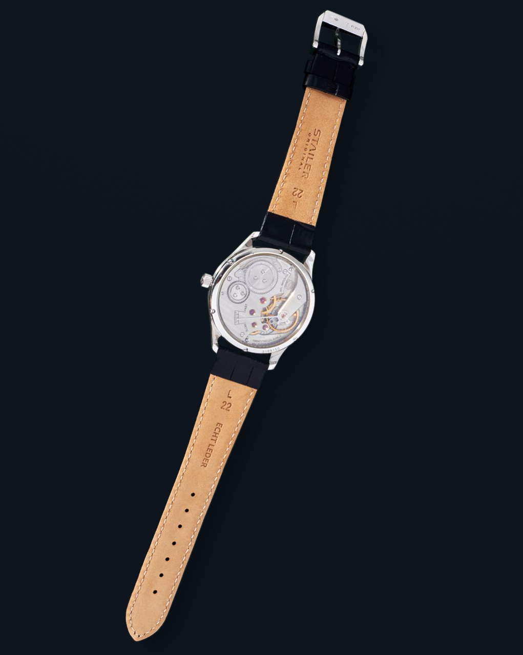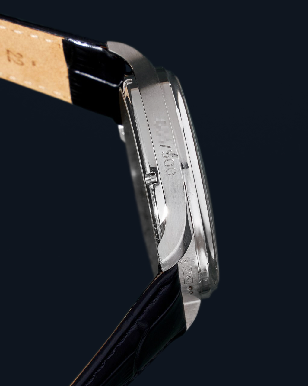 CaseRound case in platinum 950, polished, fixed bezel in platinum 950, polished, exhibition caseback fixed on 6 screws, with case number, winding crown with embossed IWC Probus Scafusia emblem at 3 o’clock, engraved limited-edition number on the caseband at 9 o’clock