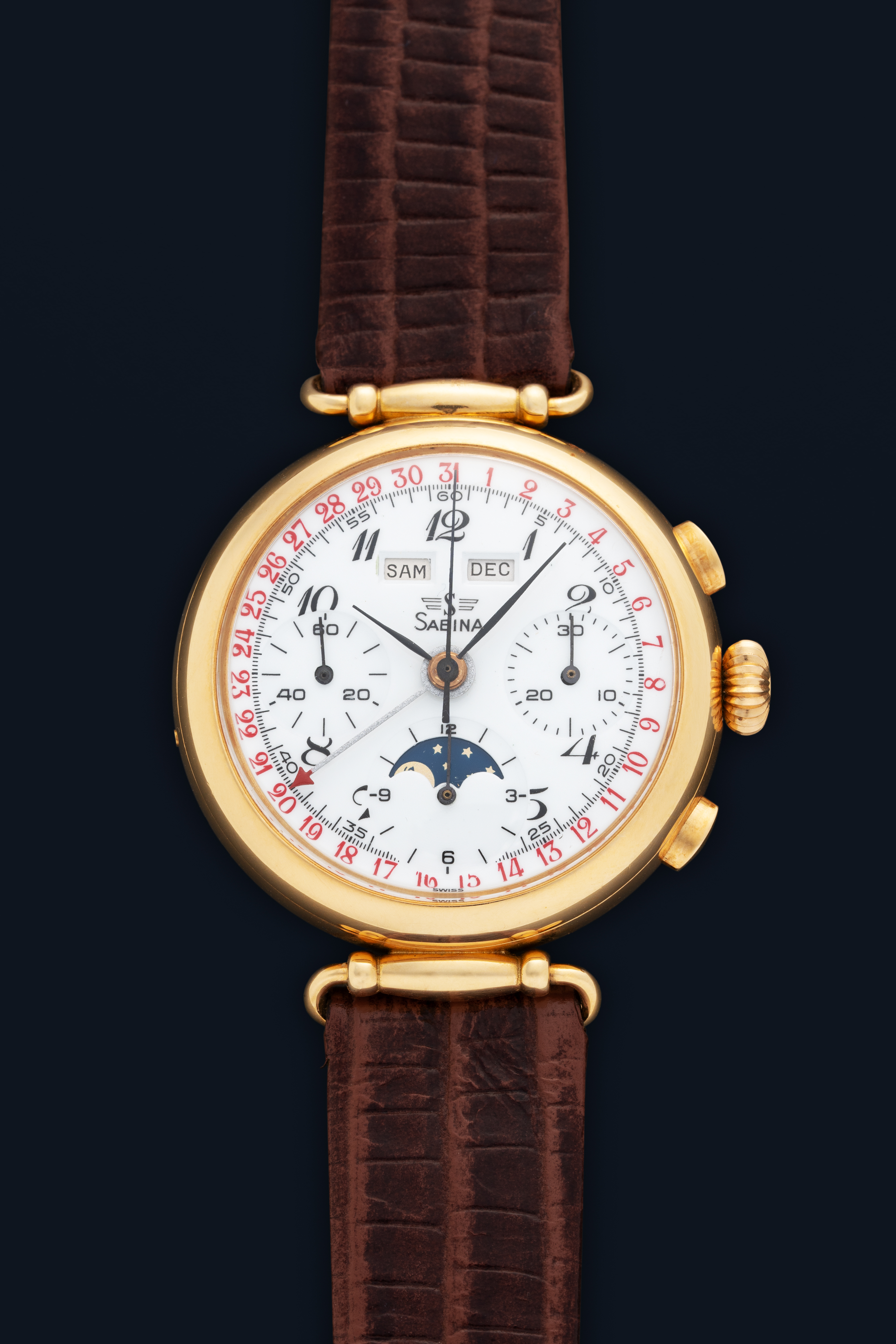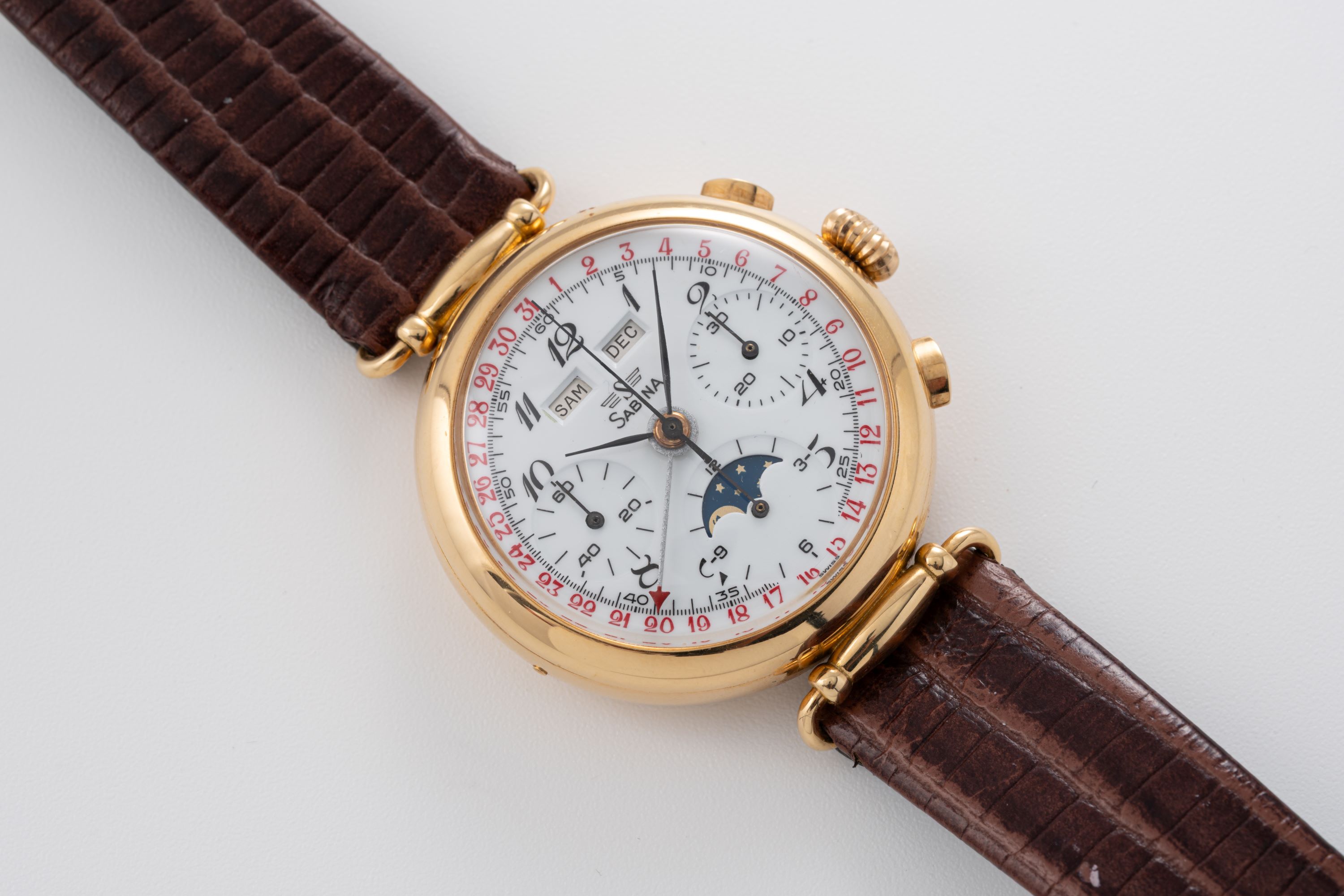DialWhite enamel dial with red accents, black leaf hands, printed numerals, peripheral pointer date, day and month windows at 12 o'clock, moonphase at 6 o'clock, small seconds at 9 o'clock, 30 minute chronograph counter at 3 o'clock, signed 'Sabina' at 12 o'clock