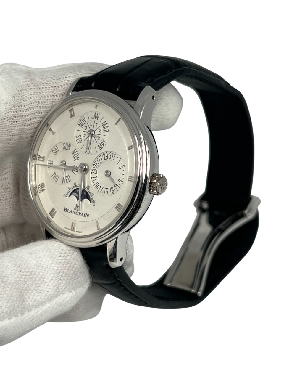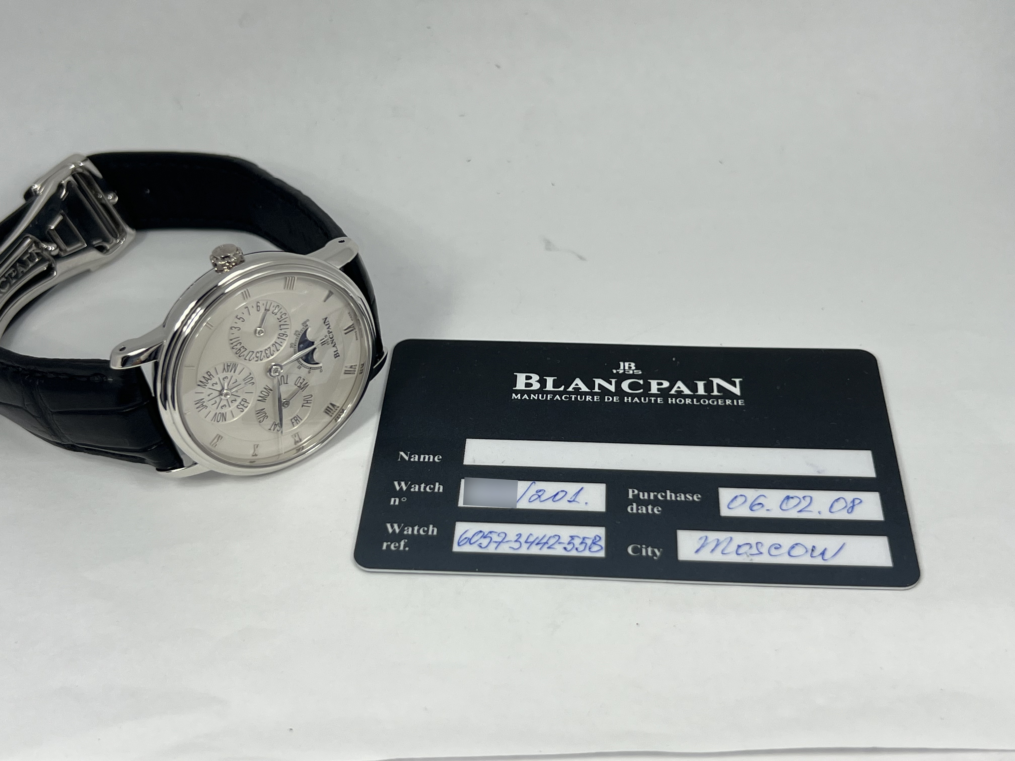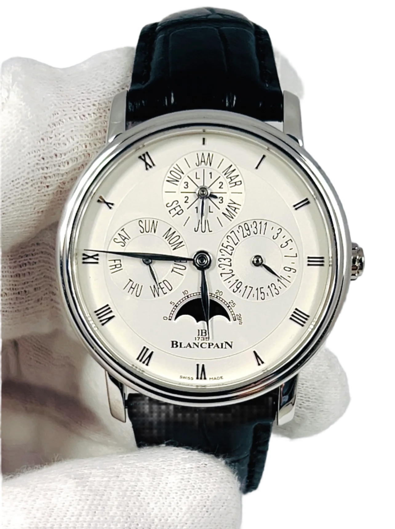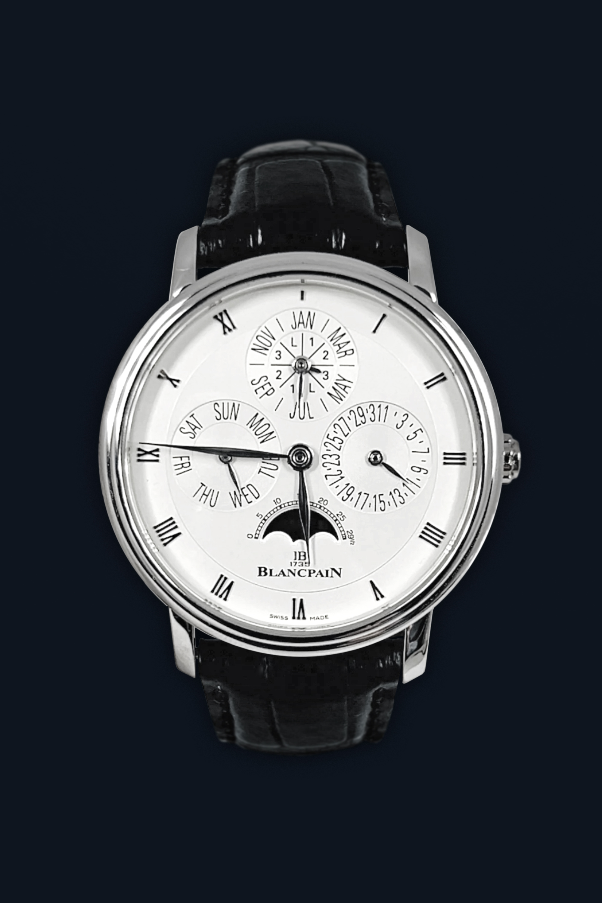 DialWhite dial, signed ‘Blancpain’, applied Roman numerals, subdials of date at 3 o’clock, weekday at 9 o’clock, month and leap year at 12 o’clock, moonphase at 6 o’clock