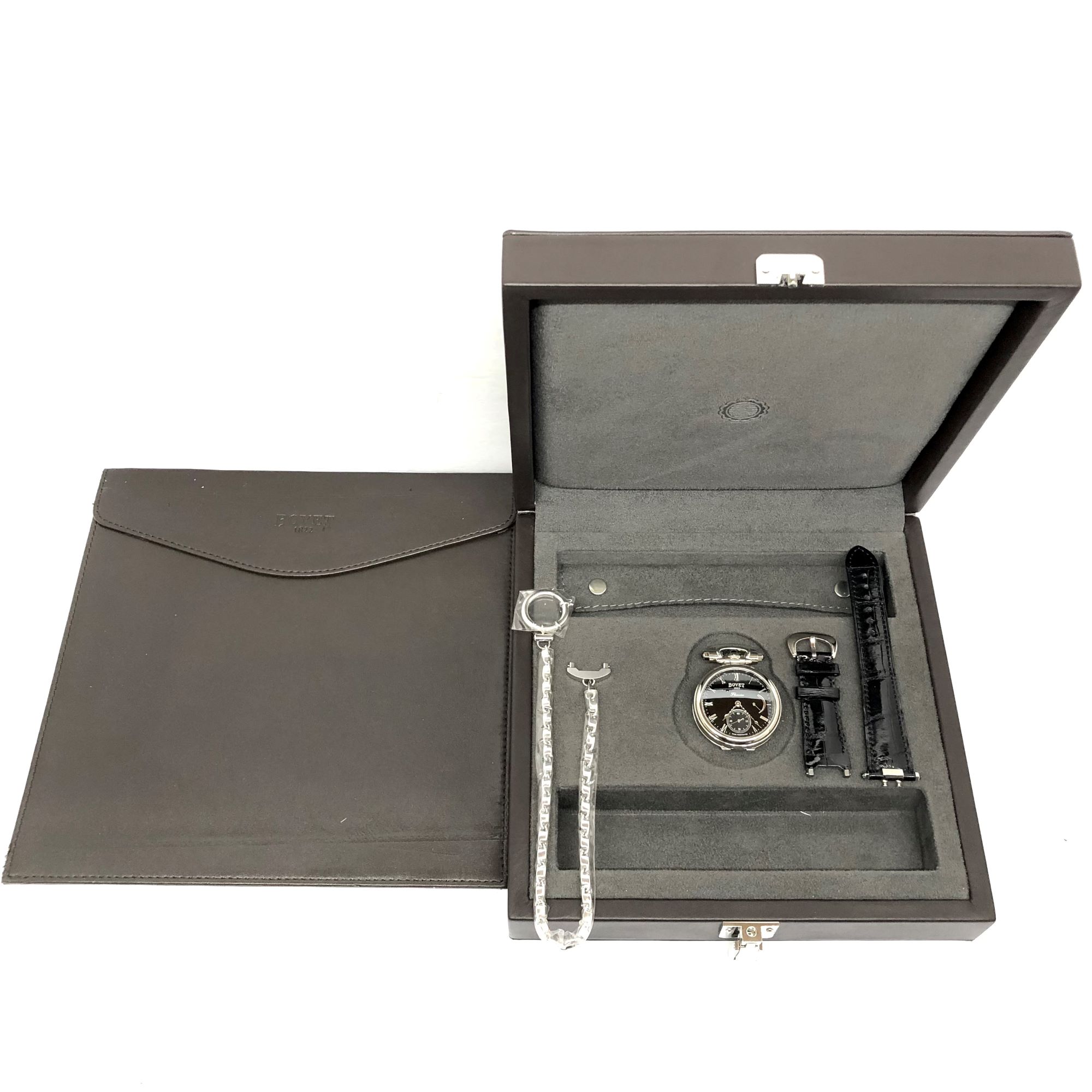 CaseRound case in 18k white gold, polished, convertible to pocket watch and small travel clock, fixed bezel in 18k white gold, exhibition caseback, winding crown at 12 o’clock with sapphire cabochon, upper lug of pocket watch ring type, strap attachments with hexagonal screw heads and sapphire cabochons
