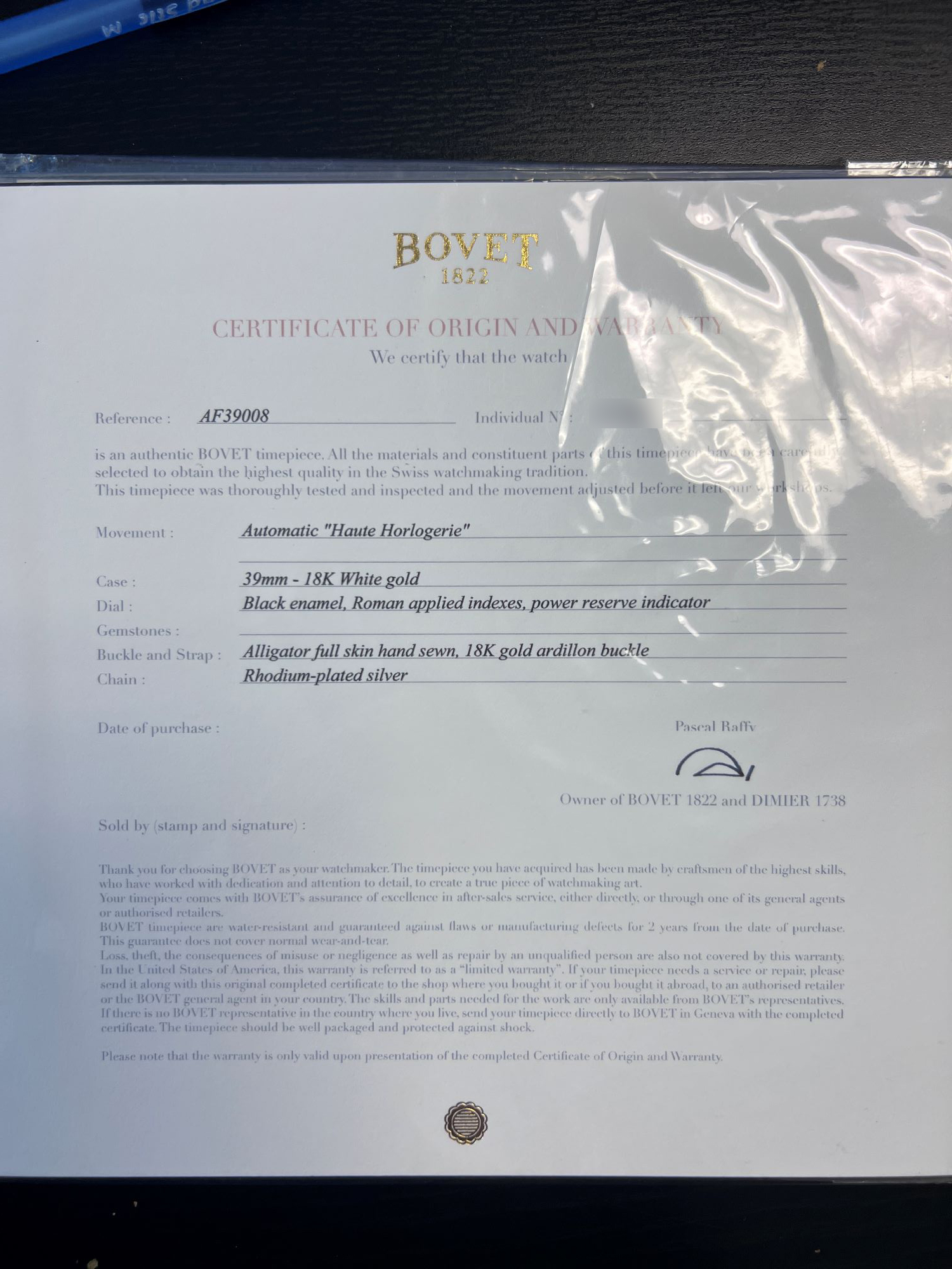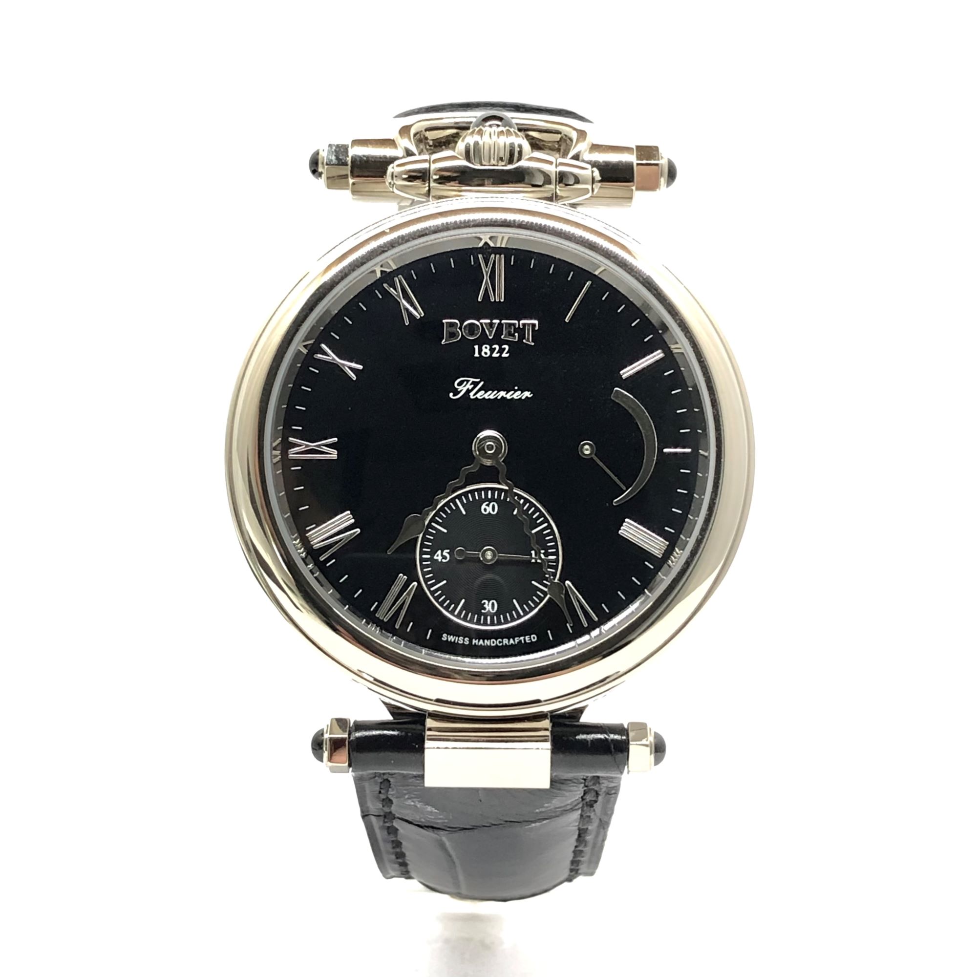 DialBlack enamel dial, signed ‘Bovet 1822 Fleurier’, ‘serpentine’ hour and minute hands, applied Roman numerals, small seconds a5t 6 o’clock, power reserve at 3 o’clock
