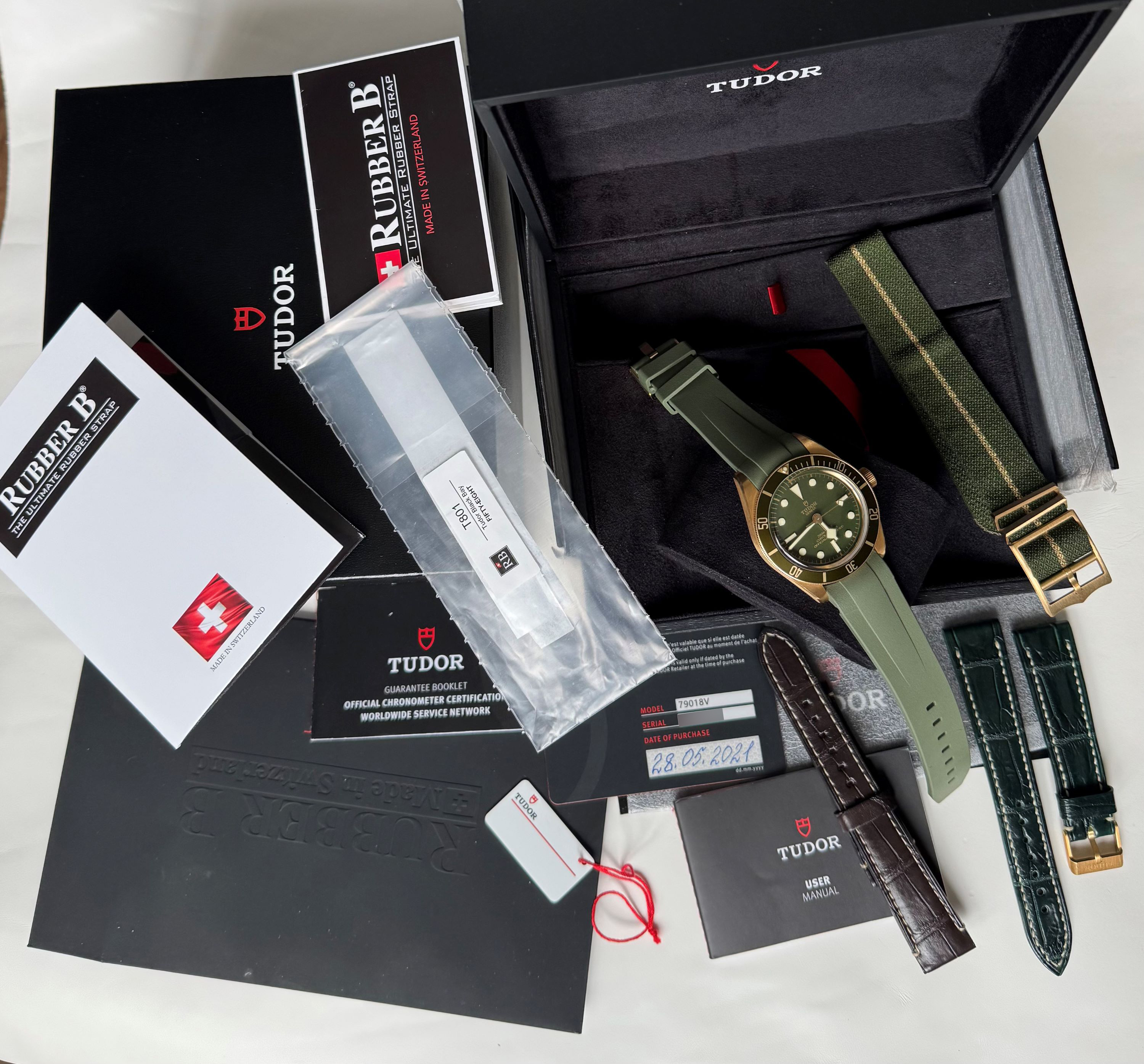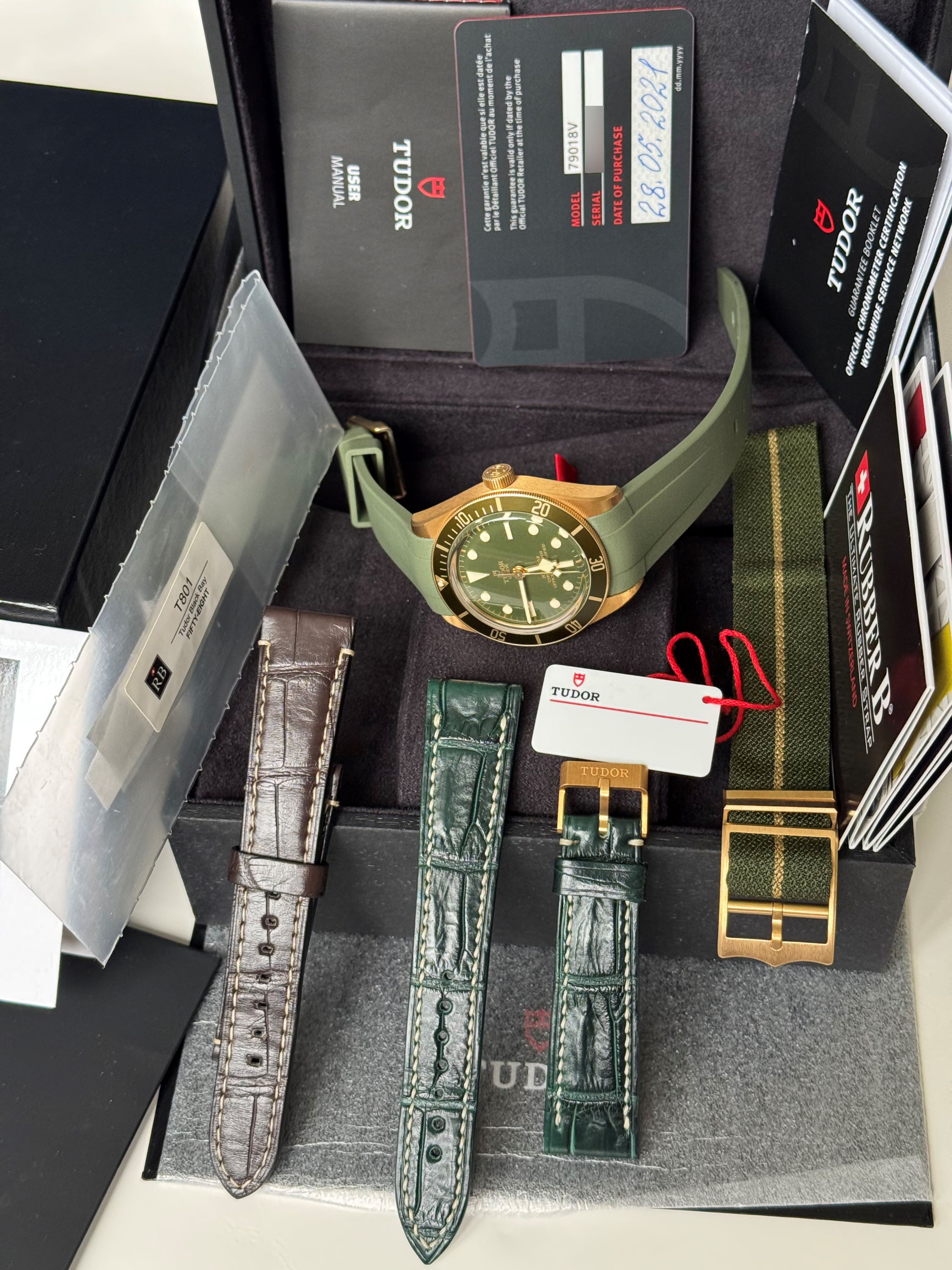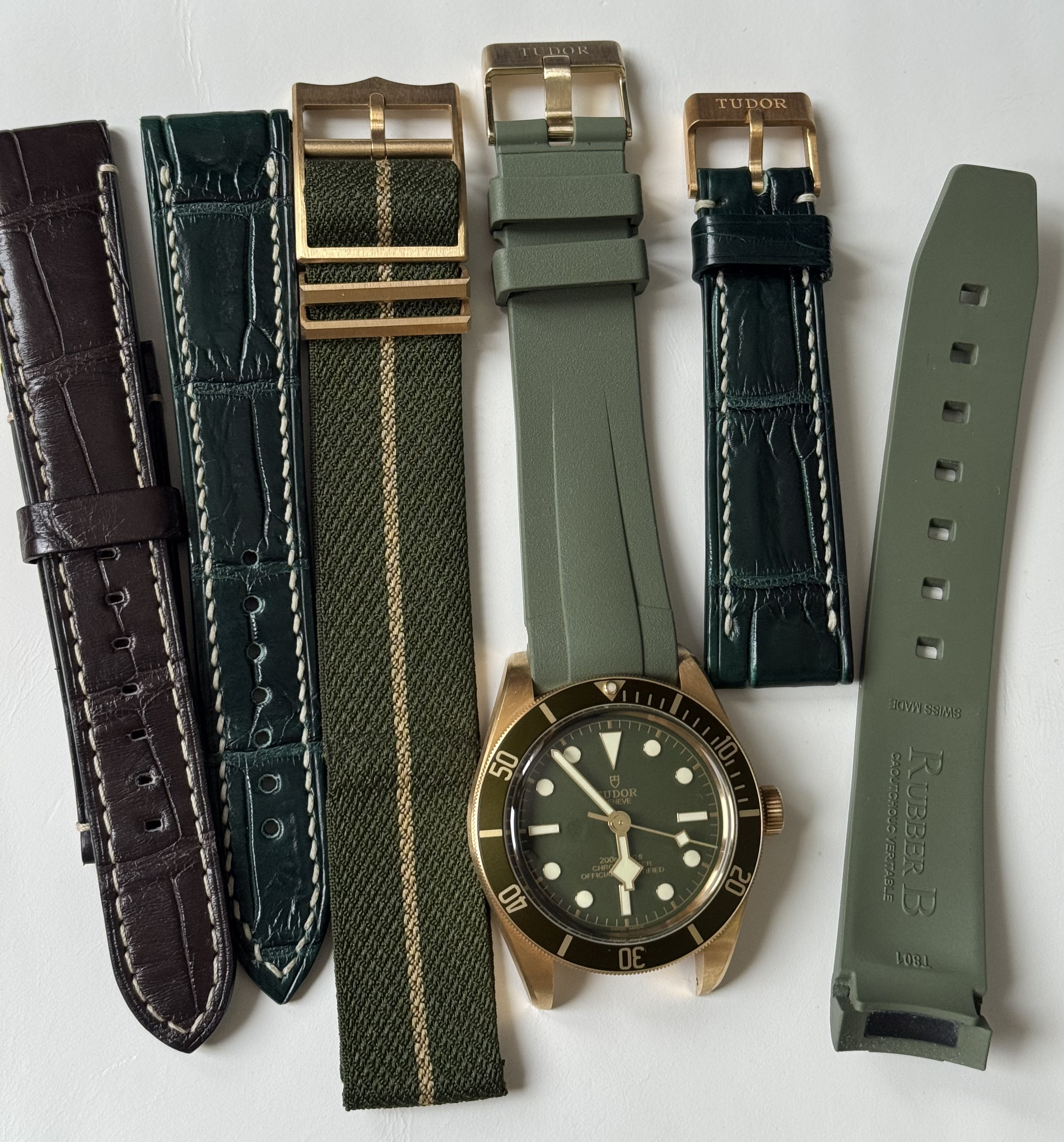 AccessoriesOriginal Brown alligator strap with 16 mm original pin buckle in 18k yellow gold signed ‘Tudor’, original NATO strap with 18k yellow gold loops and buckle, custom green alligator strap.