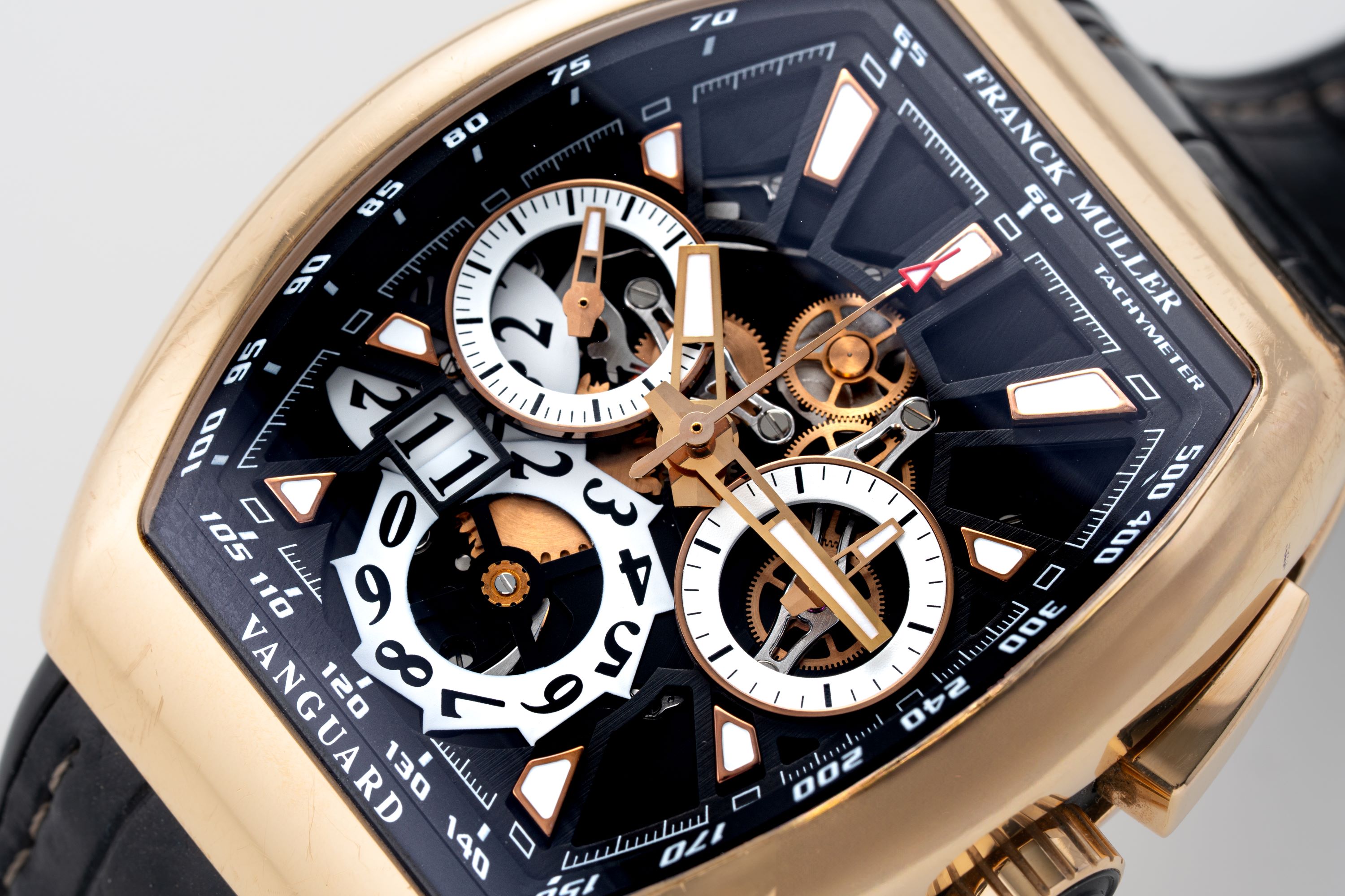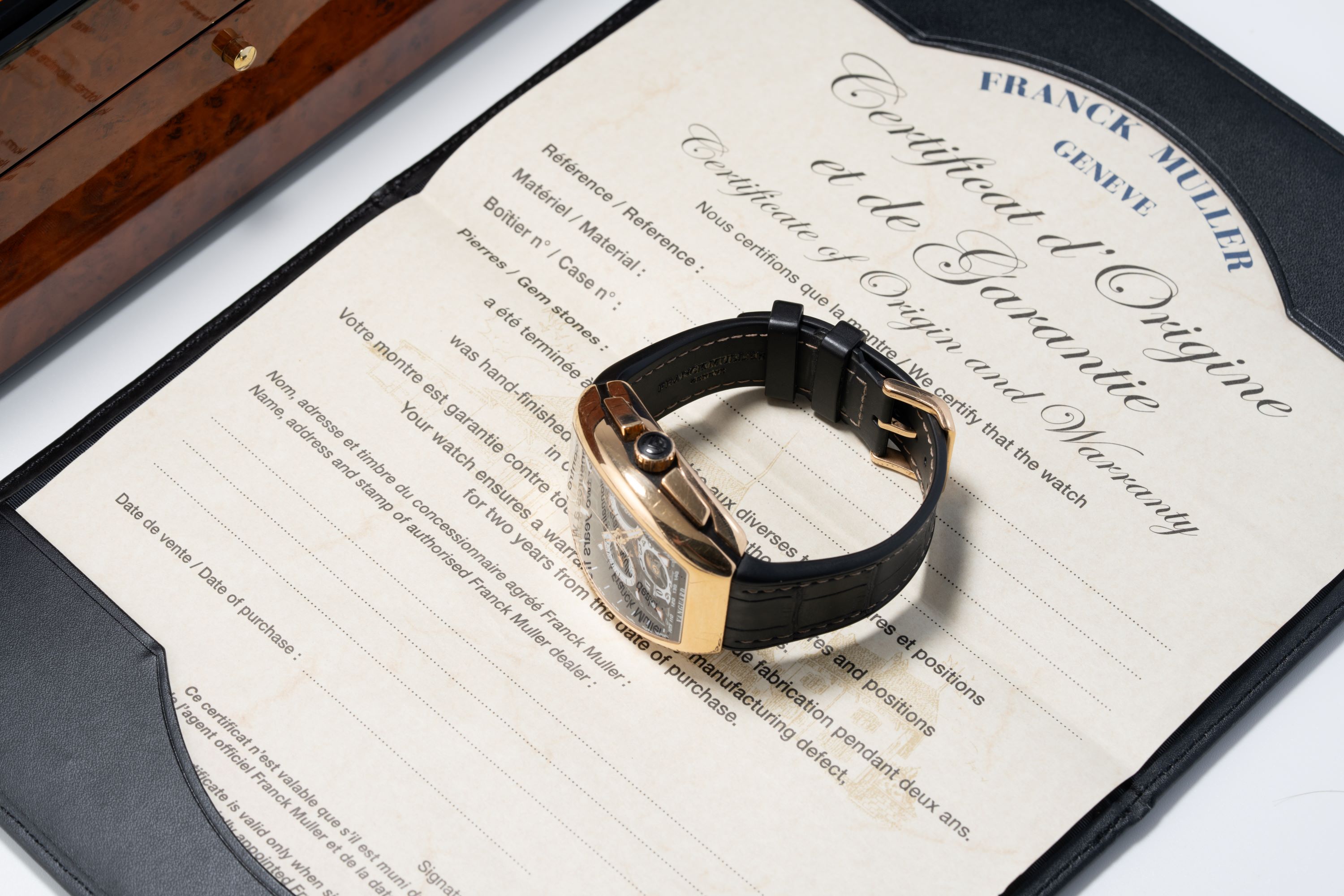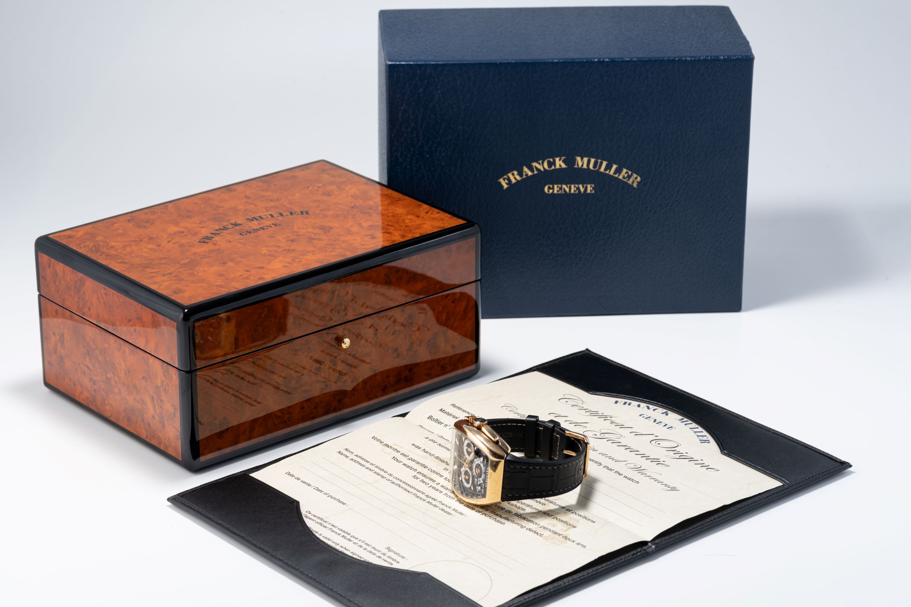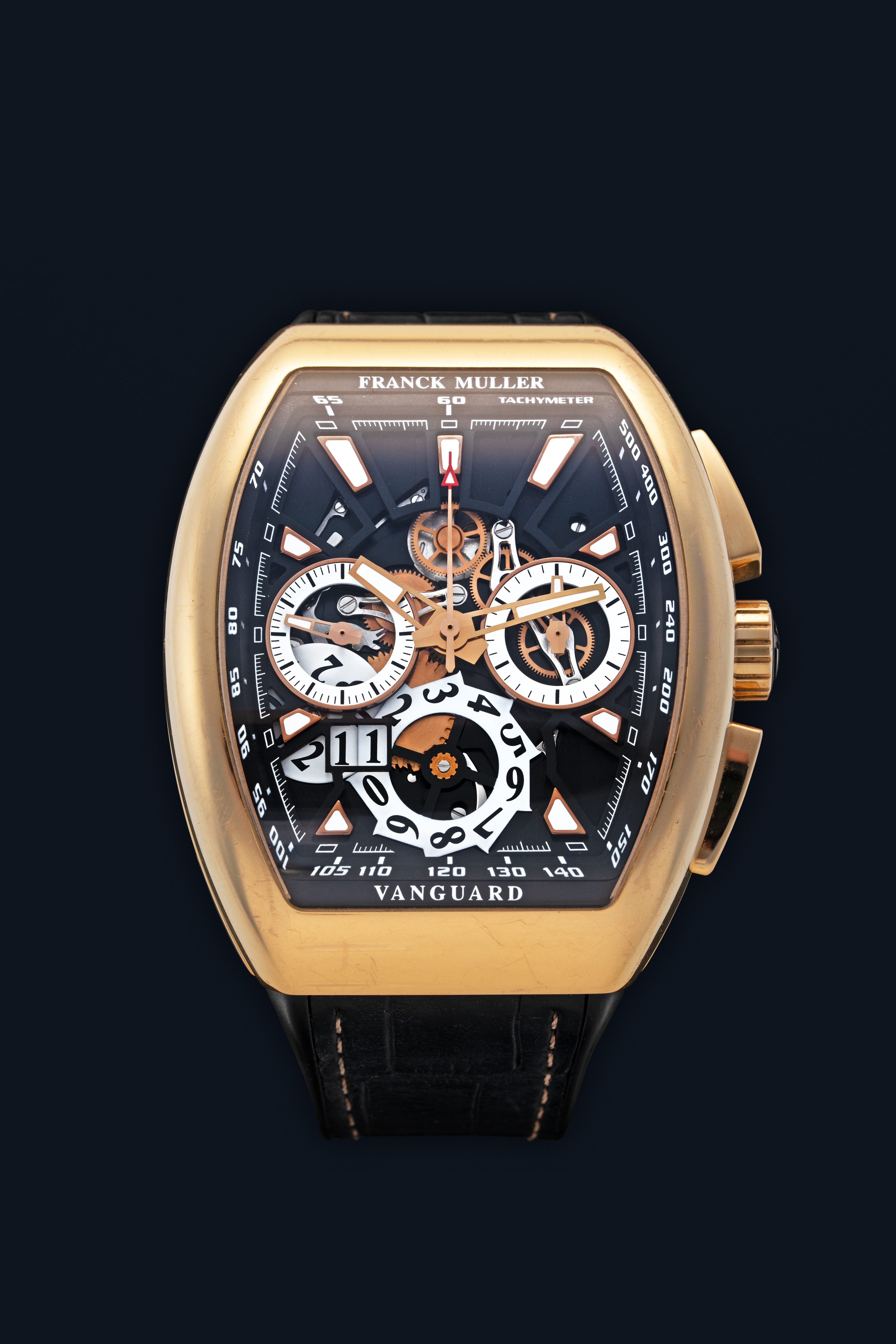 DialSkezeltonized dial with applied luminous indices, rose gold hands, côtes de Genève on bridge plate, small seconds at 9 o'clock, 30 minute chronograph counter at 3 o'clock, big date under the 9 o'clock subdial, signed 'Franck Muller' at 12 o'clock