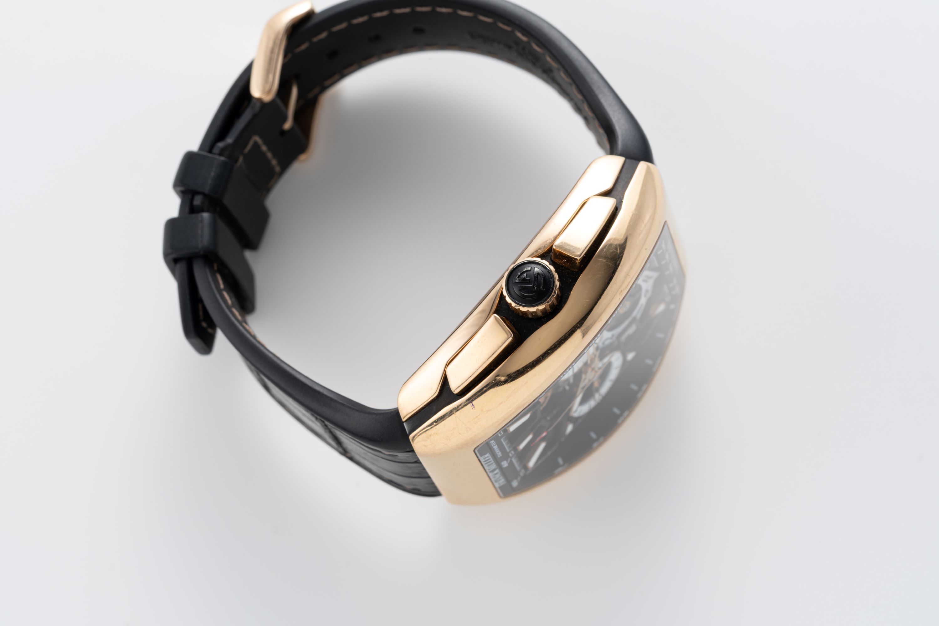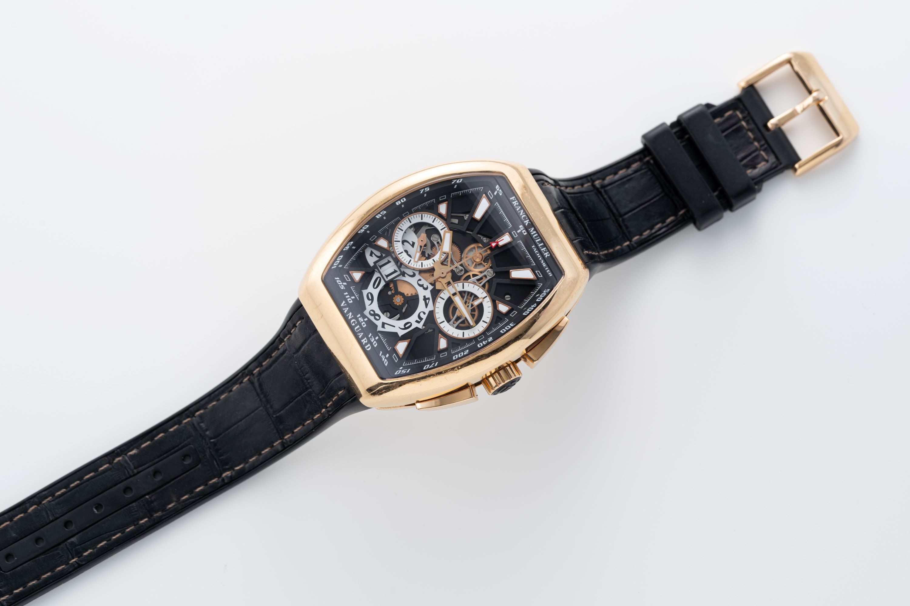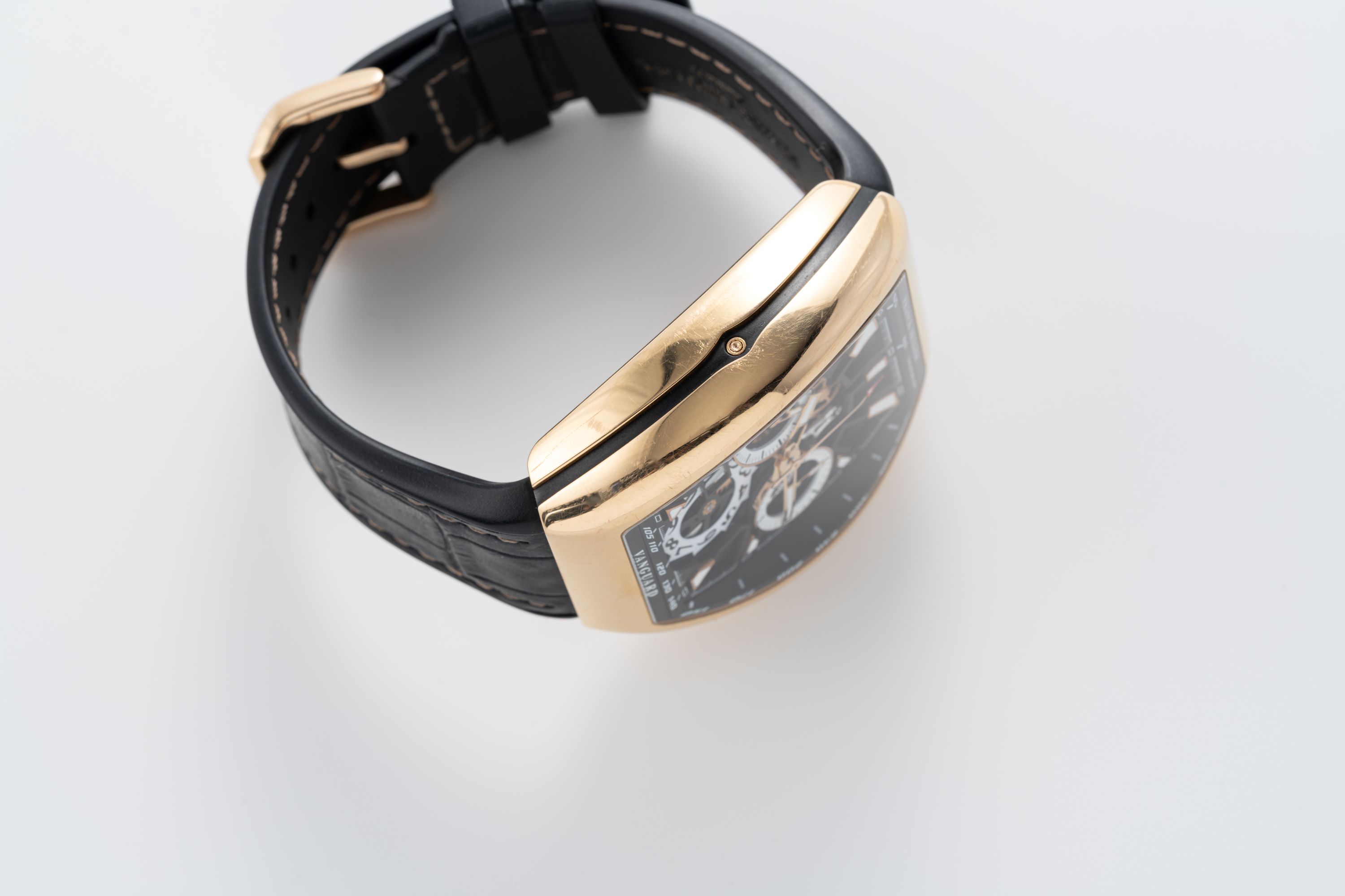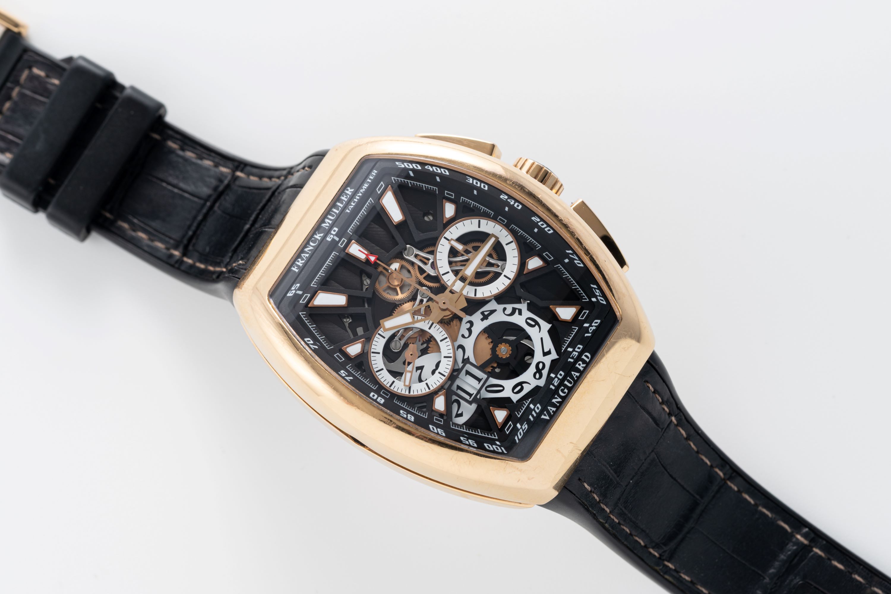 DialSkezeltonized dial with applied luminous indices, rose gold hands, côtes de Genève on bridge plate, small seconds at 9 o'clock, 30 minute chronograph counter at 3 o'clock, big date under the 9 o'clock subdial, signed 'Franck Muller' at 12 o'clock
