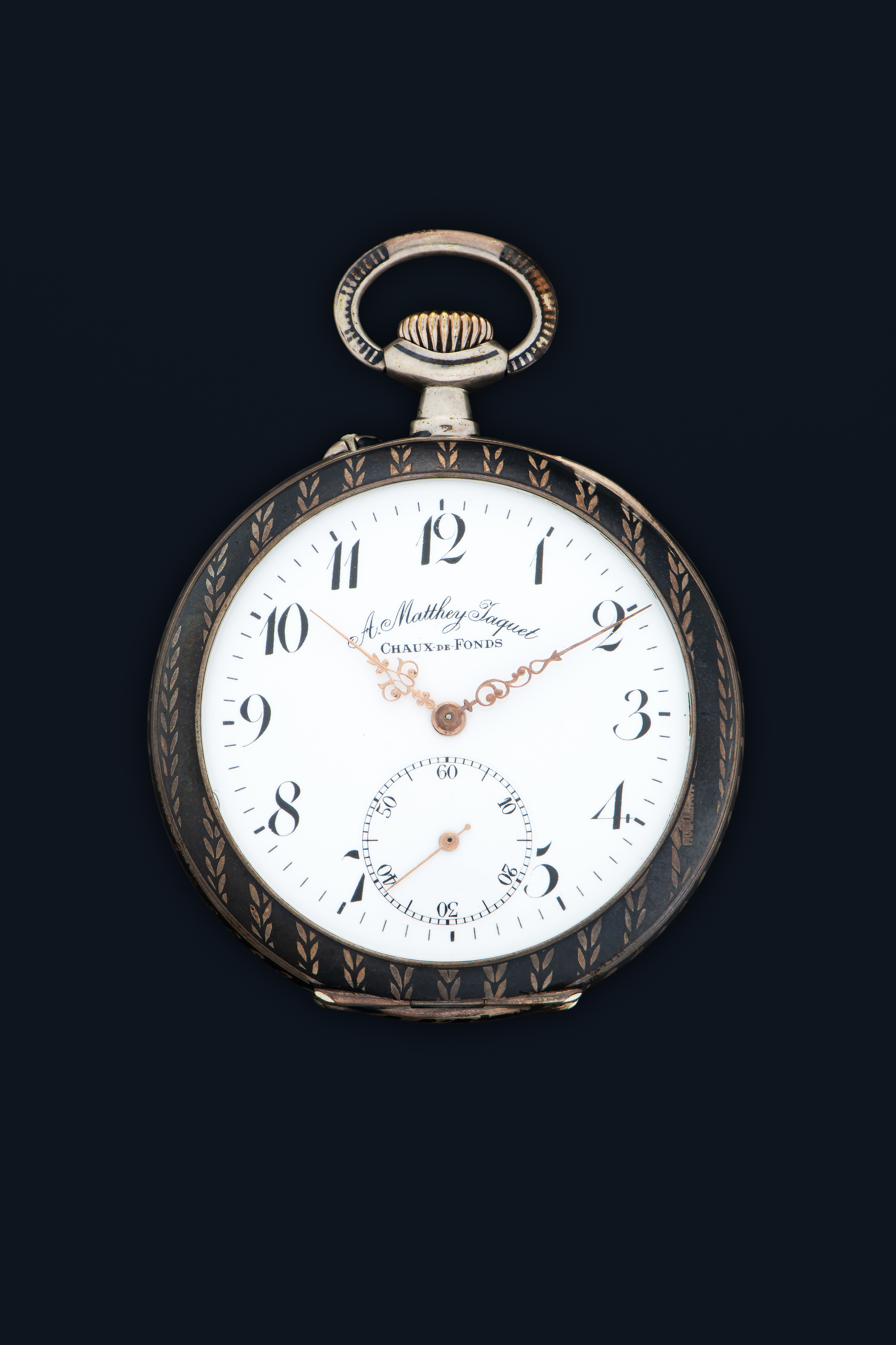 DialWhite enamel dial with arabic numerals, ornate hands, small seconds at 6 o'clock, signed 'A. Matthey Jaquet' at 12 o'clock