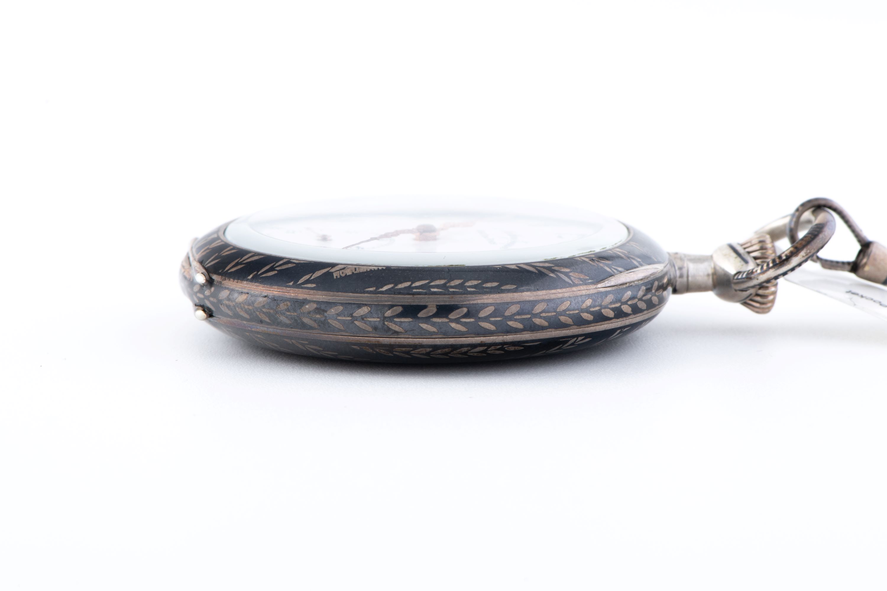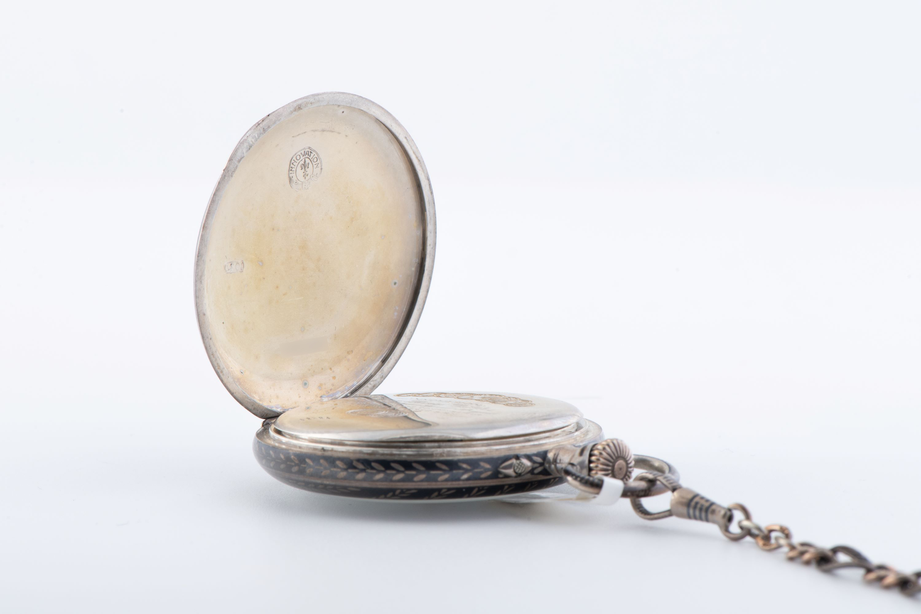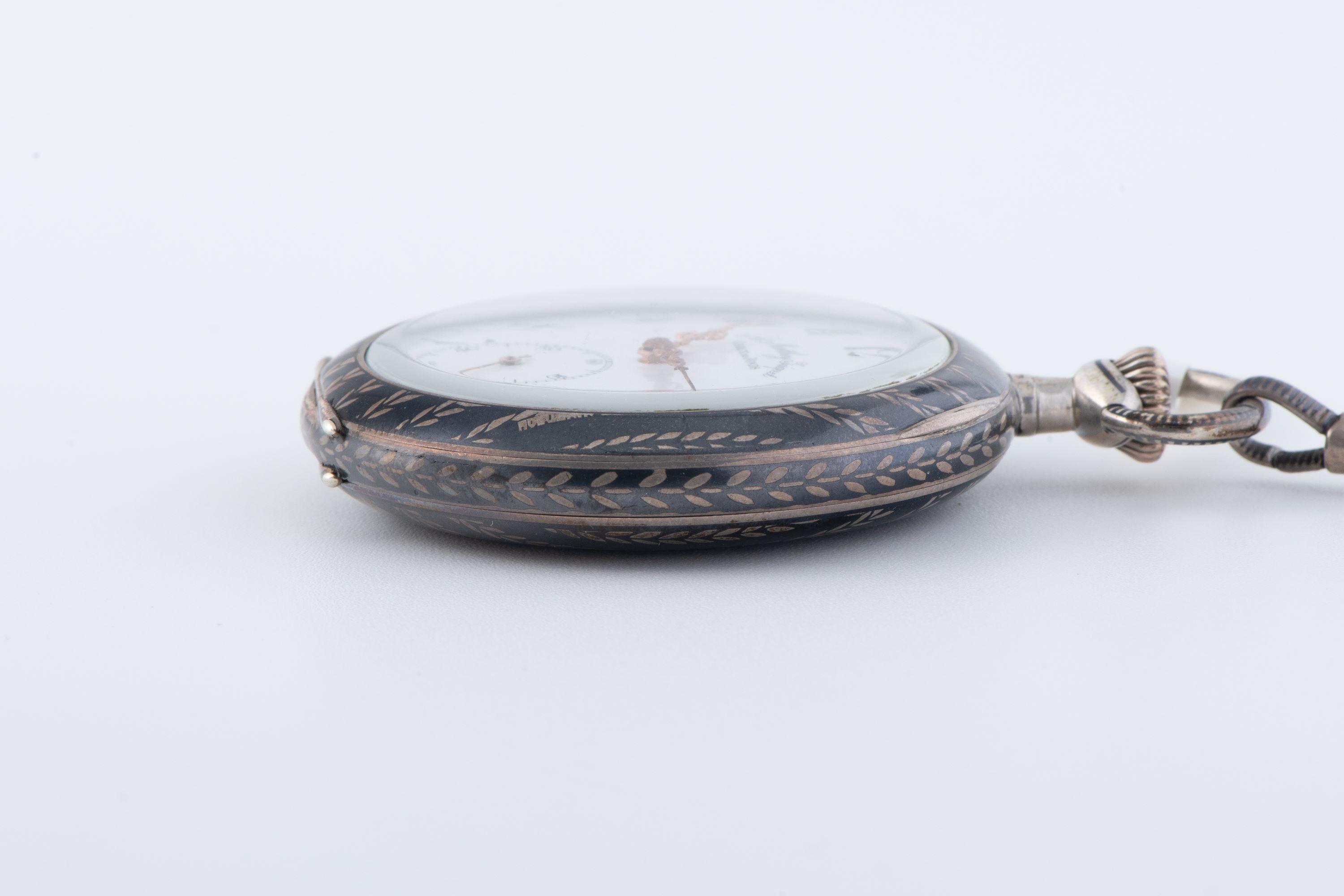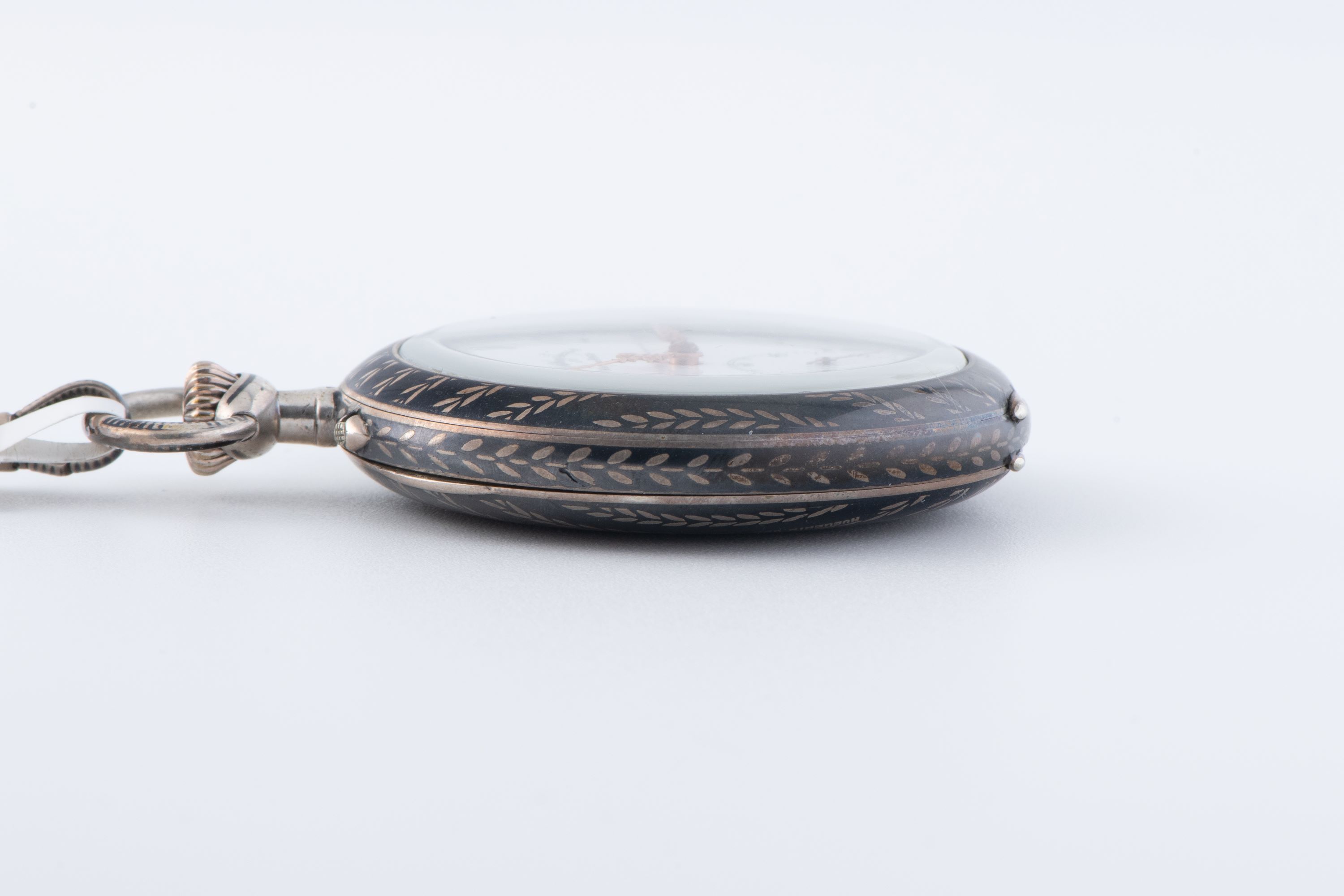 CaseRound case in silver 800, double lid caseback, chain loop and winding crown at 12 o'clock, tula silver inlays around the case