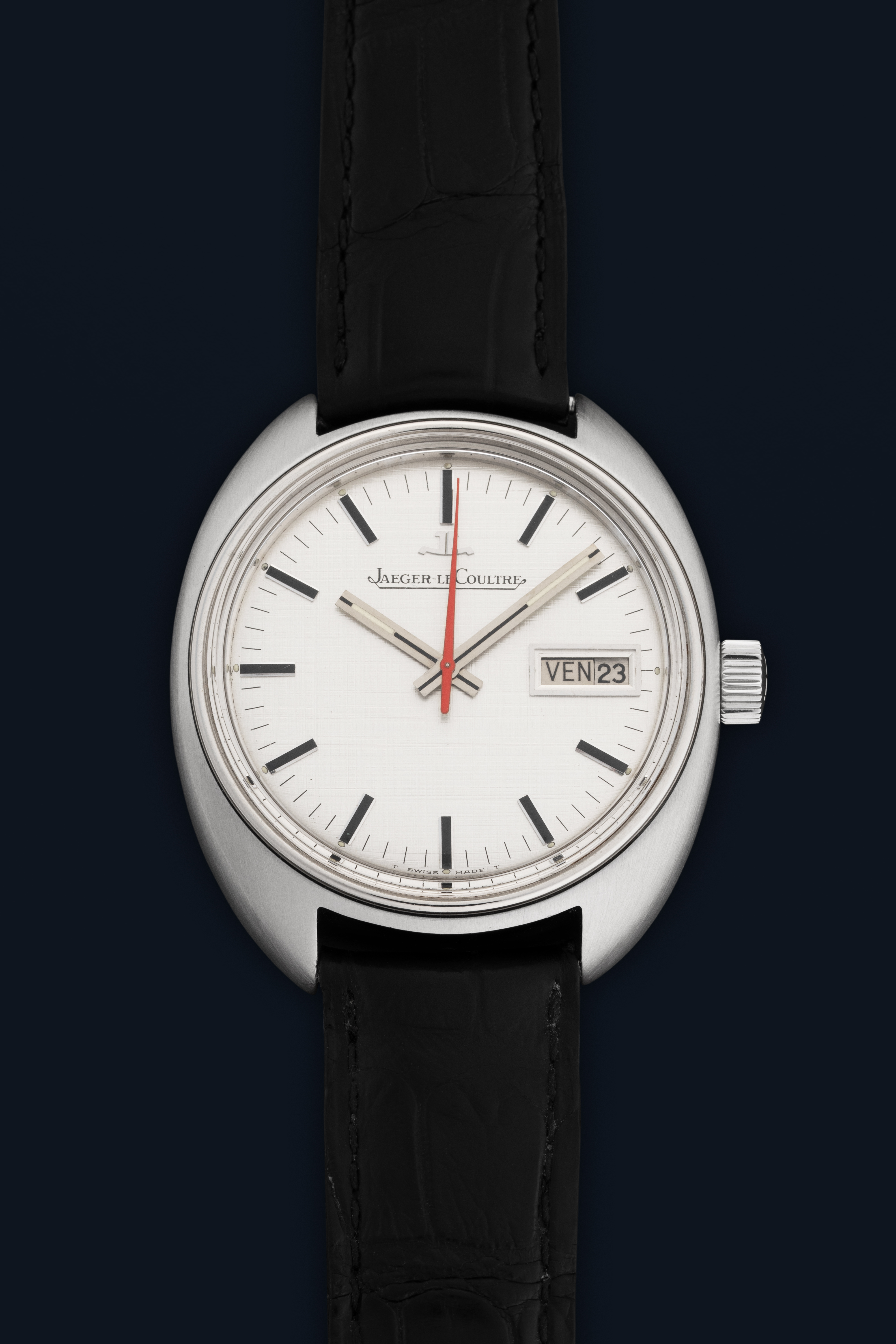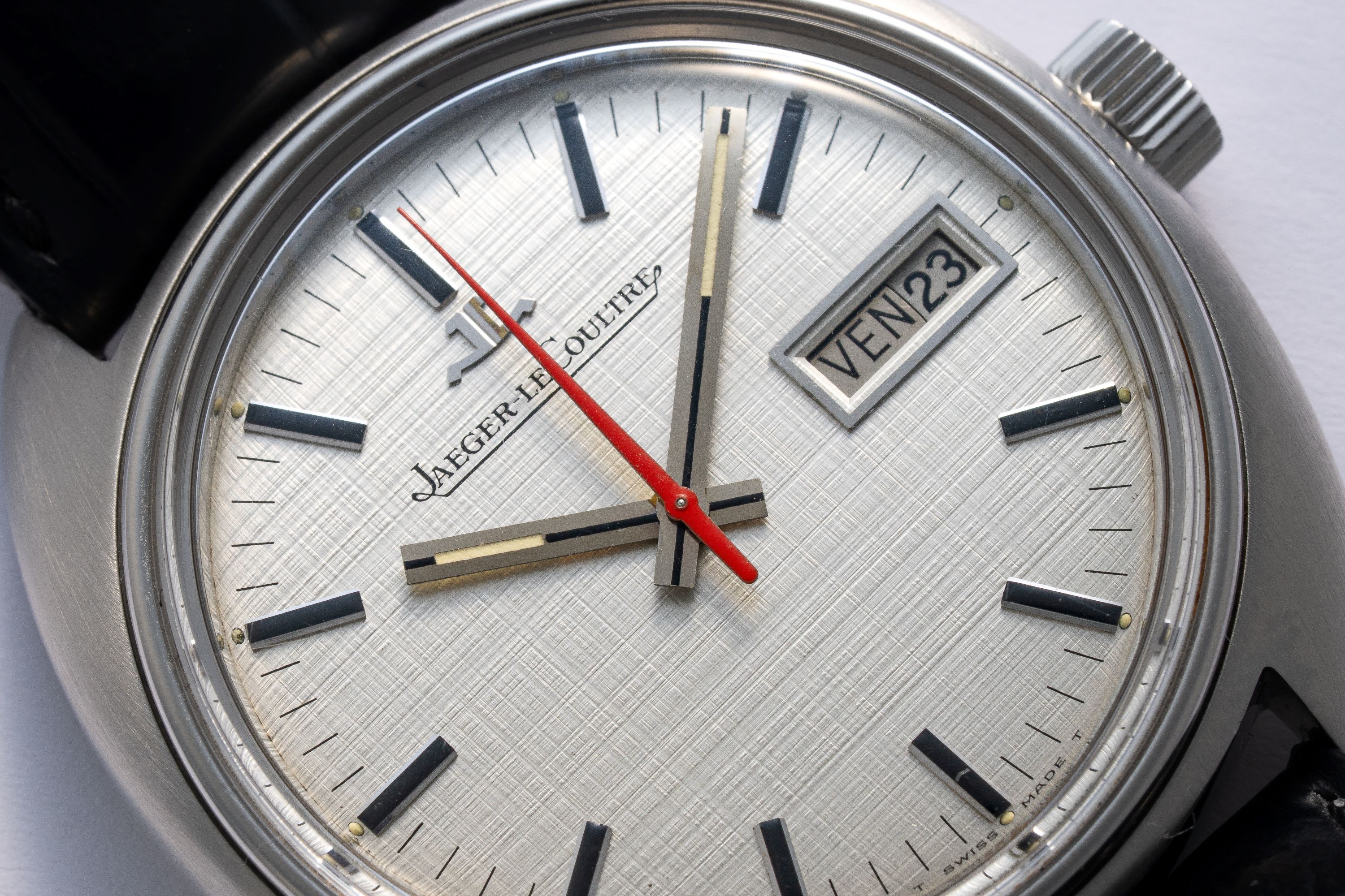 DialSilver linen dial with applied indices, luminous hands, orange seconds hand, day and date window at 3 o'clock, signed 'Jaeger LeCoultre' at 12 o'clock